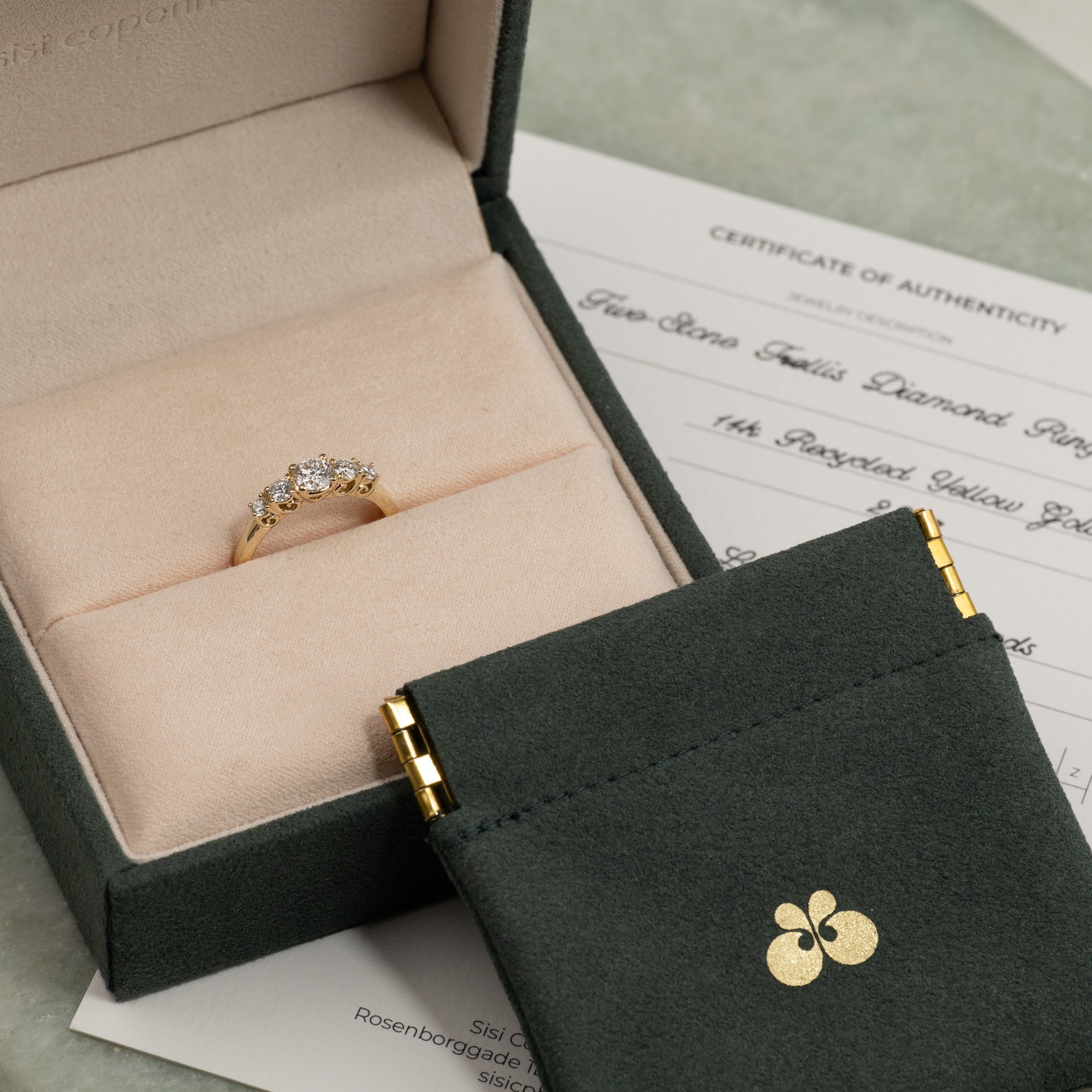 Diamanterna har färgen E/F (River) och klarheten VVS. Smycket är skapat med omtanke; diamanterna är producerade med bland annat solenergi, och guldet är 100% certifierat återvunnet.