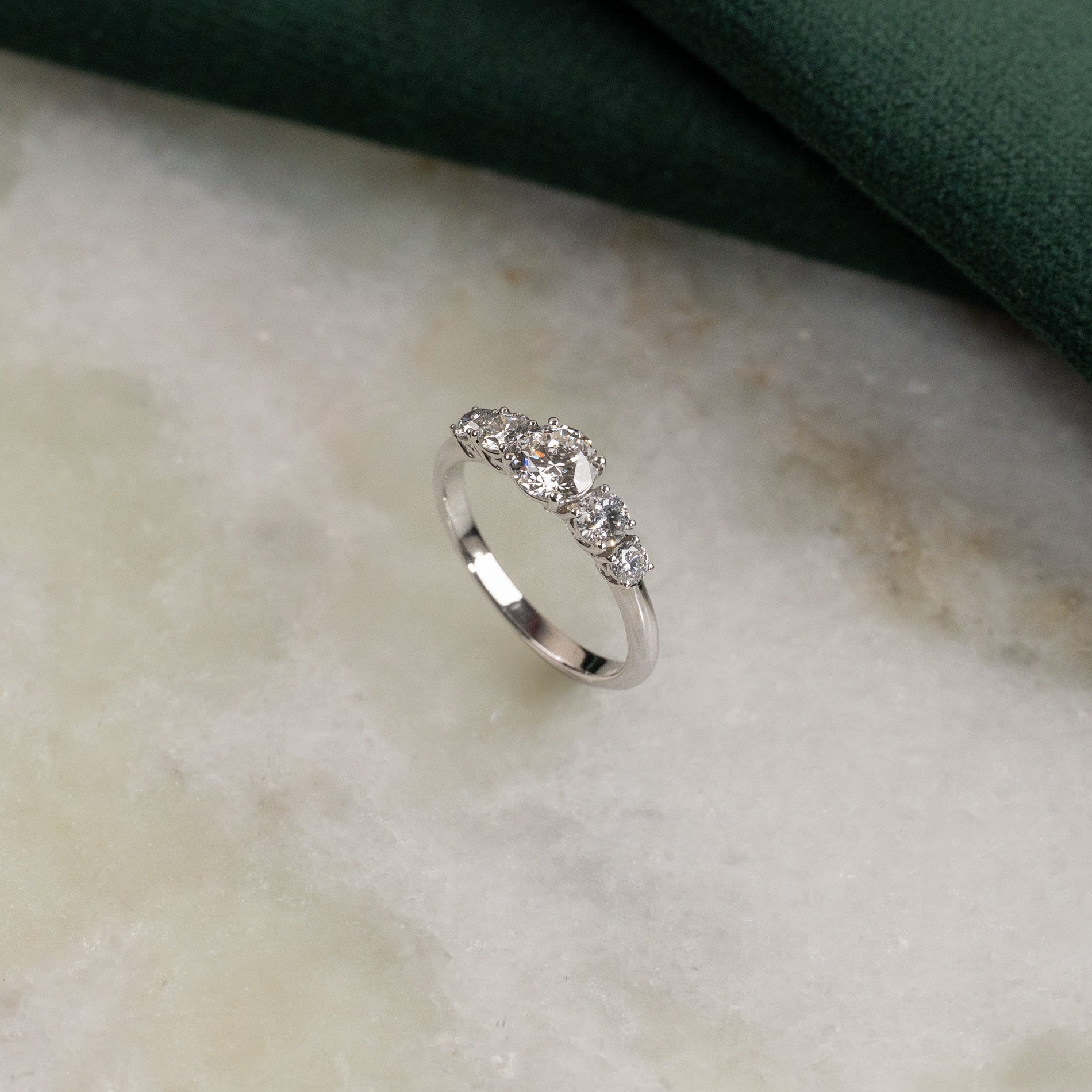 Ringen är tillverkad i 14 karat vitguld med fem labbodlade diamanter på totalt 1,0 ct. Diamanterna har färggrad EF (River) och klarhet VVS. Smycket är skapat med omtanke; diamanterna är framtagna med bland annat solenergi, och guldet är 100% certifierat återvunnet.