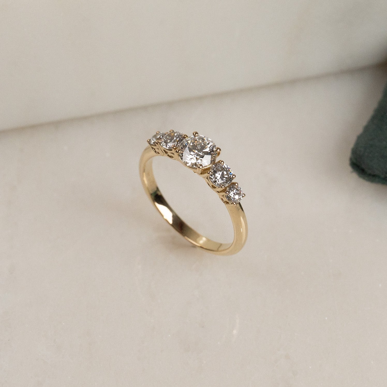 Ringen är tillverkad i 14 karat massivt guld med fem labbodlade diamanter med en totalvikt på 1,0 ct. Diamanterna har färg E/F (River) och klarhet VVS. Smycket är skapat med omtanke; diamanterna är framställda med bland annat solenergi och guldet är 100 % certifierat återvunnet.