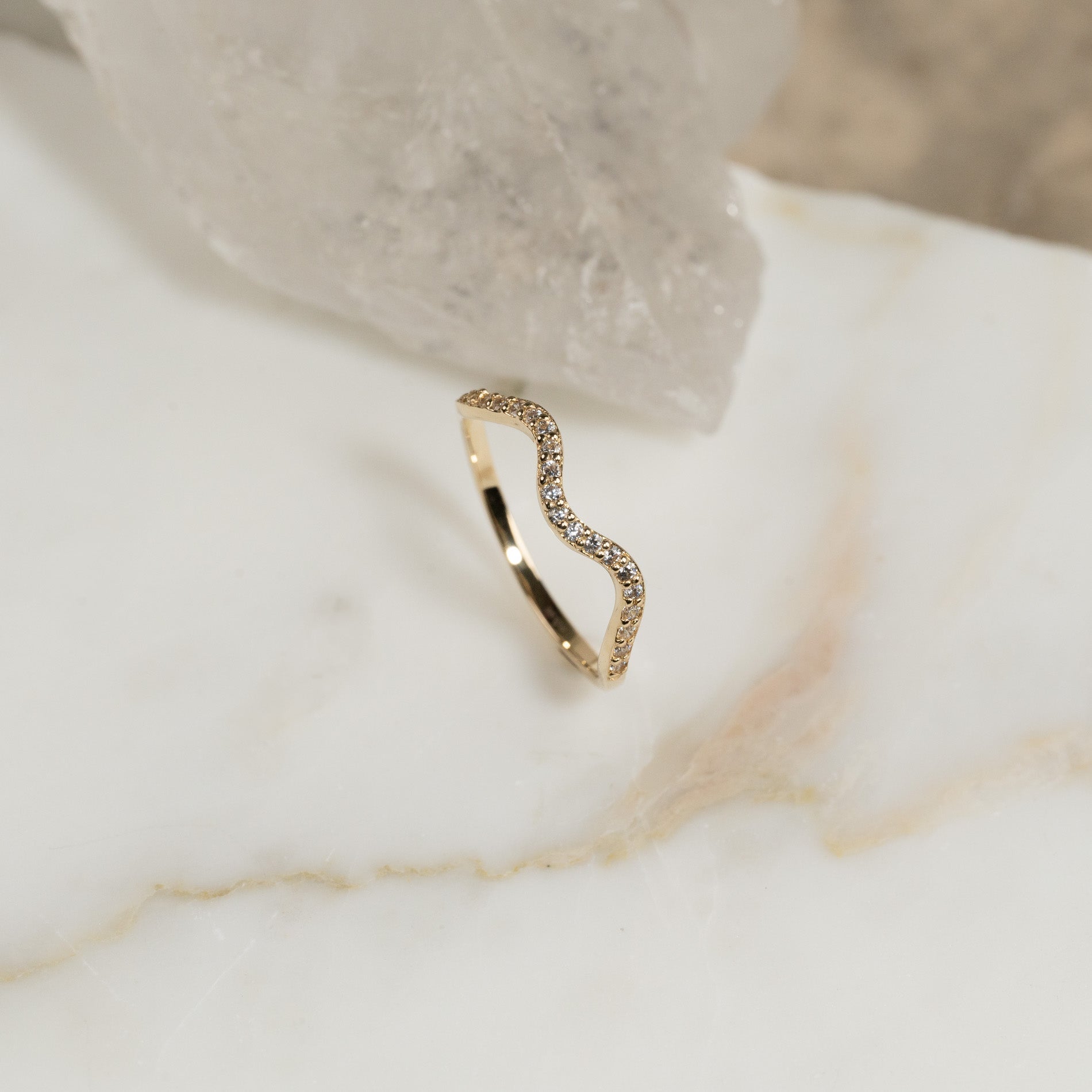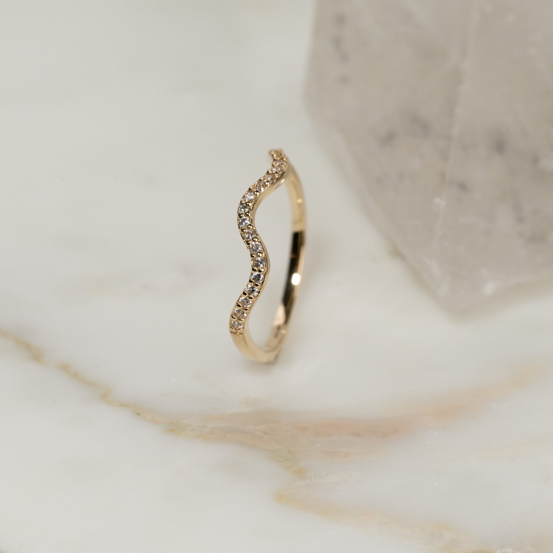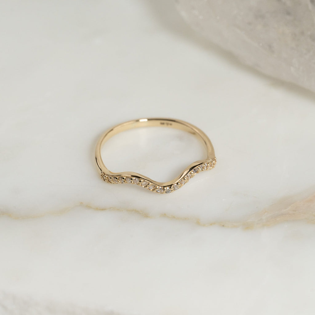 Ringen har en mjukt vågformad design och en enkel estetik som förstärks av de eleganta, klara zirkonerna längs fronten - de gnistrar vackert i ljuset och ger ringen ett feminint uttryck.