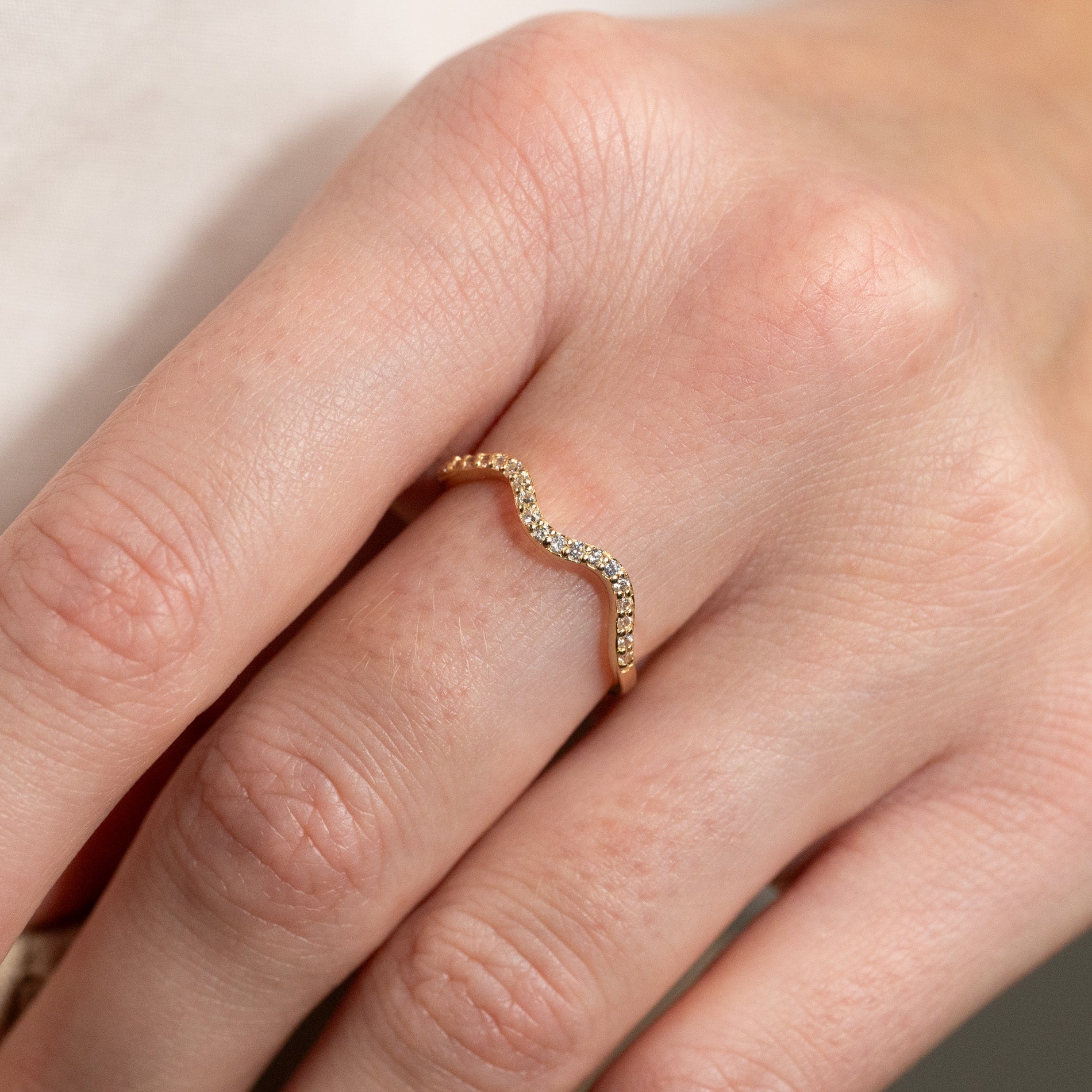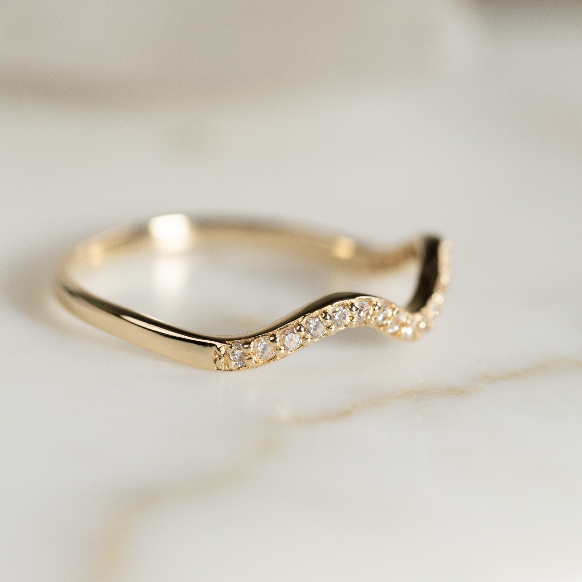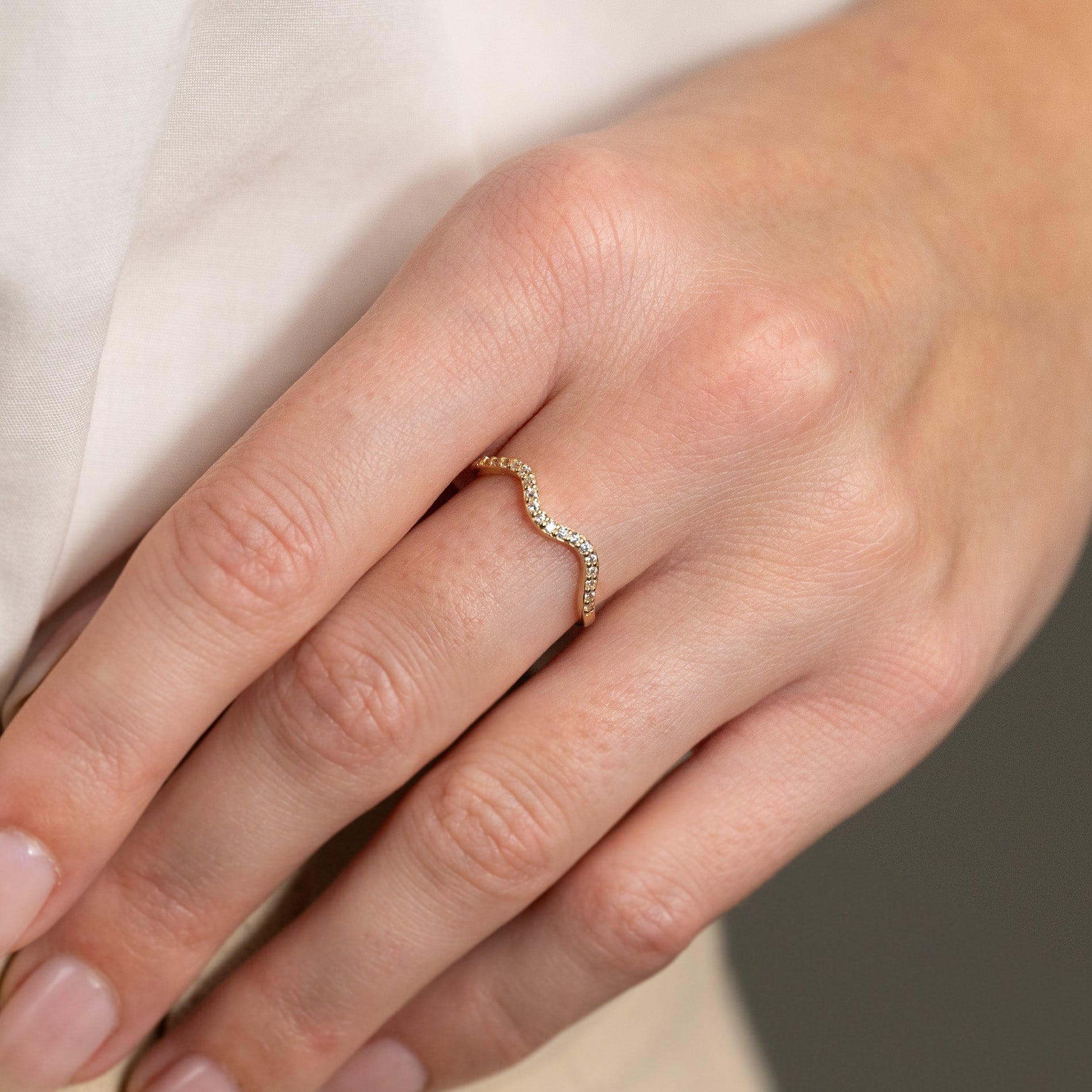 Ringen har en mjukt vågformad design och en enkel estetik som förstärks av de eleganta, klara zirkonerna längs fronten - de gnistrar vackert i ljuset och ger ringen ett feminint uttryck.