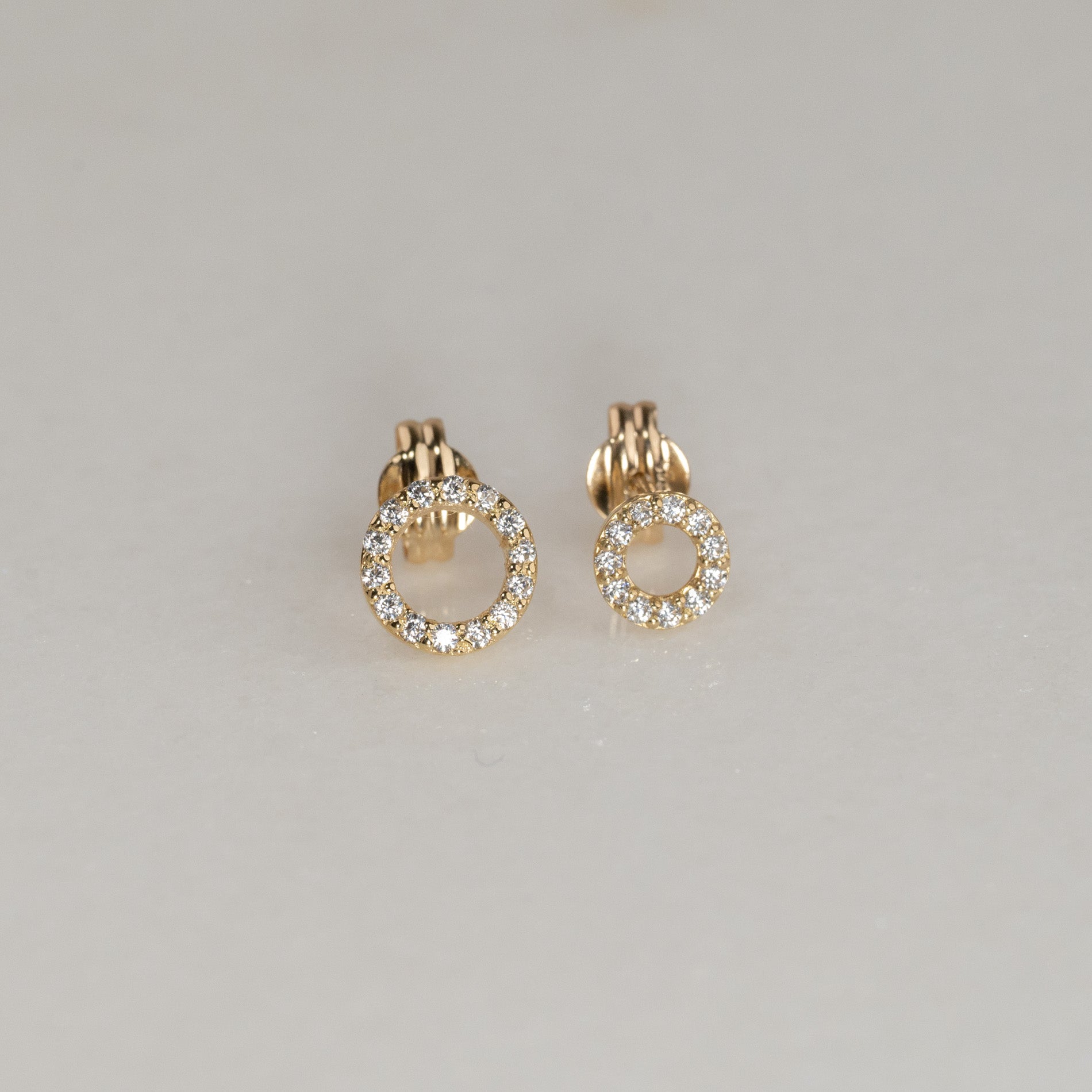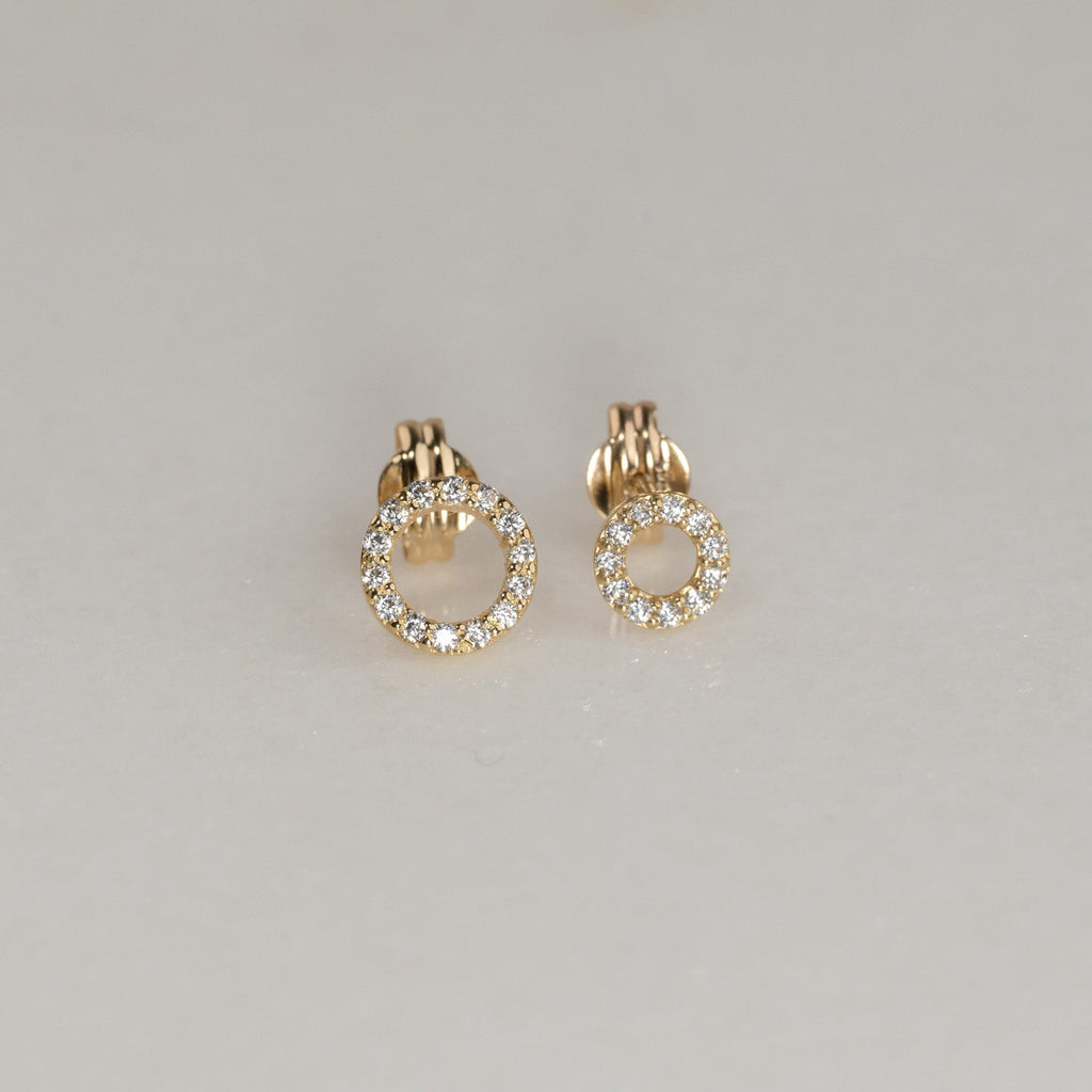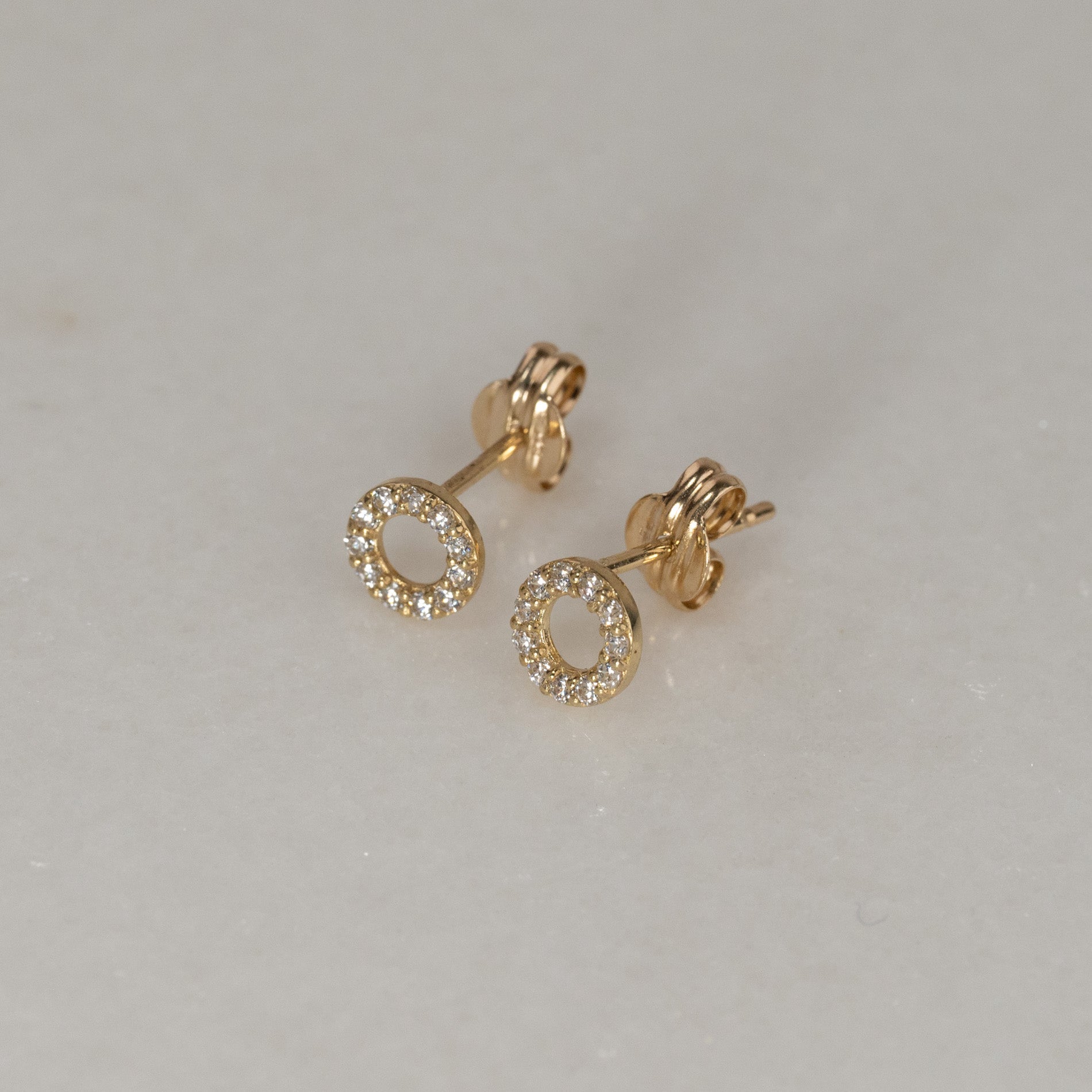 Örhängen tillverkade i 100% återvunnet massivt 9 karat guld. Örhängena består av en öppen cirkel besatt med små vita kubiska zirkonstenar, som ger ett vackert skimmer och glimrar fint i ljuset. Dessa örhängen har en elegant och tidlös design.