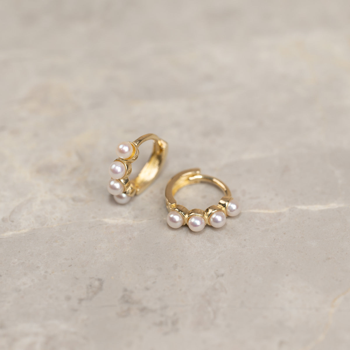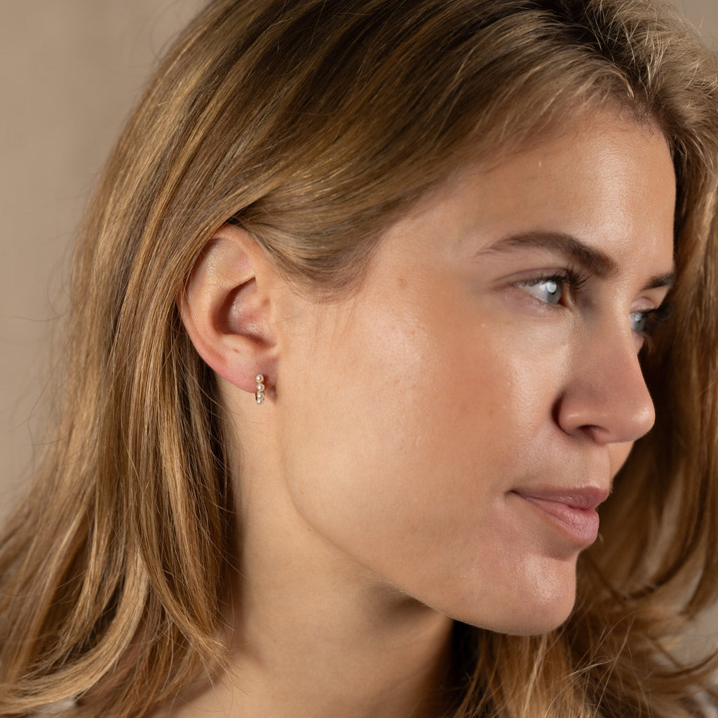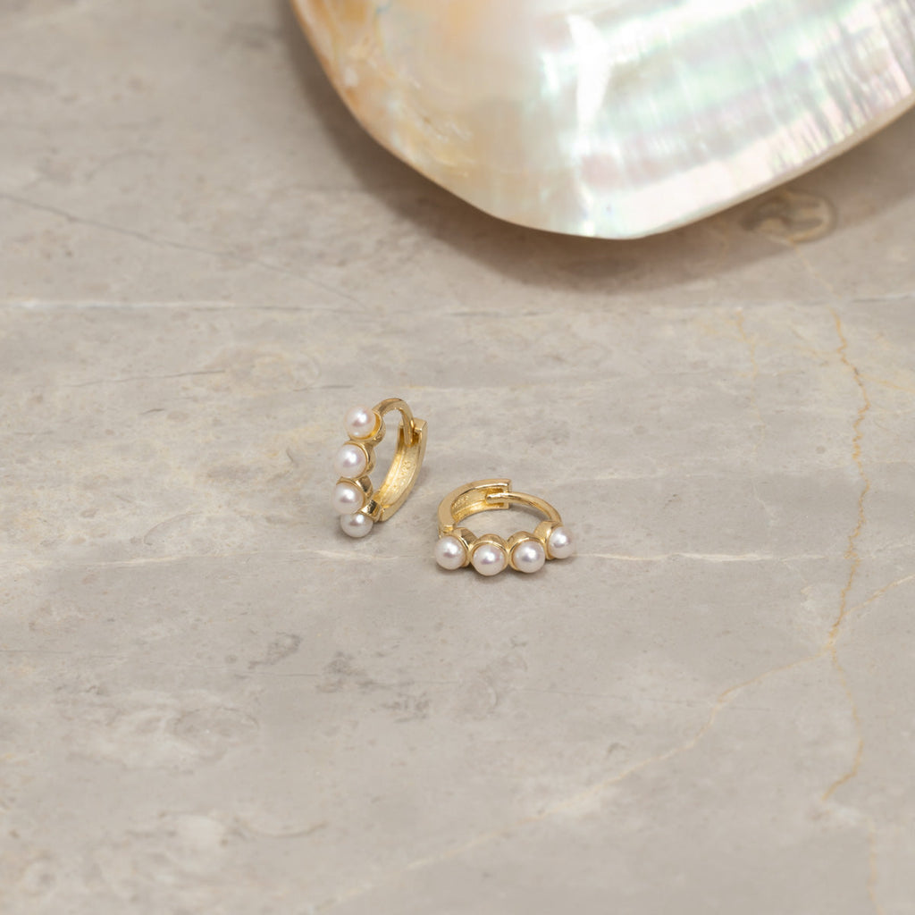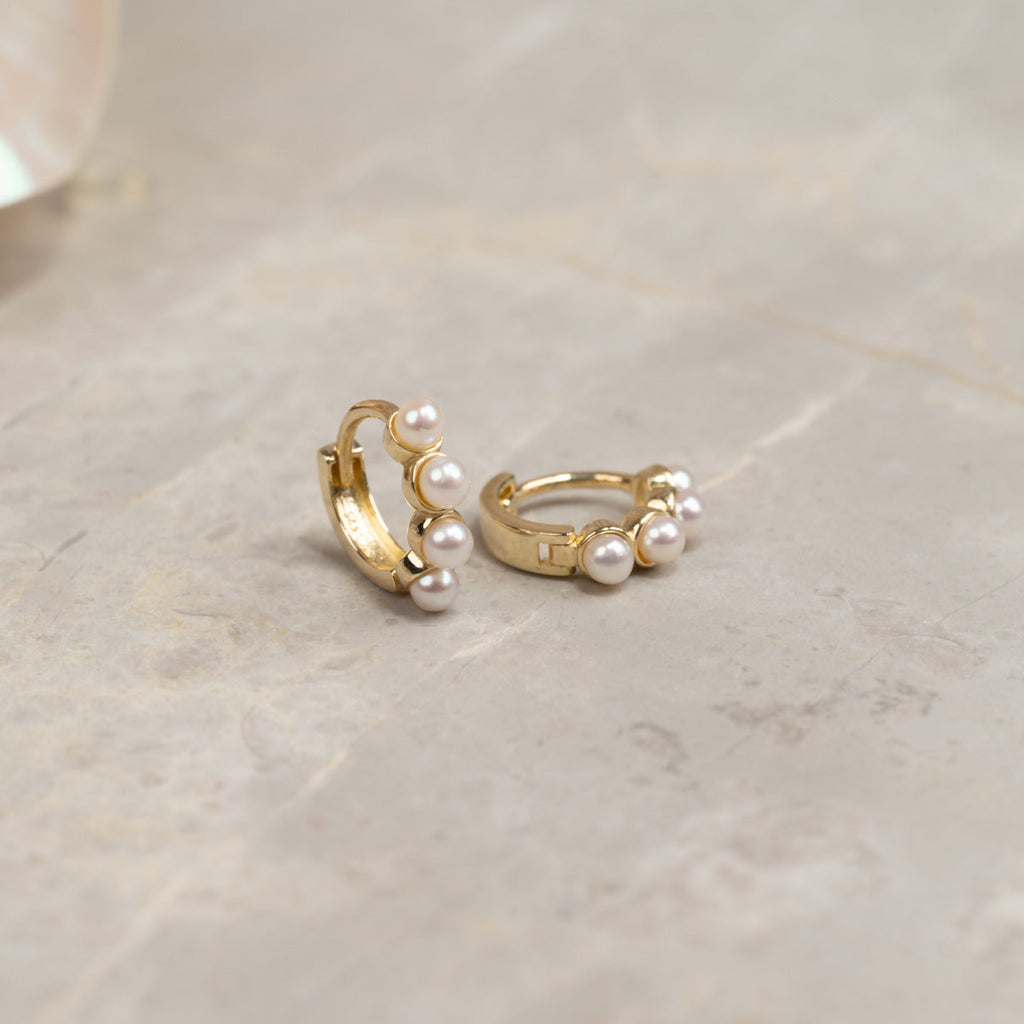 Våra Gudnare Mini örhängen är tillverkade av 100% återvunnet massivt 9 karats guld. Dessa små örhängen är fina och eleganta. På varje örhänge finns fyra små vita sötvattenpärlor.
