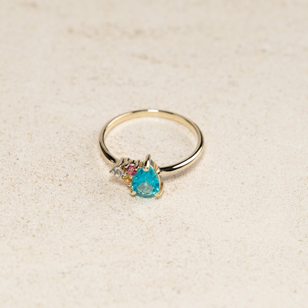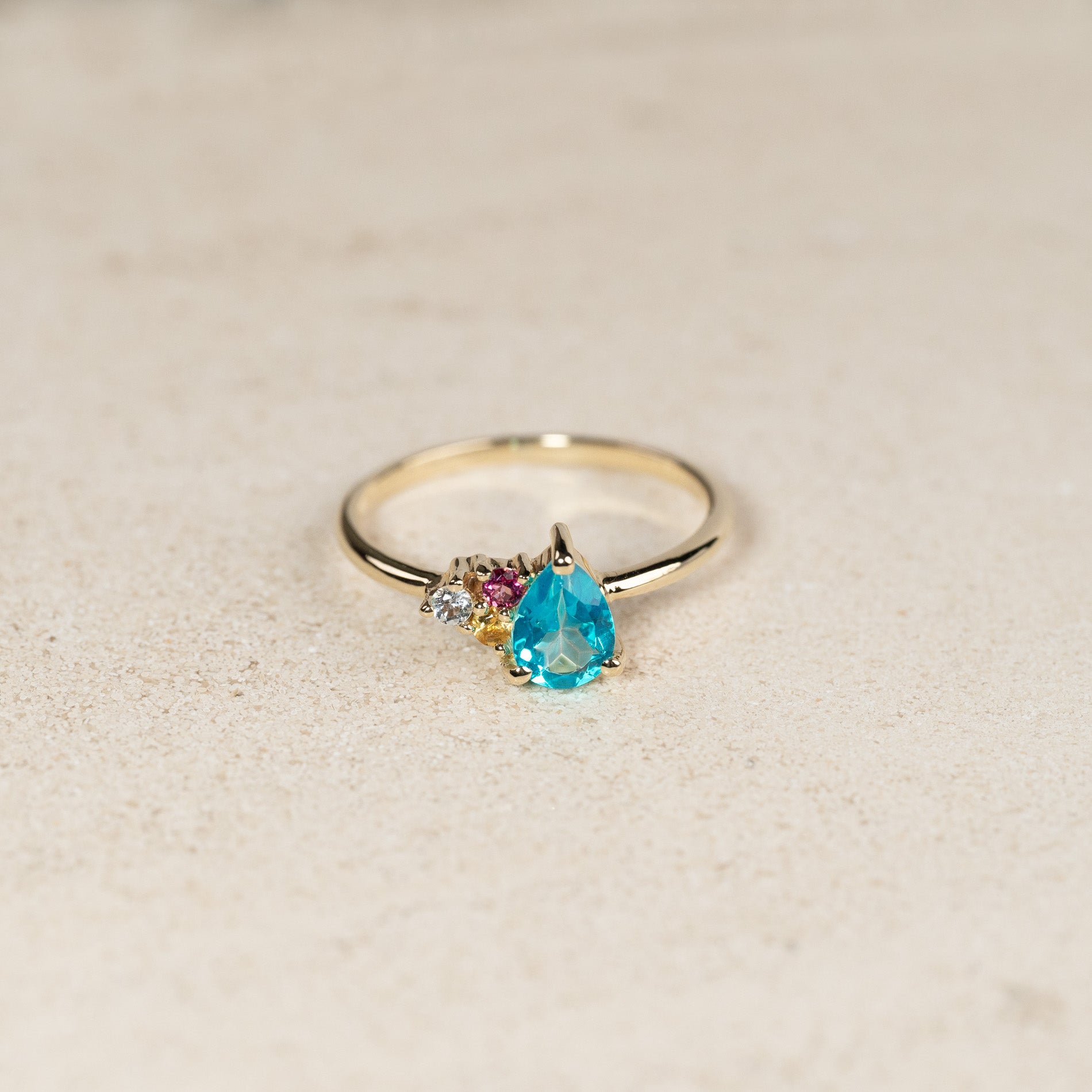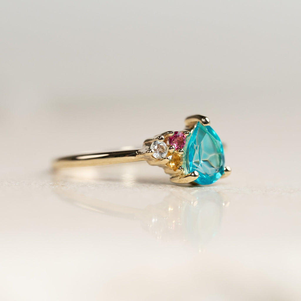 Ring i 100 % återvunnet massivt 9 karat guld med fyra olika topaser. Denna unika ringen är prydd med en vacker blå 'paraiba' topas, samt en vit, orange och rosa topas.