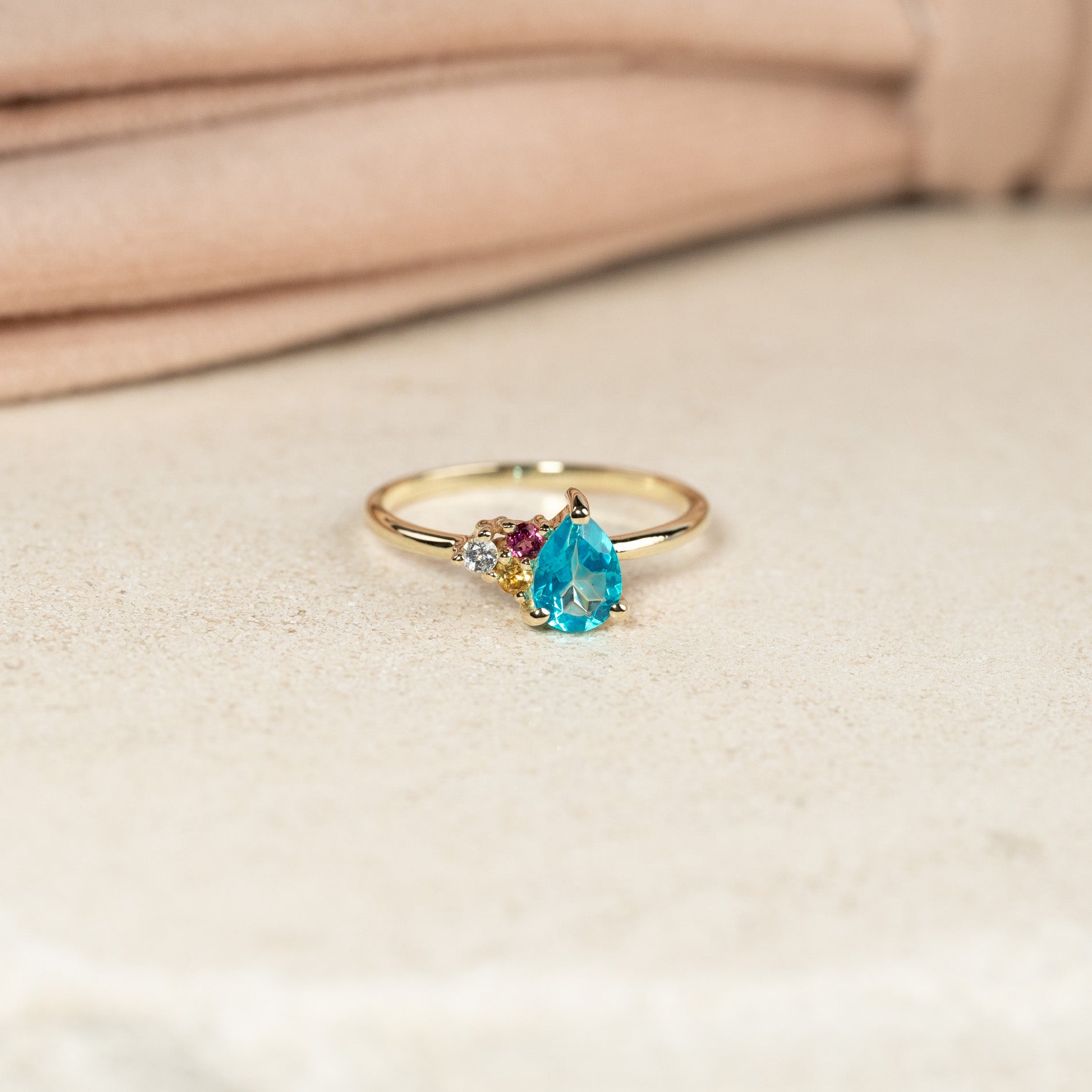 Den blå topasen är droppformad och sitter tätt ihop med de övriga stenarna, vilket ger ringen ett otroligt elegant och unikt utseende. Den är perfekt både till vardags och fest och kan bäras ensam eller kombineras med andra ringar för en personlig look.