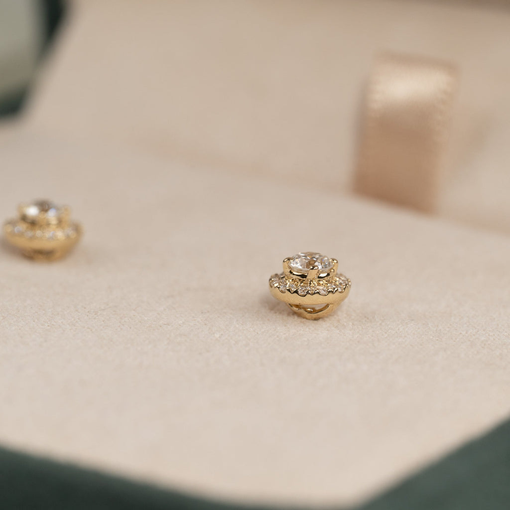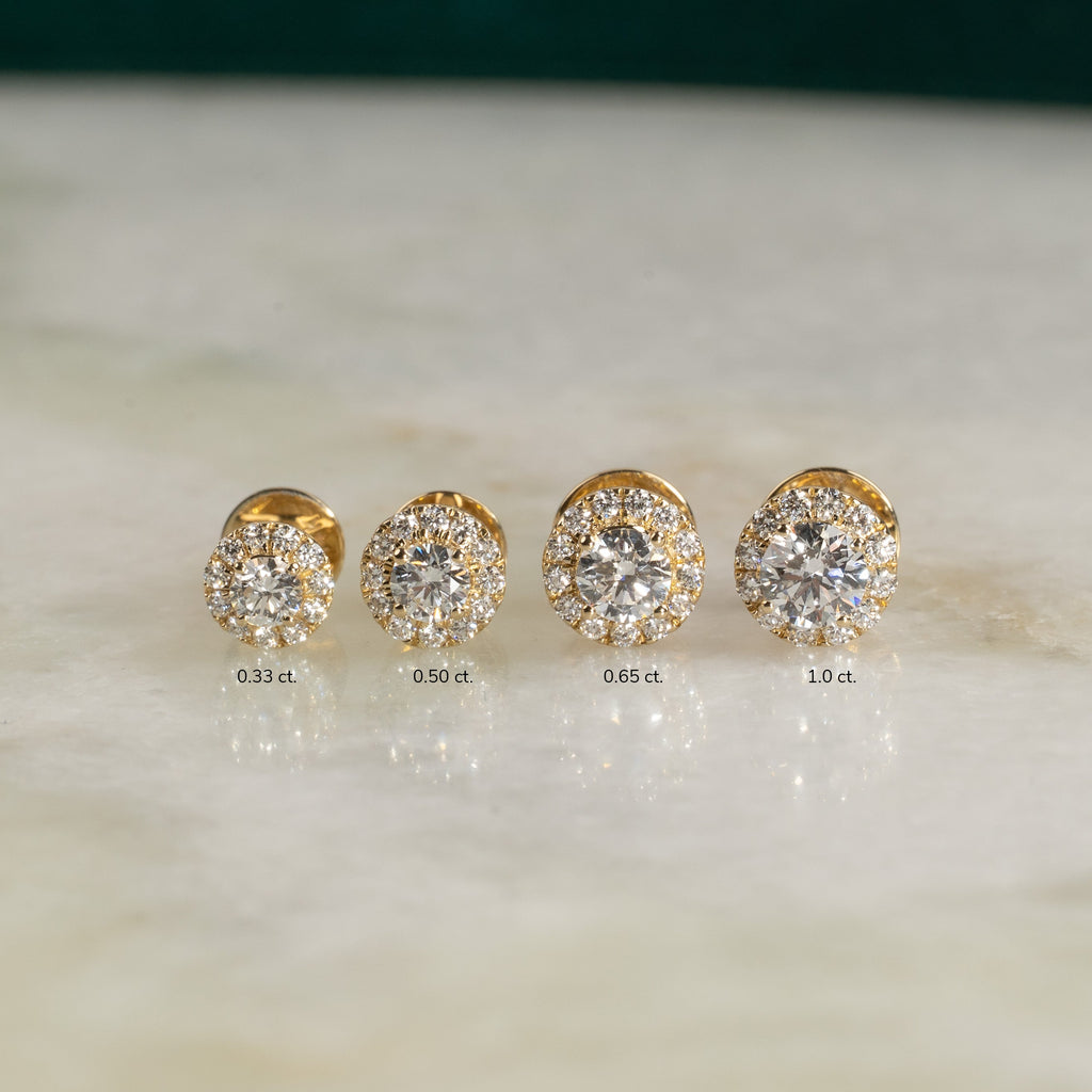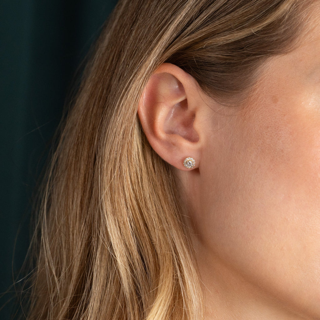 Diamant-studs i 14 kt. massivt guld med en varsin briljantslipad labbodlad diamant i centrum, omgiven av 12 mindre diamanter i en halo. Halo-designen ger ett elegant och feminint smycke där örhängena får en vacker total diameter, samtidigt som smycket sitter nära örat.