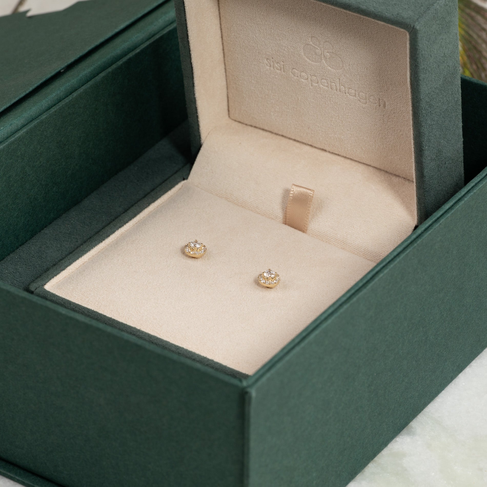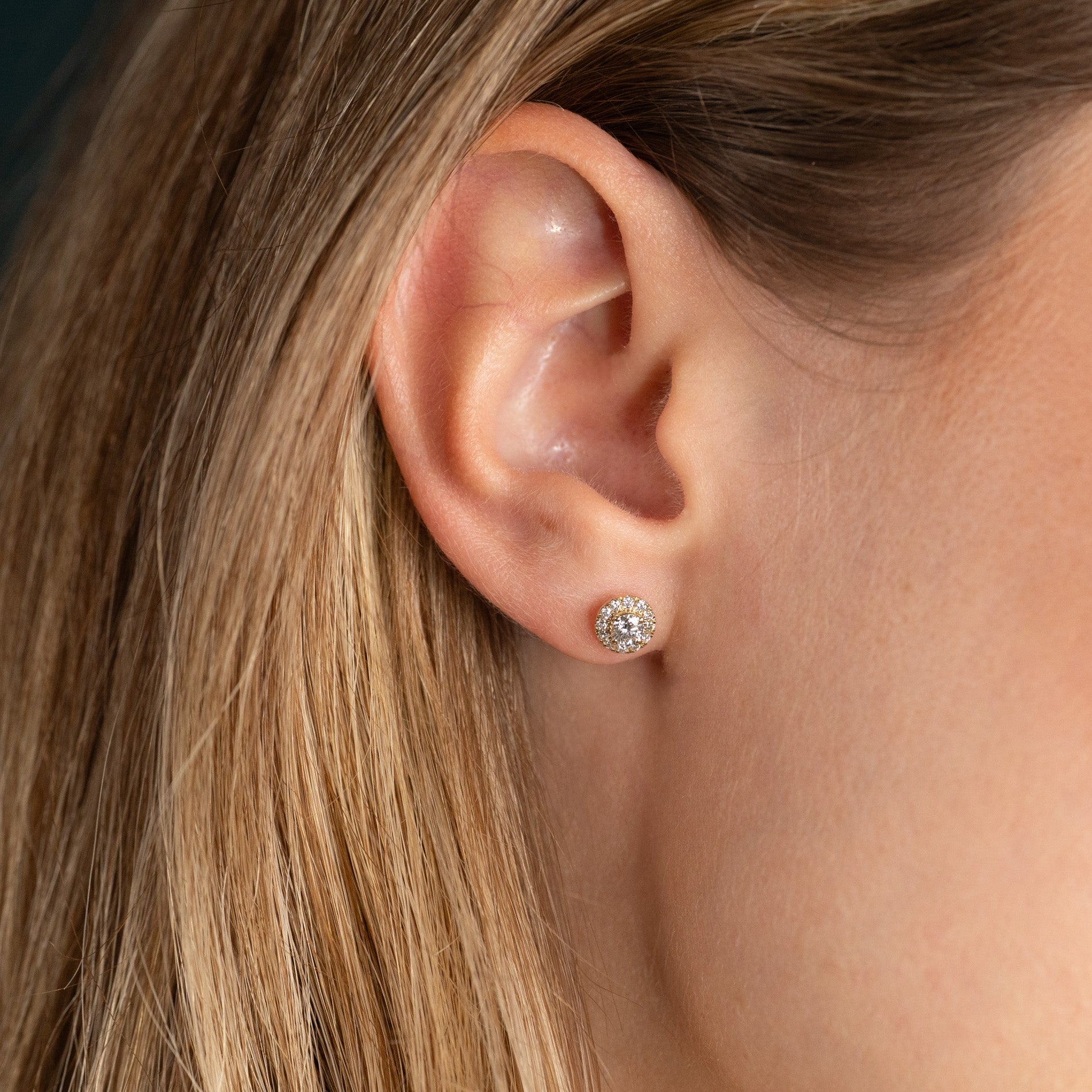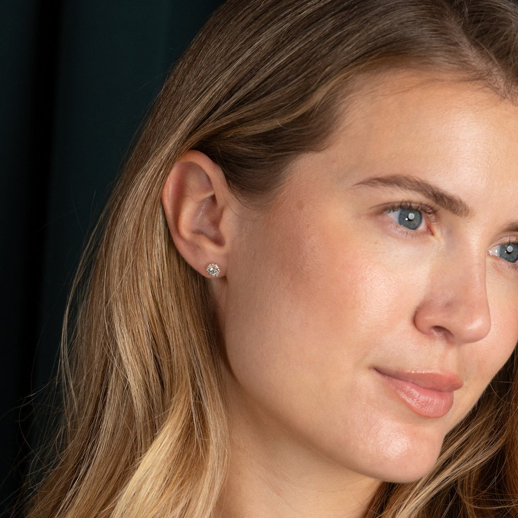 Diamant-studs i 14 kt. massivt guld med en varsin briljantslipad labbodlad diamant i centrum, omgiven av 12 mindre diamanter i en halo. Halo-designen ger ett elegant och feminint smycke där örhängena får en vacker total diameter, samtidigt som smycket sitter nära örat.