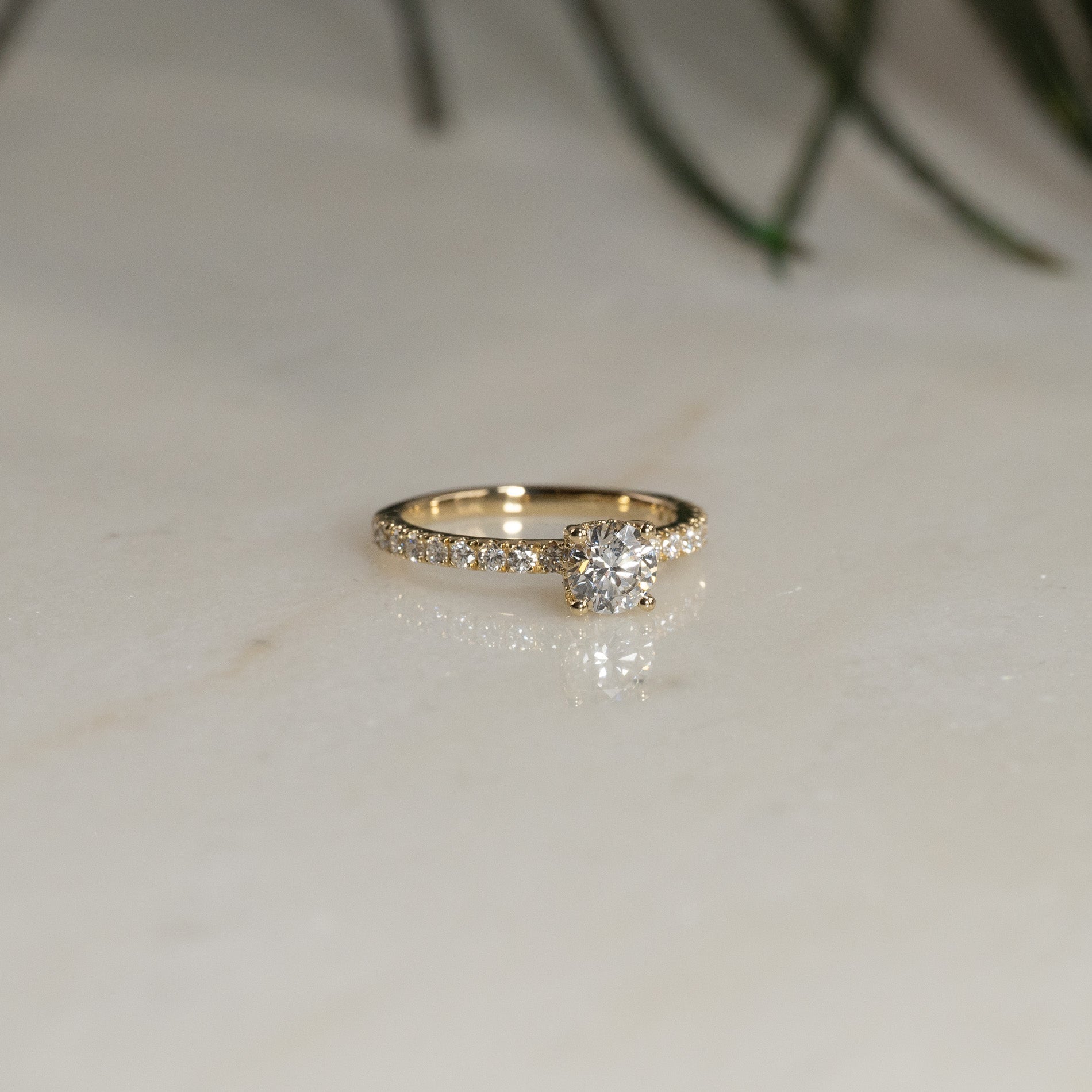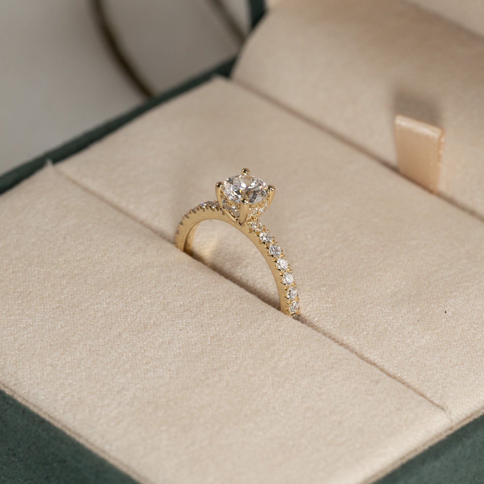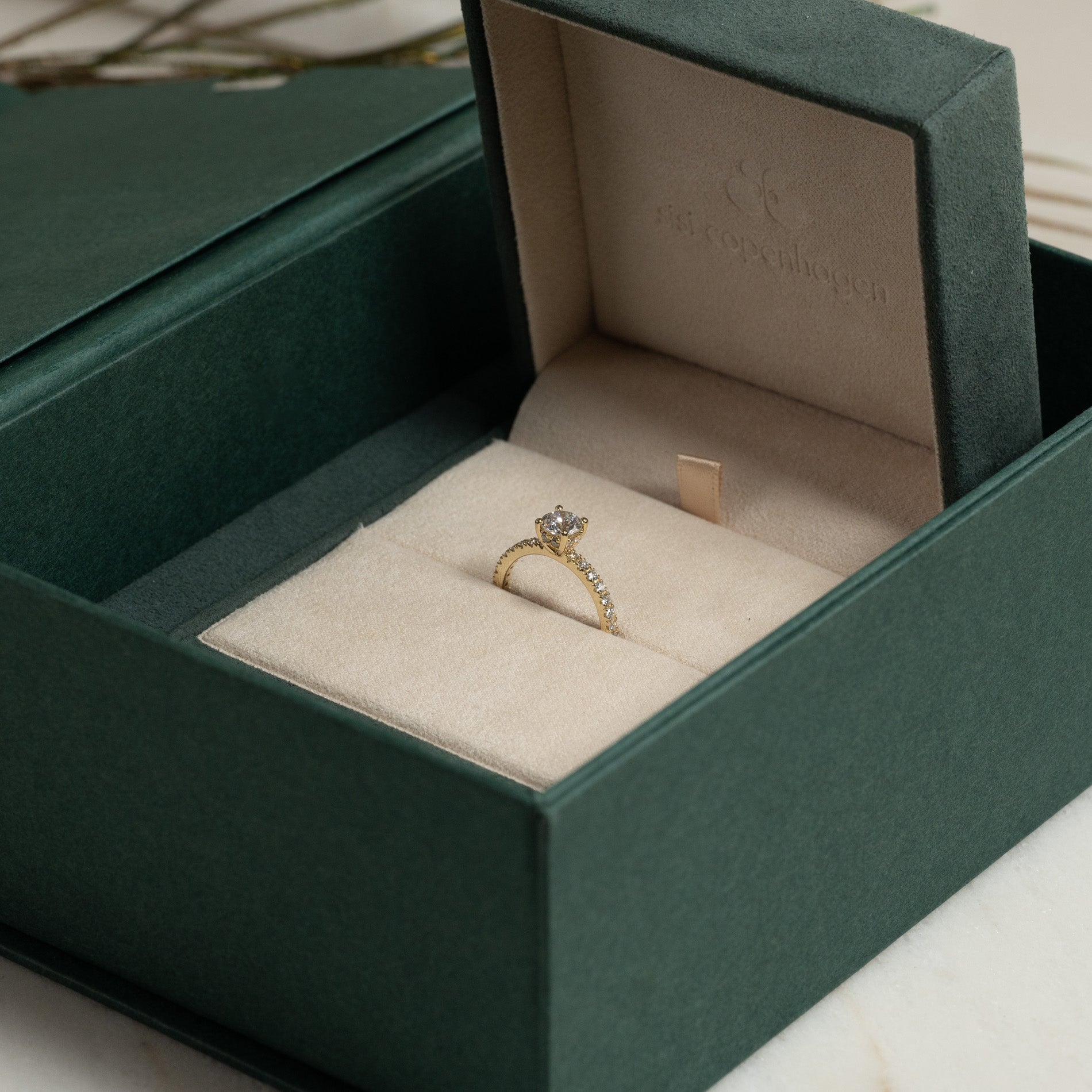 Vacker ring i 14 karat guld med labbodlade diamanter. Ringen pryds av en 0,75 ct briljantslipad diamant som centersten, infattad i en klassisk design med en dold halo - en krans av små diamanter som omger centerstenen i infattningen. Dessutom är den övre halvan av ringskenan dekorerad med diamanter som sidostenar, totalt 0,5 ct. Sammanlagt har ringen en caratvikt på 1,25 ct.
