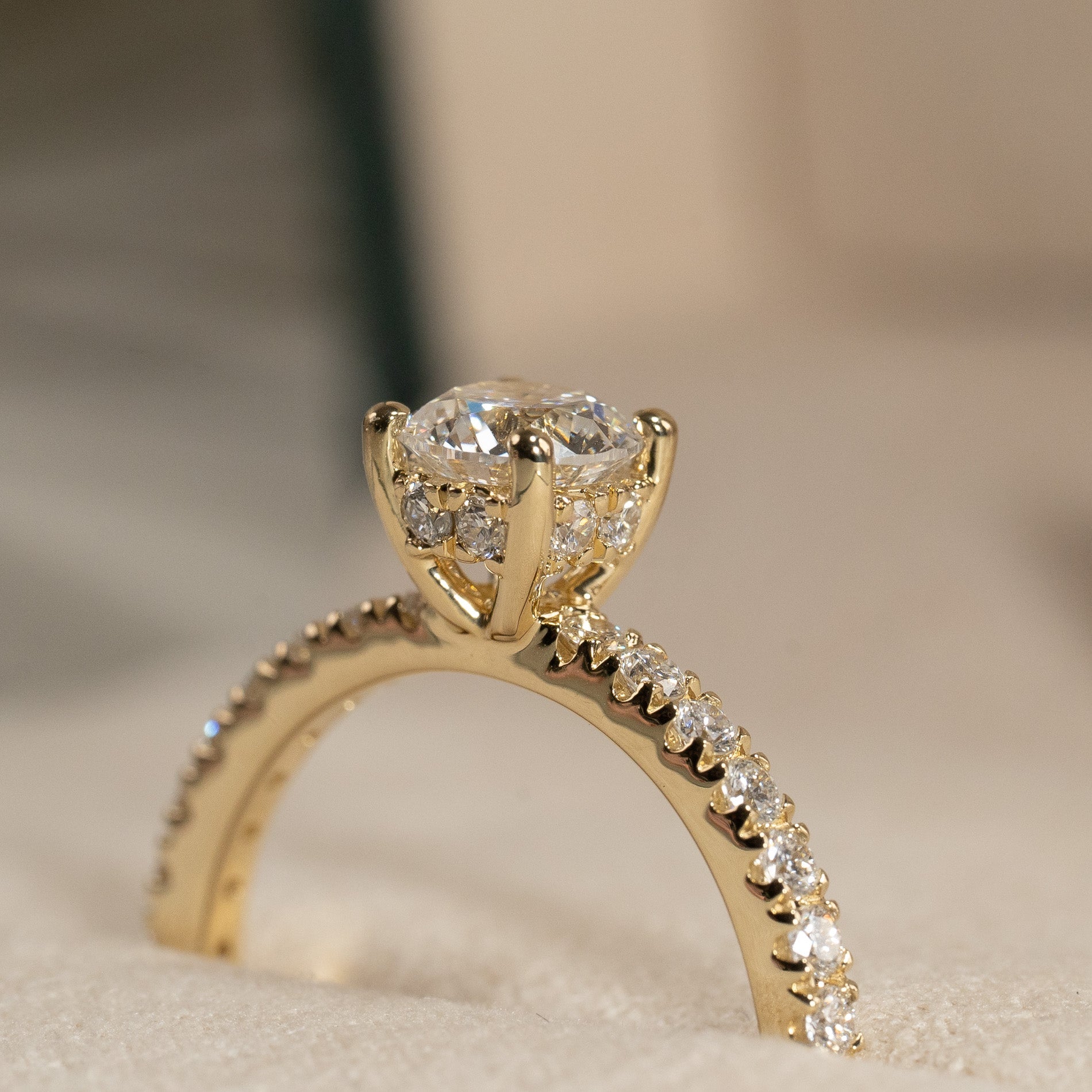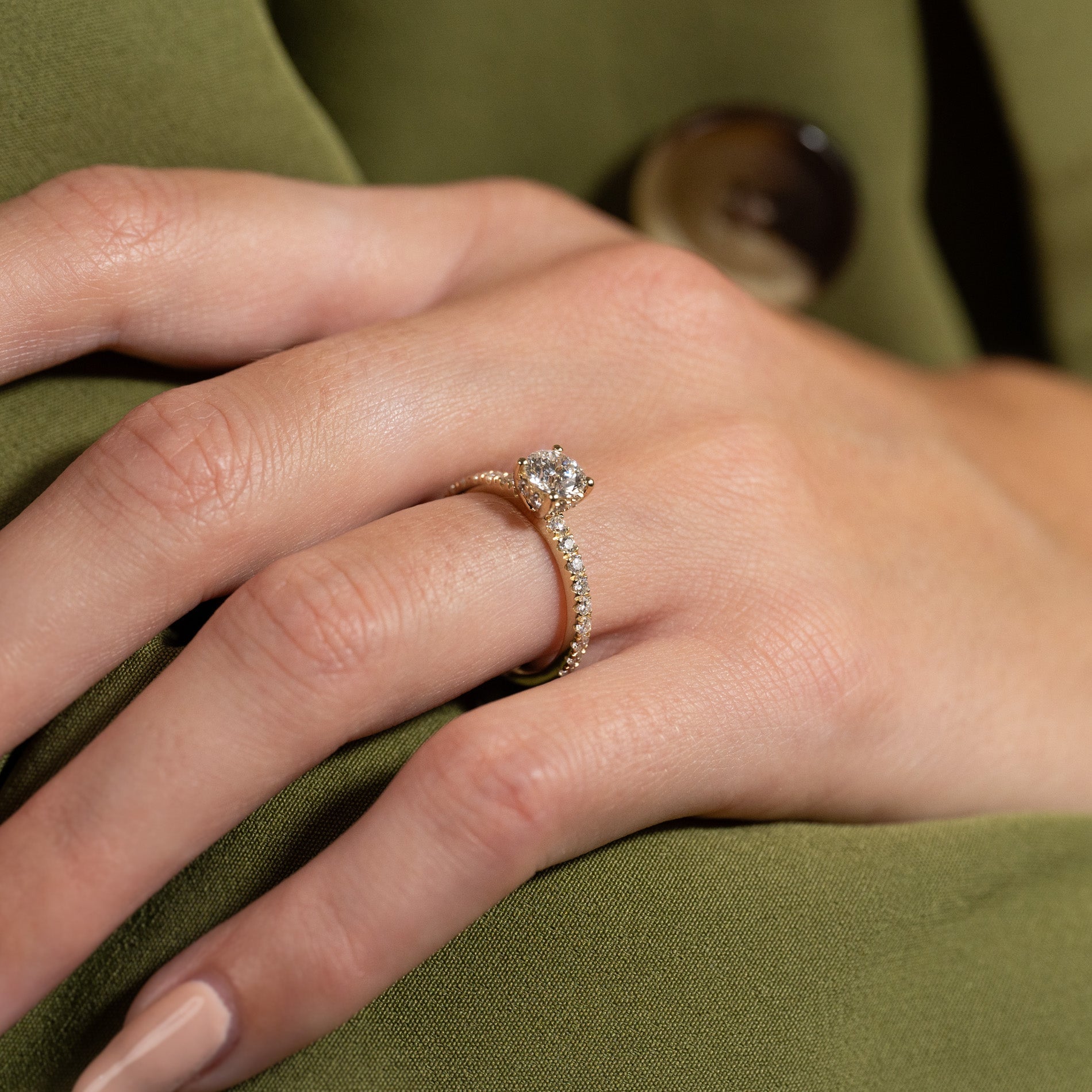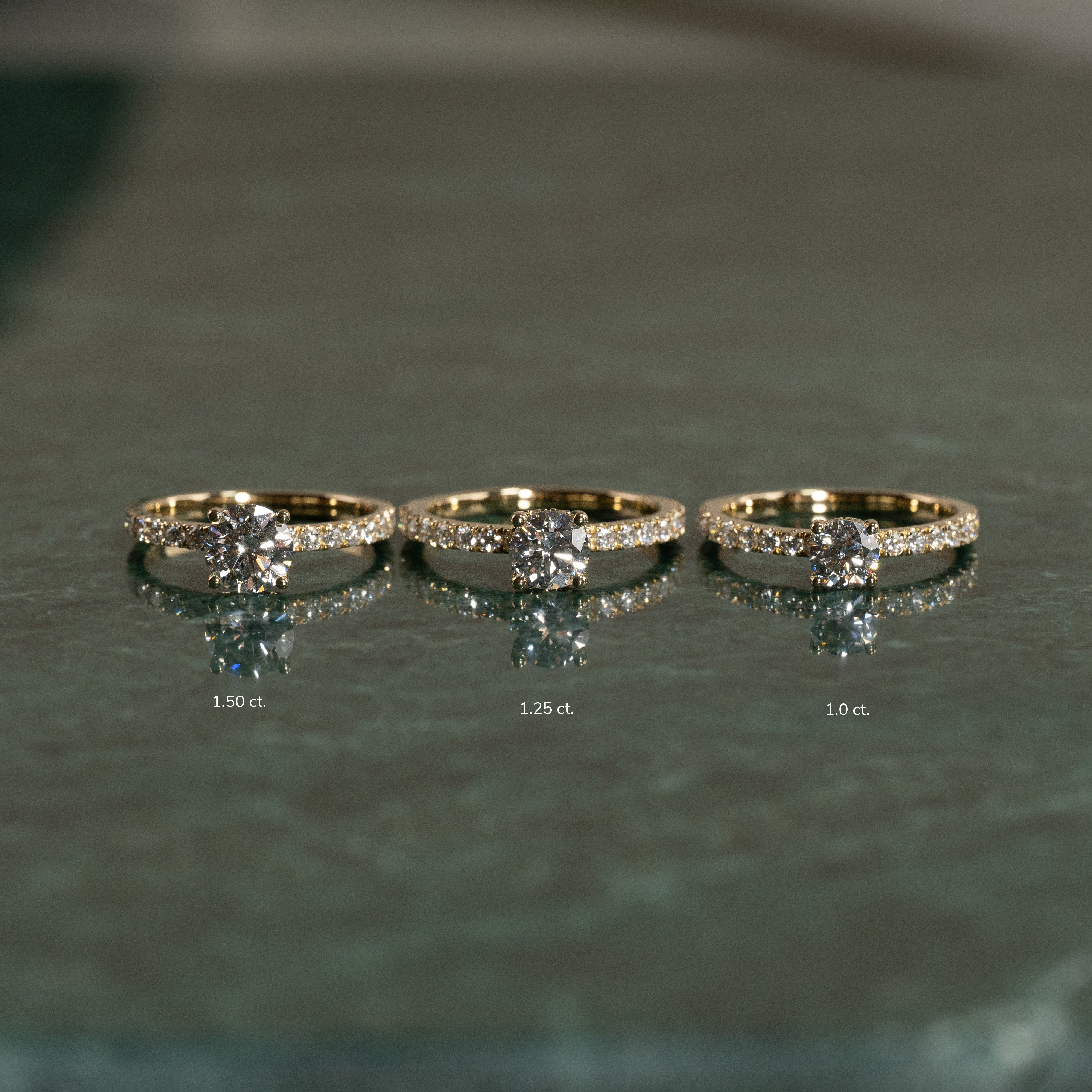 Vacker ring i 14 karat guld med labbodlade diamanter. Ringen pryds av en 0,75 ct briljantslipad diamant som centersten, infattad i en klassisk design med en dold halo - en krans av små diamanter som omger centerstenen i infattningen. Dessutom är den övre halvan av ringskenan dekorerad med diamanter som sidostenar, totalt 0,5 ct. Sammanlagt har ringen en caratvikt på 1,25 ct.