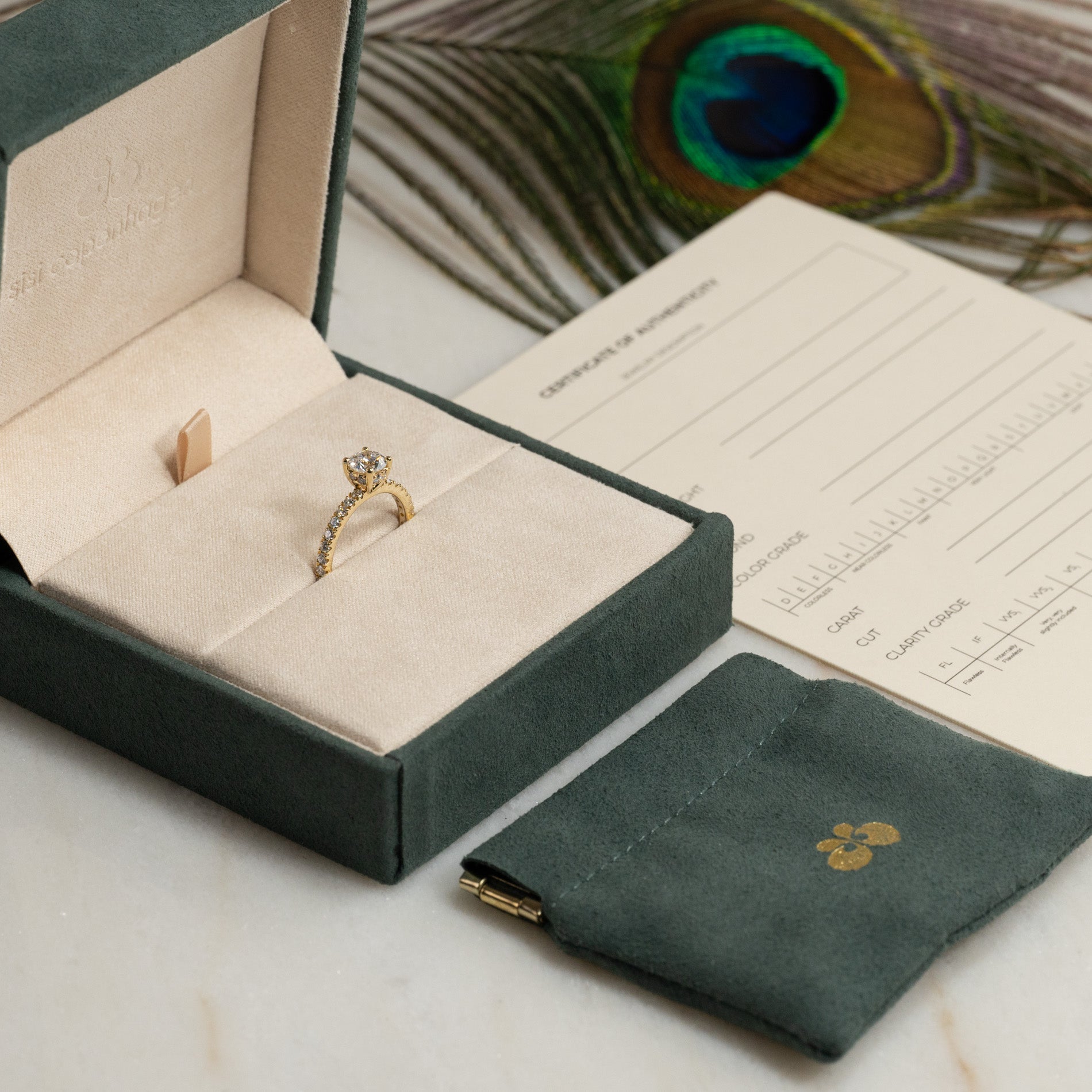 Vi erbjuder en fin lösning: Vi skickar den vackra presentboxen i förväg, fint inslagen, men utan smycket. Tillsammans med boxen skickar vi med ett kort som berättar för den lyckliga mottagaren vad de har att se fram emot. Så snart smycket är färdigt skickas det separat i vår fina smyckesask tillsammans med certifikatet. På så sätt kan du ge en oförglömlig gåva, även om smycket inte är klart på den speciella dagen.