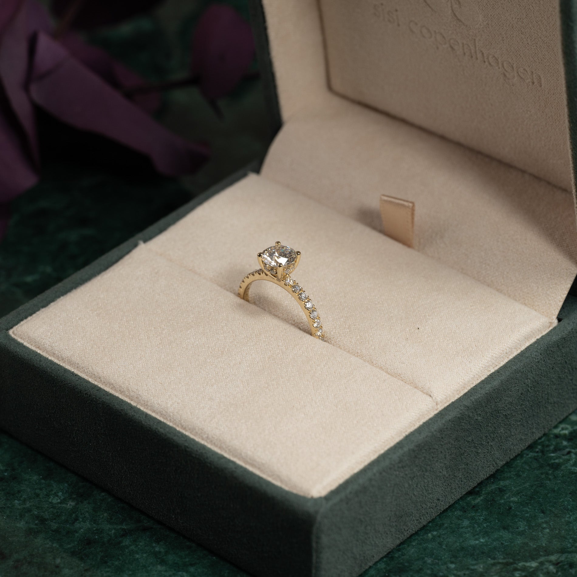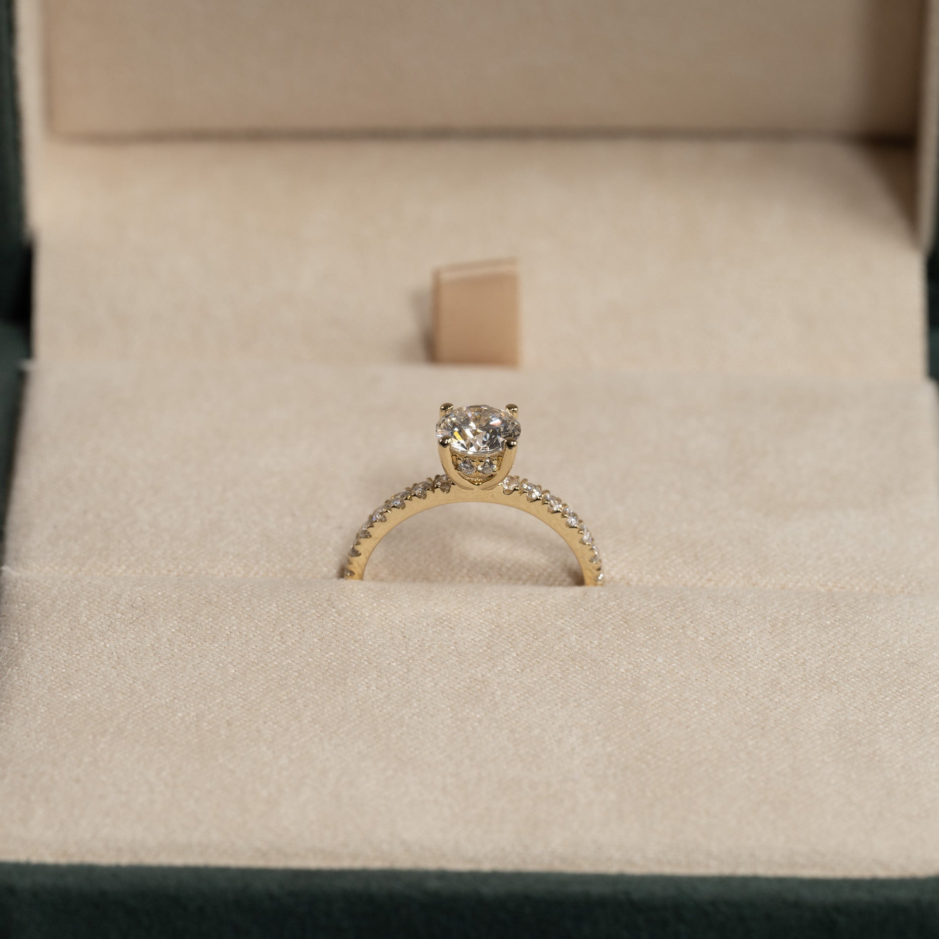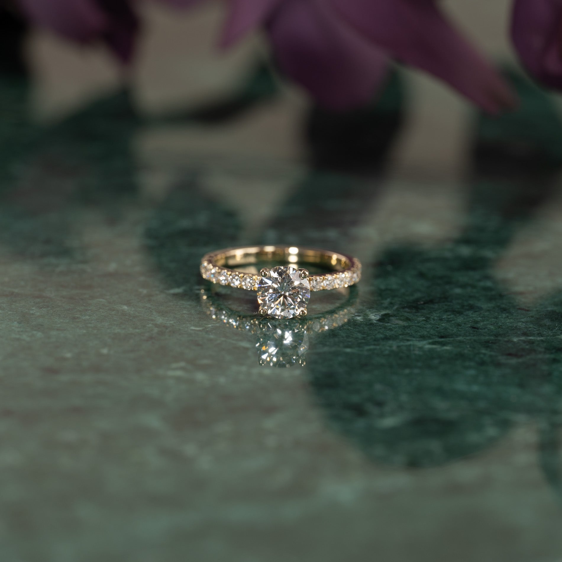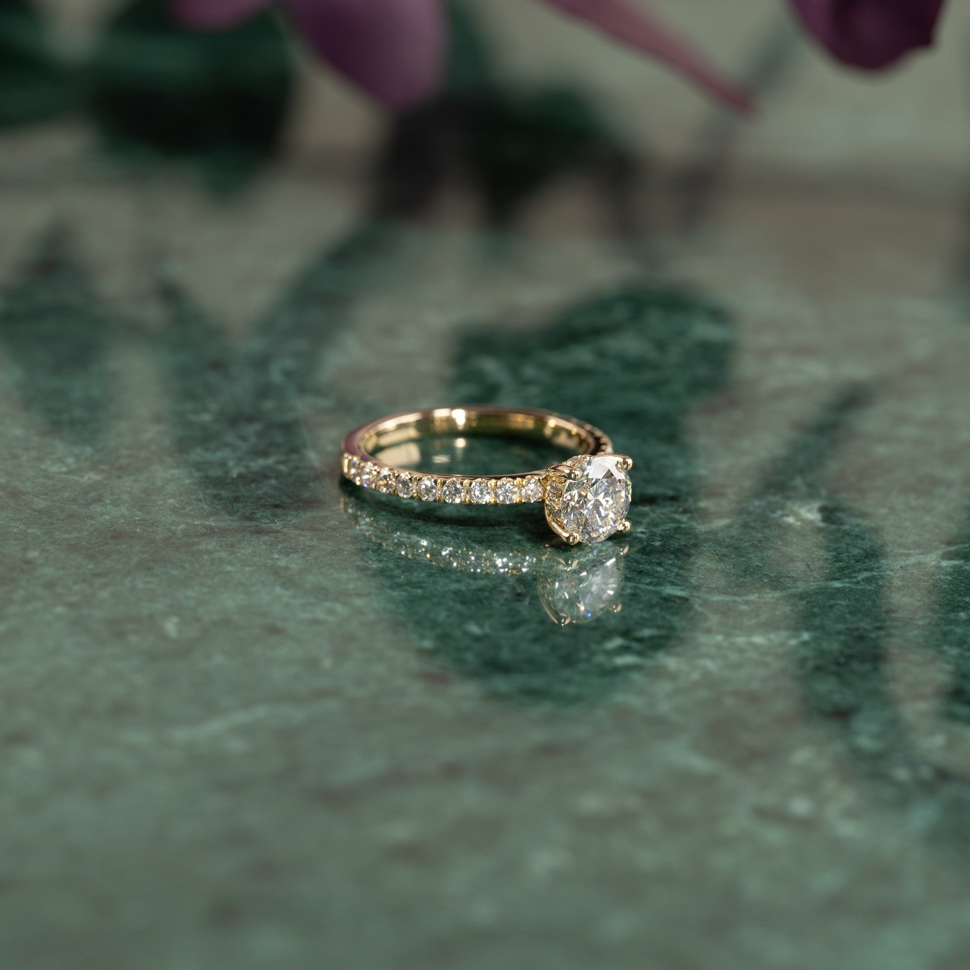 Ringen är tillverkad i 14 karat guld och är försedd med labbodlade diamanter på totalt 1,5 ct. Diamanternas färg är E/F (River) och klarheten är VVS. Smycket är framställt med omtanke; diamanterna är tillverkade med hjälp av bland annat solenergi, och guldet är 100% certifierat återvunnet.