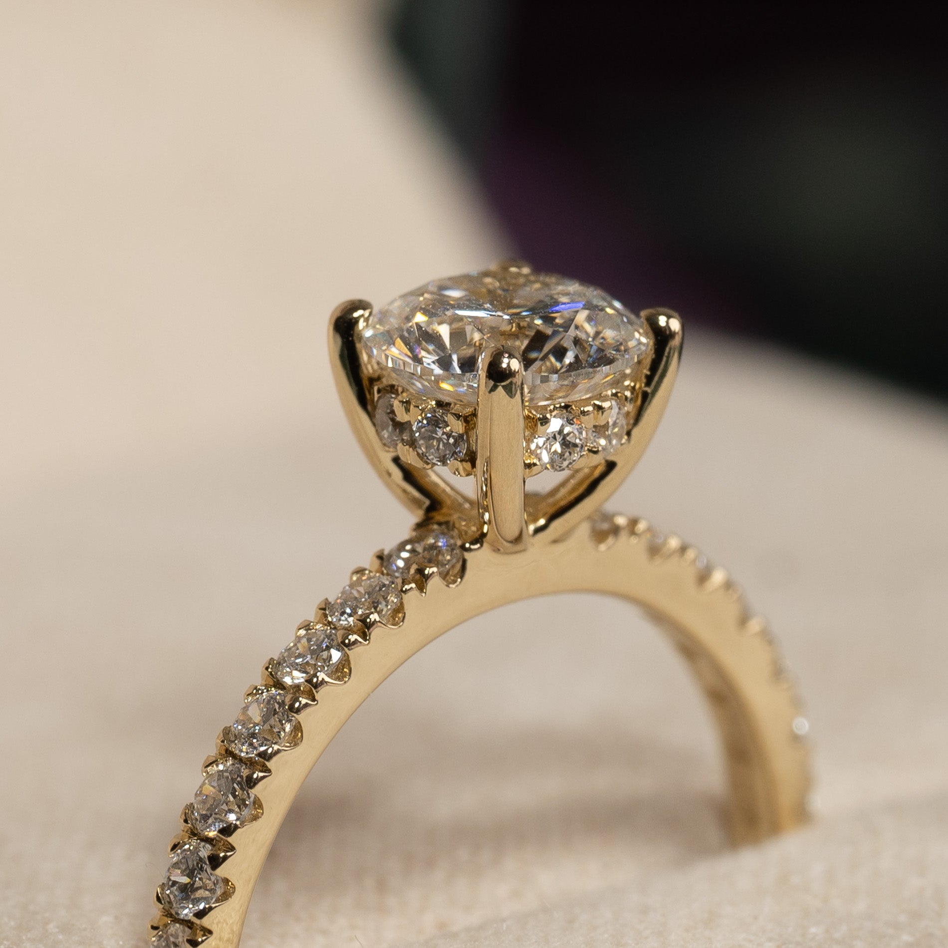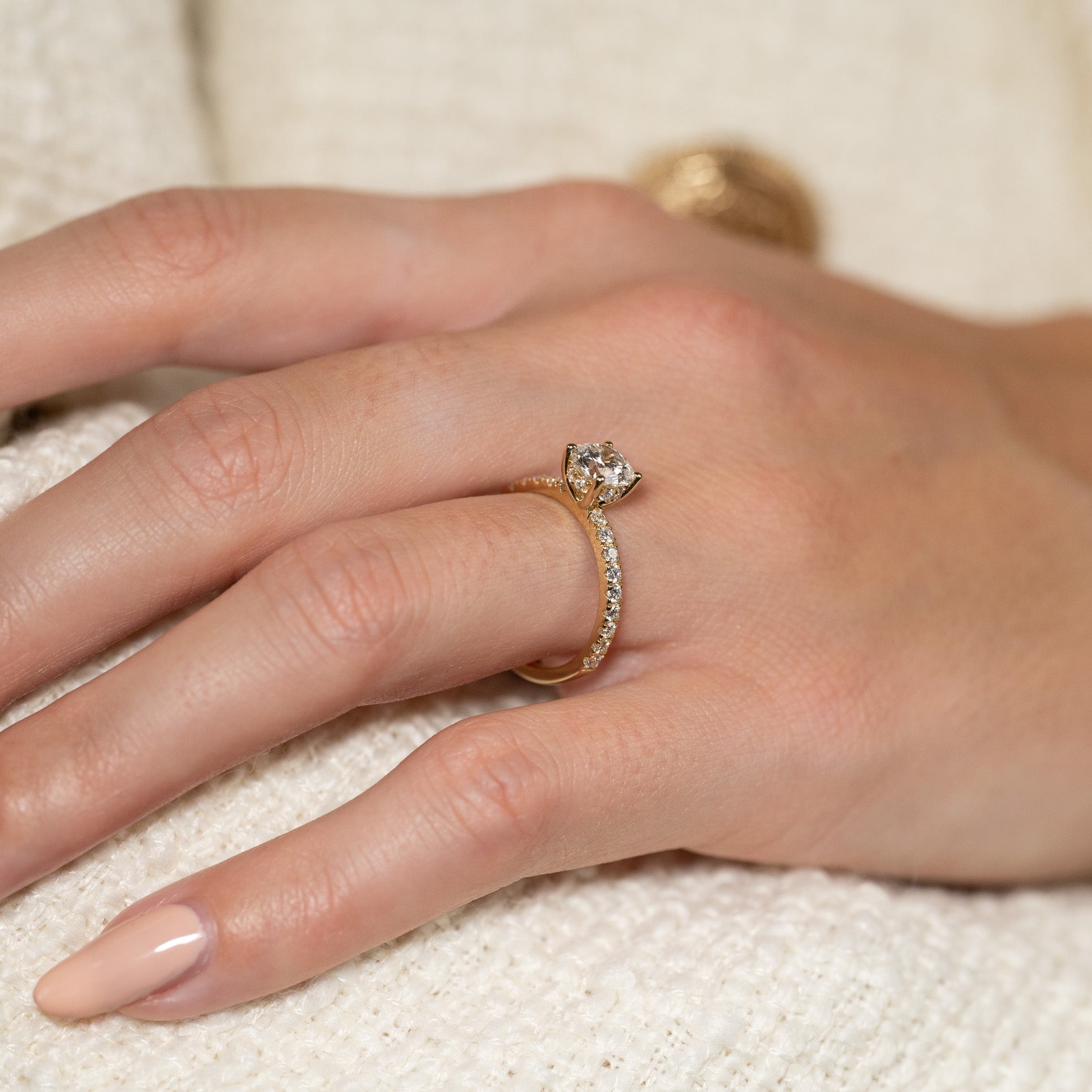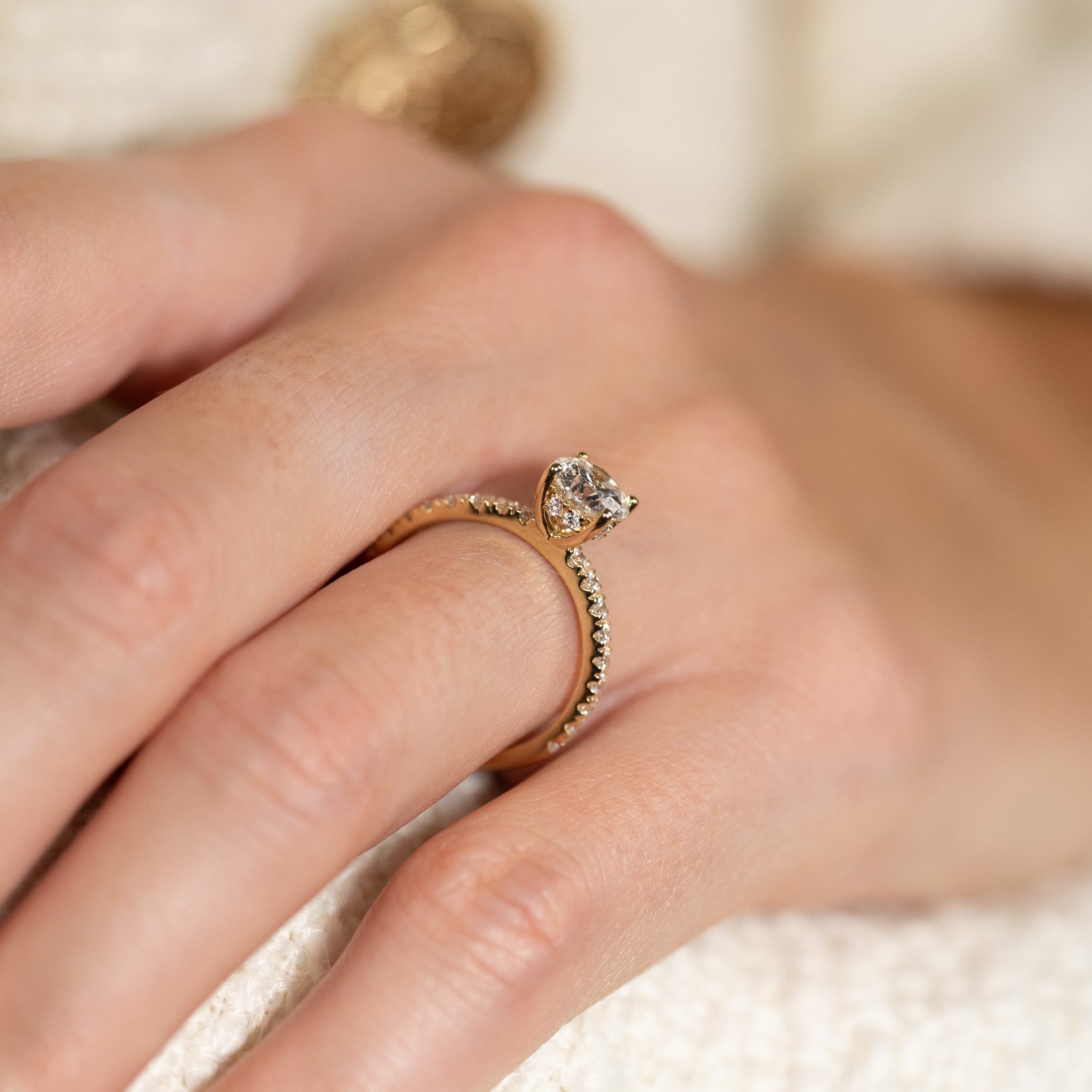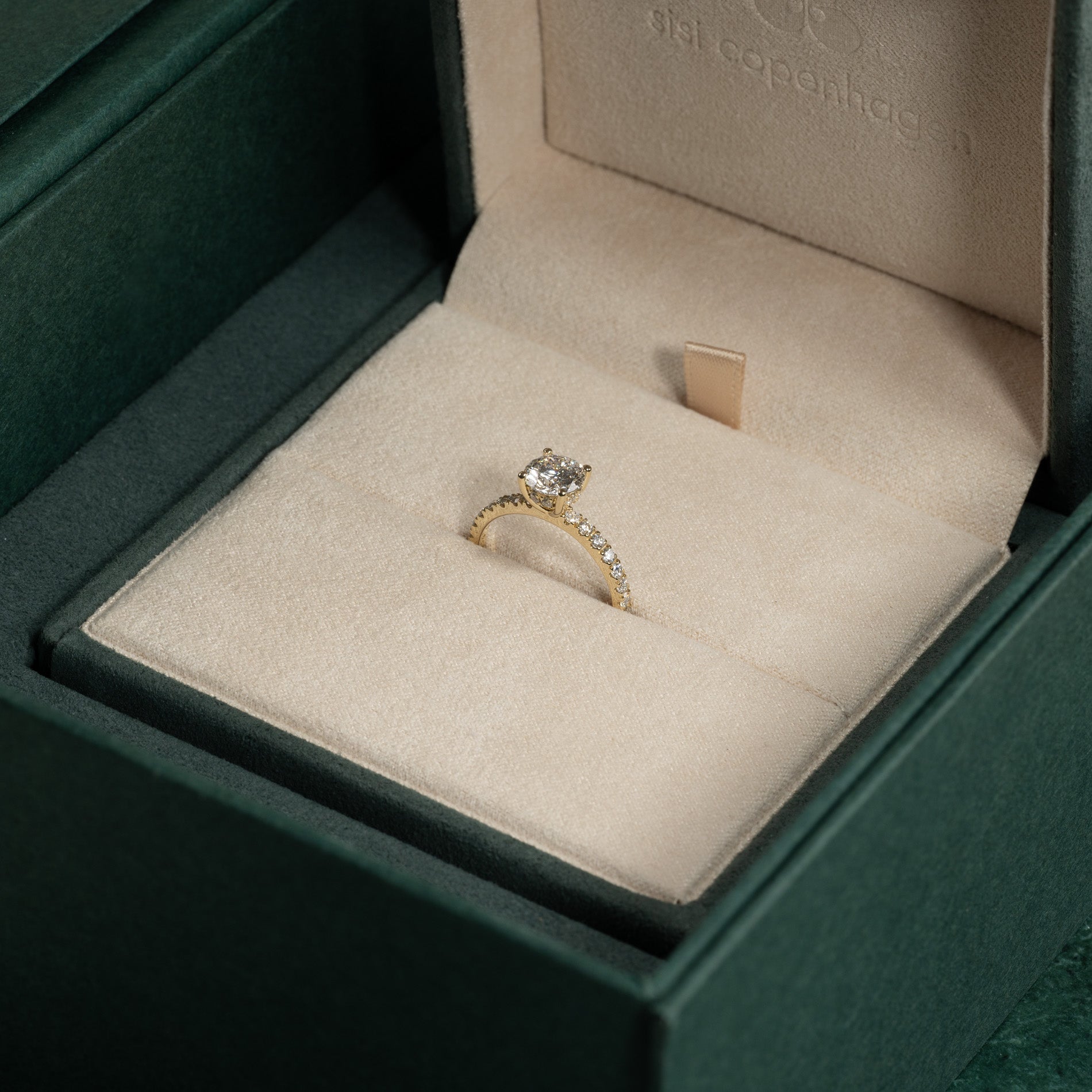 Ringen är tillverkad i 14 karat guld och är försedd med labbodlade diamanter på totalt 1,5 ct. Diamanternas färg är E/F (River) och klarheten är VVS. Smycket är framställt med omtanke; diamanterna är tillverkade med hjälp av bland annat solenergi, och guldet är 100% certifierat återvunnet.
