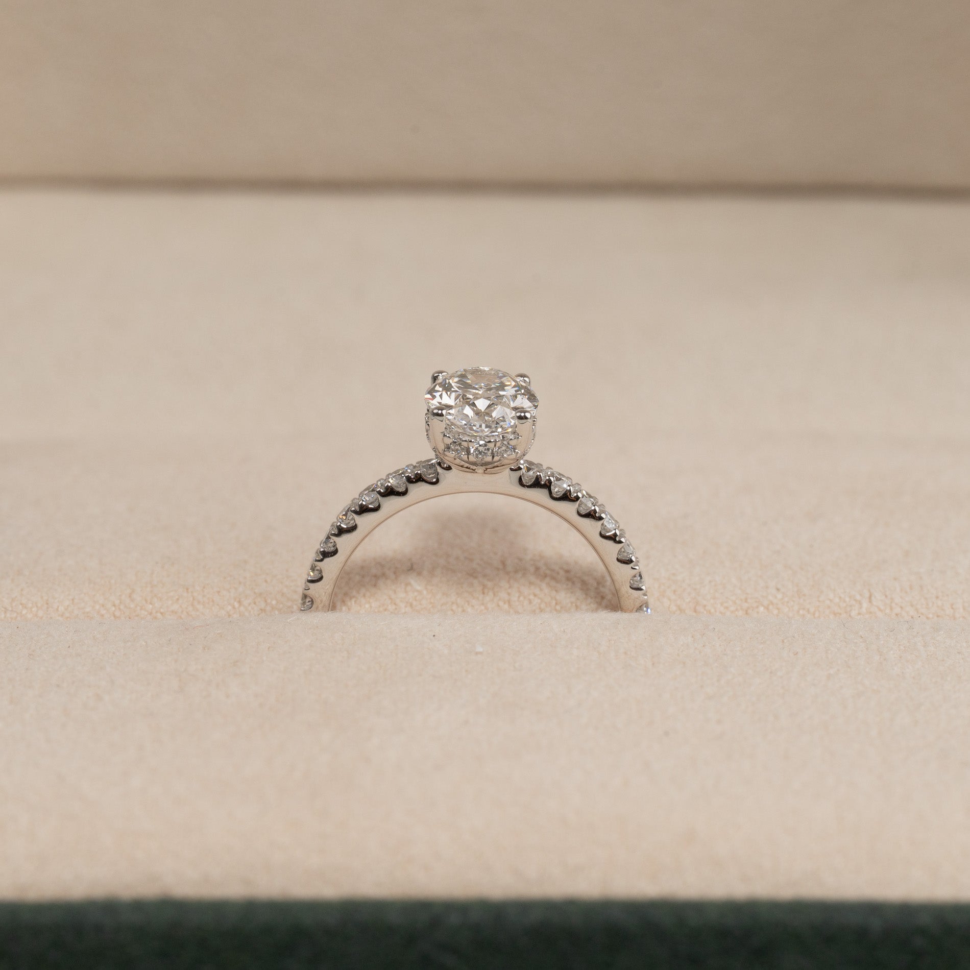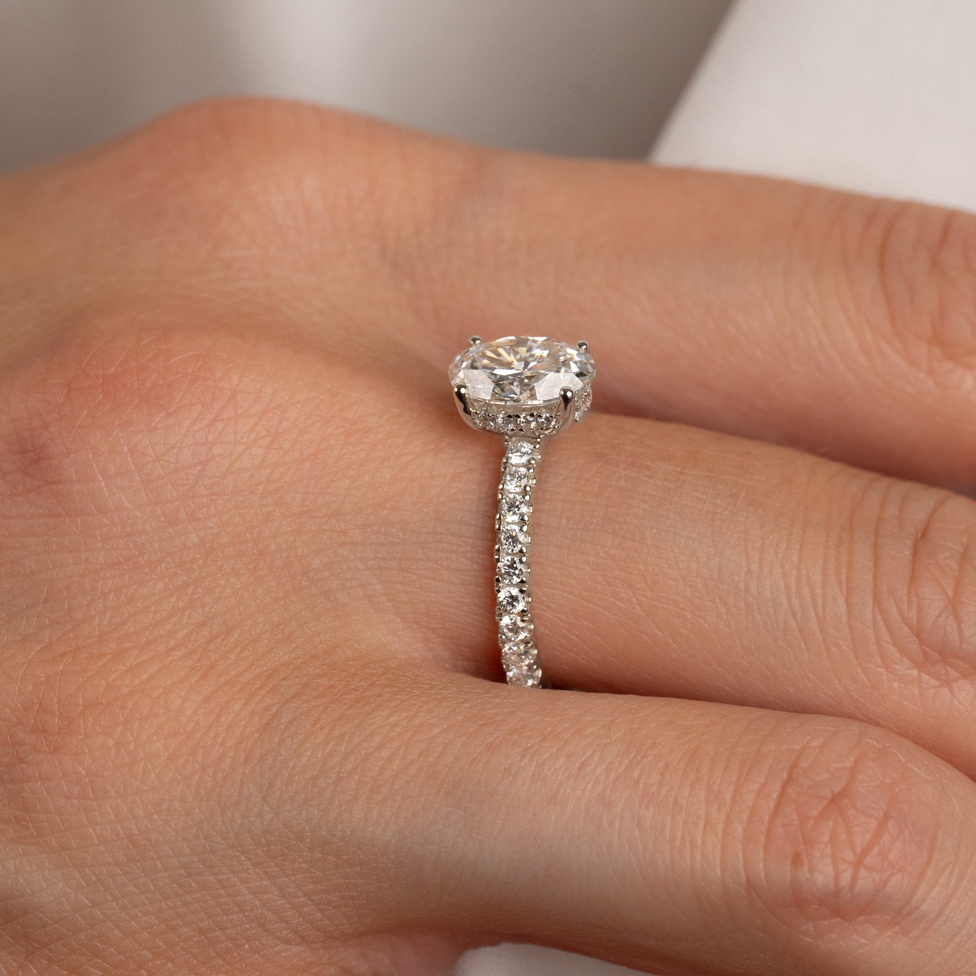 Vacker ring i 14 karat vitguld med labbodlade diamanter. Ringen har en 1,5 ct. oval-slipad diamant som mittsten, elegant infattad i en hidden halo – en krans av mindre diamanter, som sitter i själva infattningen. Ringen har dessutom diamanter som pryder den övre halvan av ringskenan, vilket fulländar designen och ger ett harmoniskt och glittrande utseende.