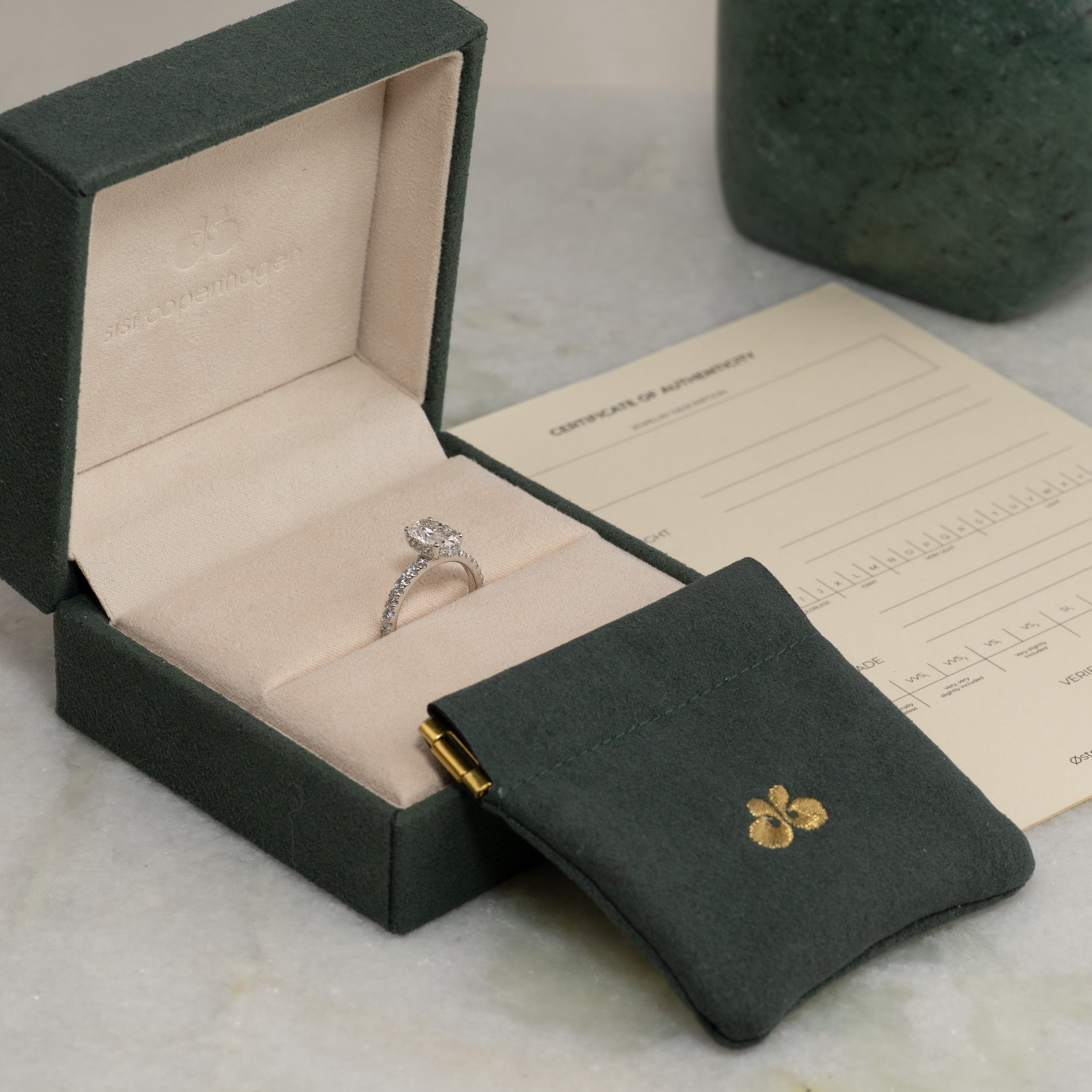 Klart att ges som gåva. I asken hittar du en smyckeskrin, en påse och ett 'certificate of authenticity'.
