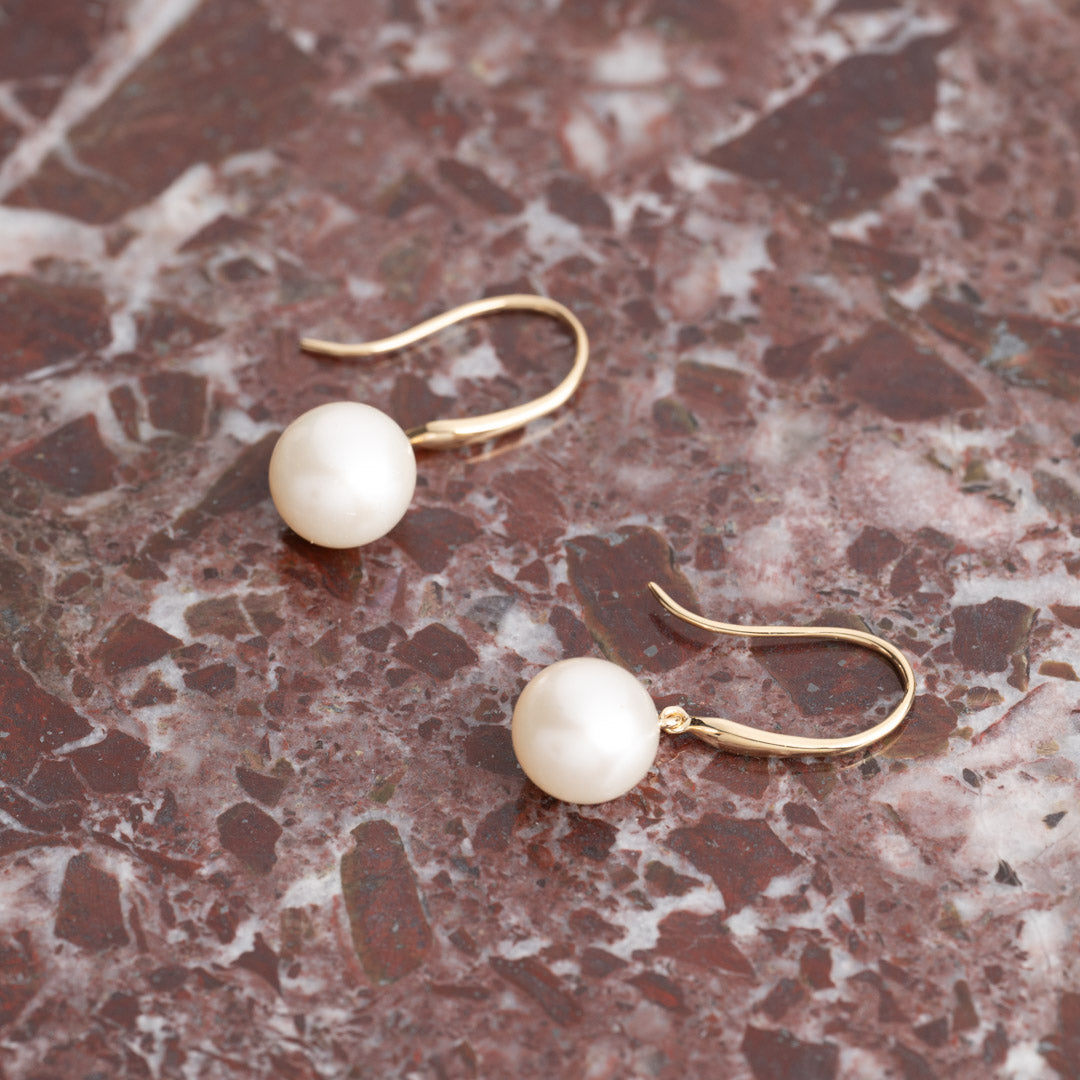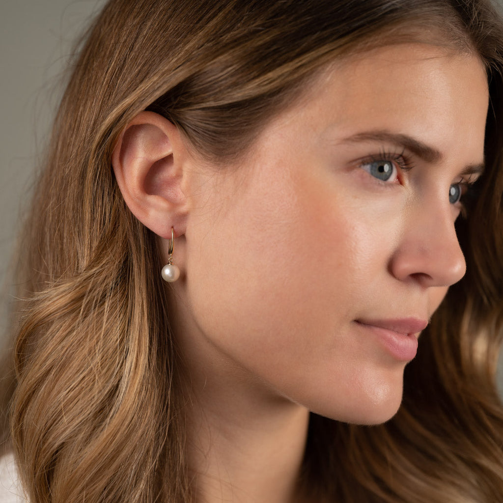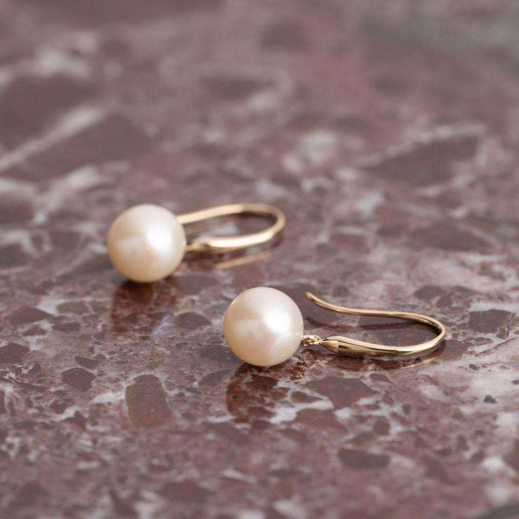 Örhängen av 100% återvunnet 9 karats guld. Örhängena har en rund sötvattenspärla som mäter ca. 8.5-9mm.