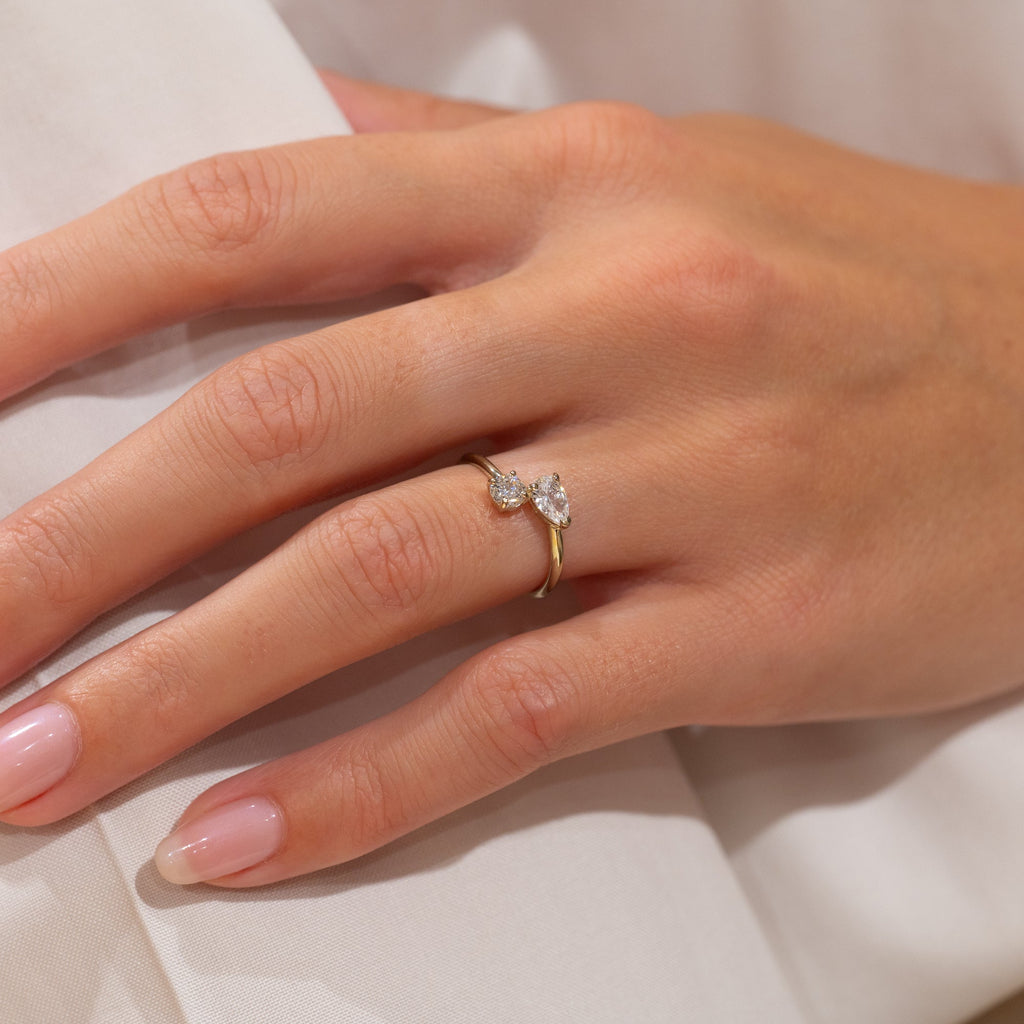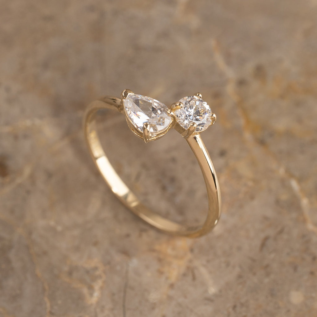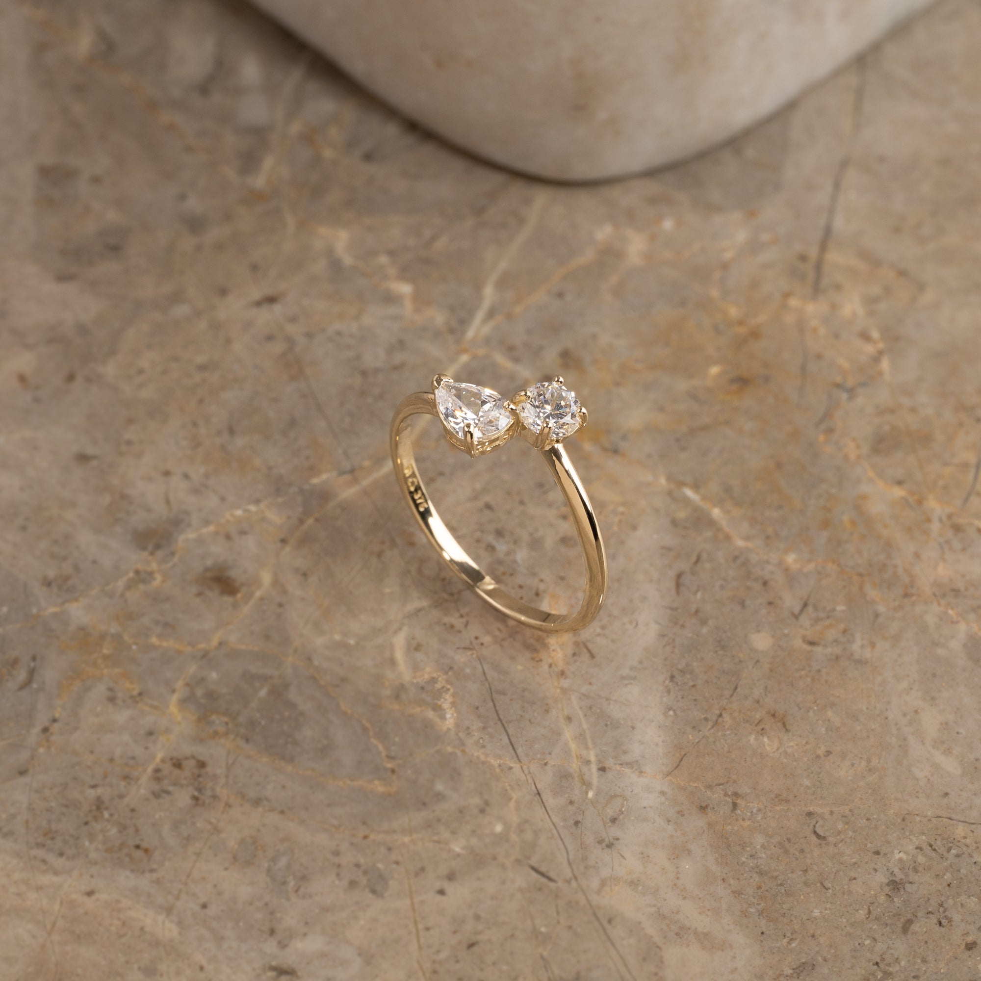 En fin och feminin ring med en rund och en päronformad zirkon, placerade asymmetriskt för ett unikt och elegant utseende.