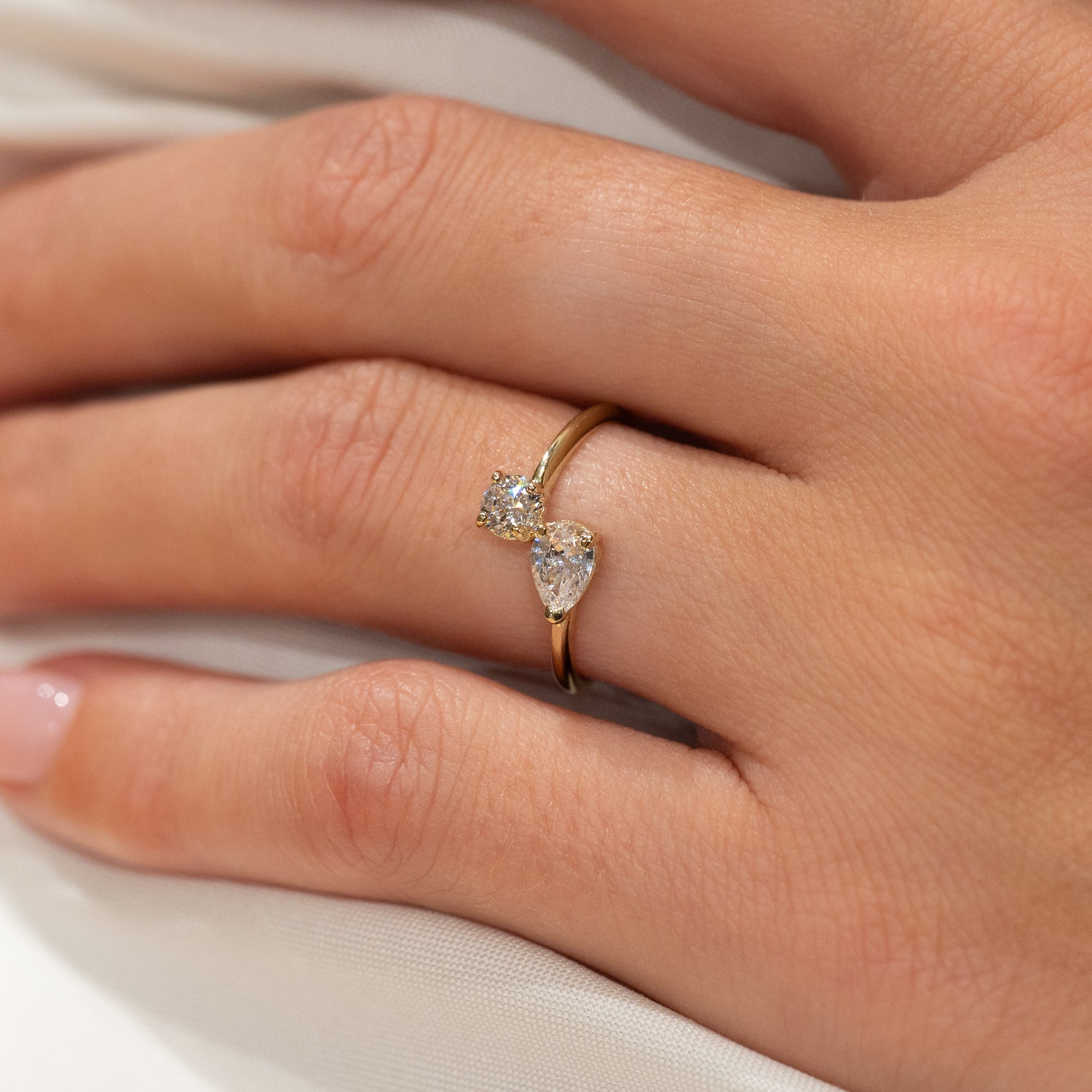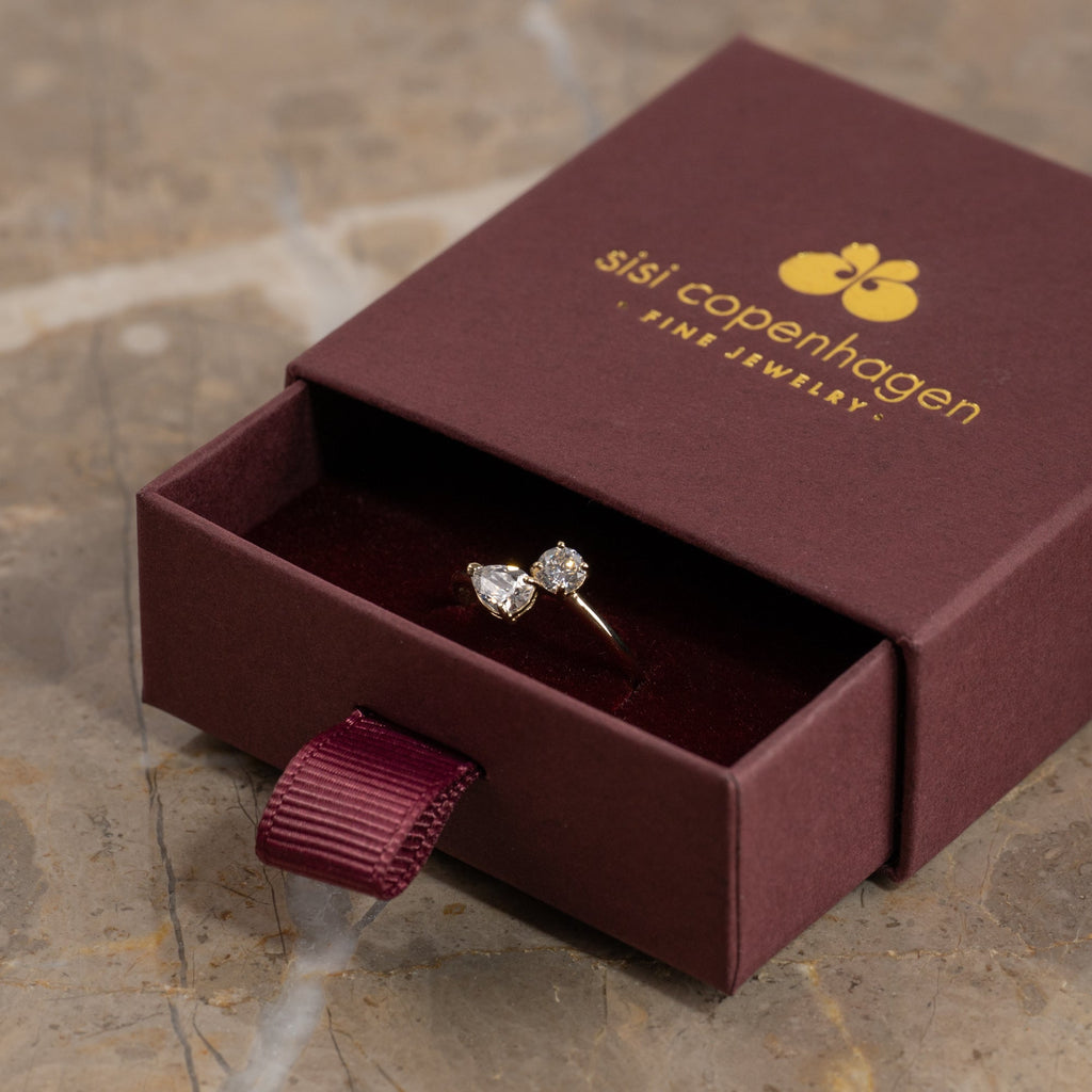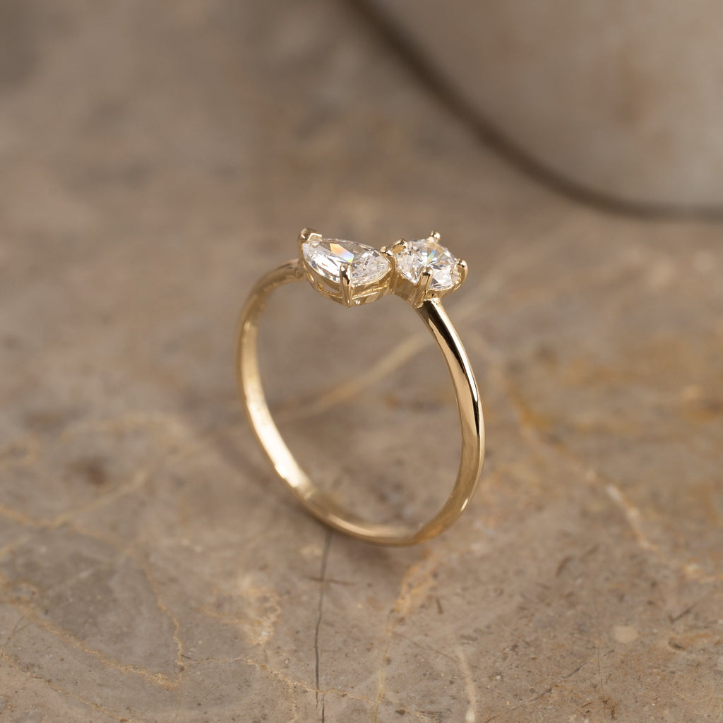 En fin och feminin ring med en rund och en päronformad zirkon, placerade asymmetriskt för ett unikt och elegant utseende.