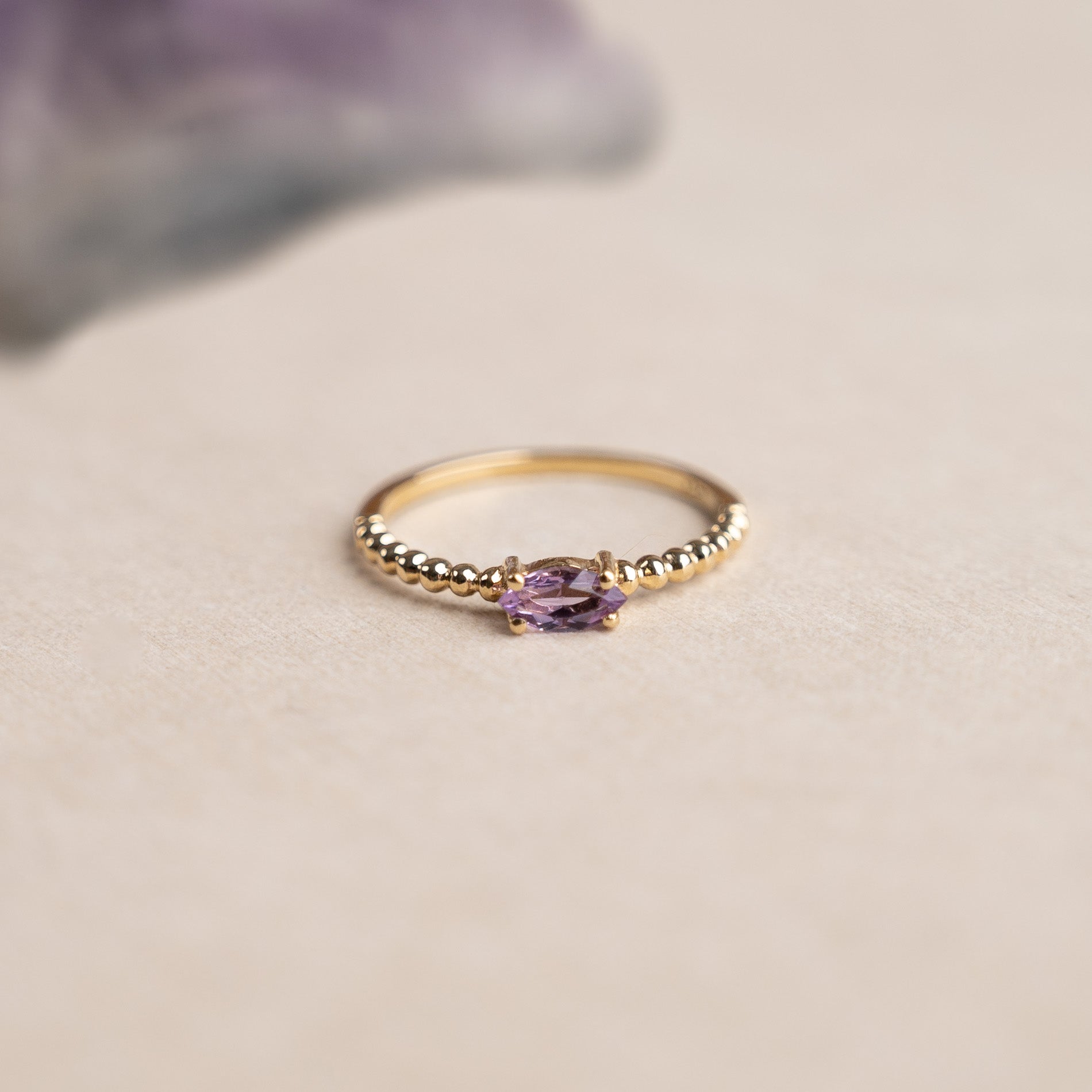Den lila ametisten är en tidlös halvädelsten med en vacker lila nyans. Framsidan av ringen har små kulor med en platt baksida, vilket ger designen en feminin detalj.
