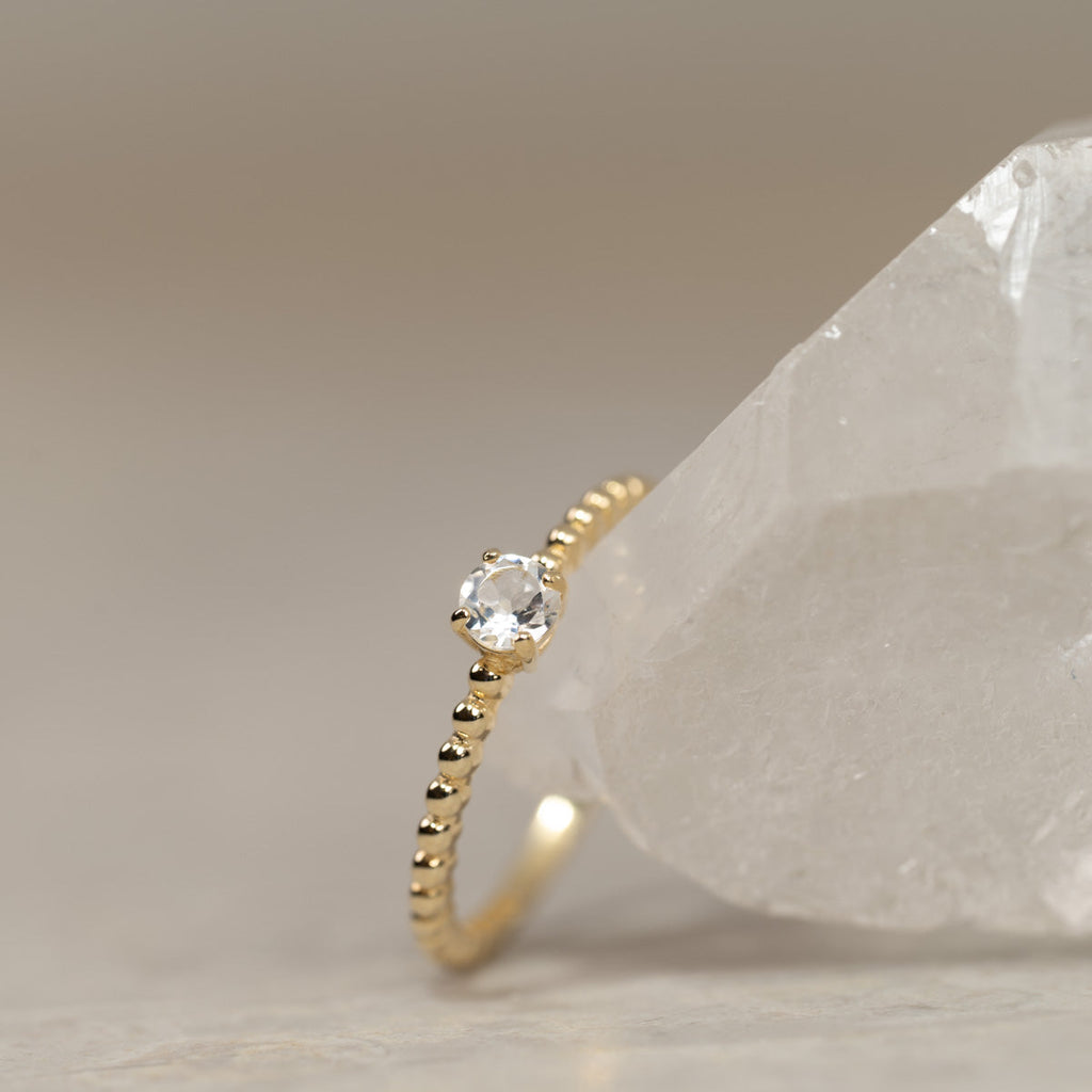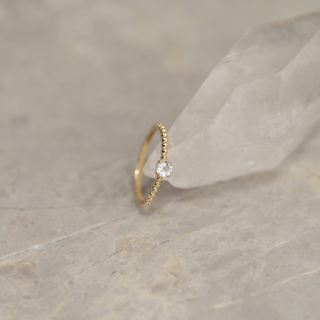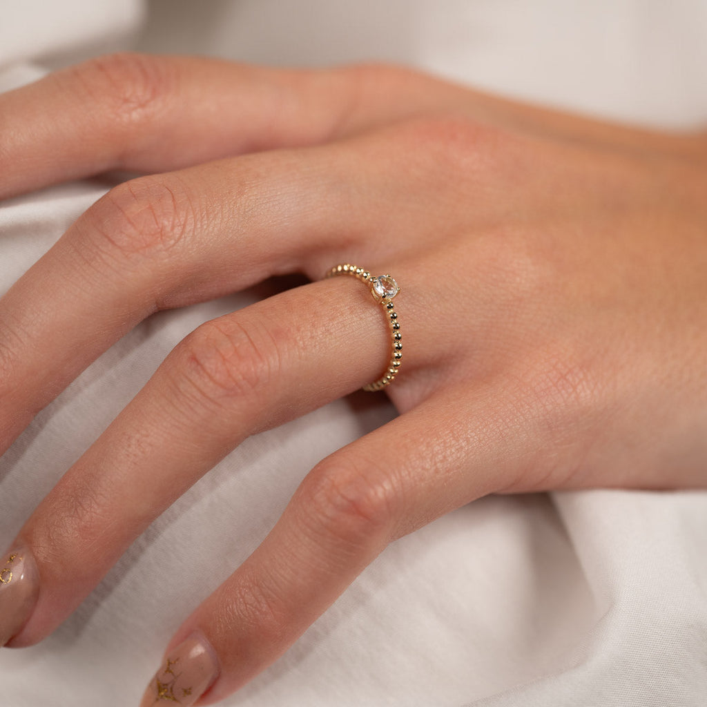Ringen är i 100% återvunnet massivt 9 karats guld. Ringen är otroligt elegant och sticker ut lite med sin ovanliga design. Ringen har små kulor med en platt baksida, vilket skapar fina detaljer. Dessutom finns det en kubisk zirkoniasten i mitten som gör ringen mer feminin.