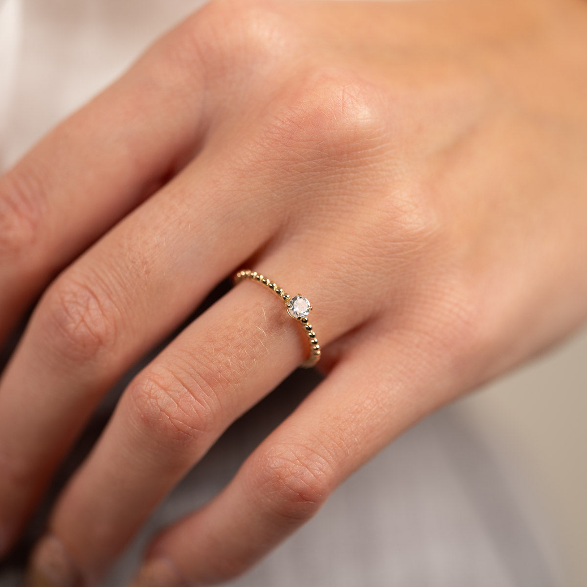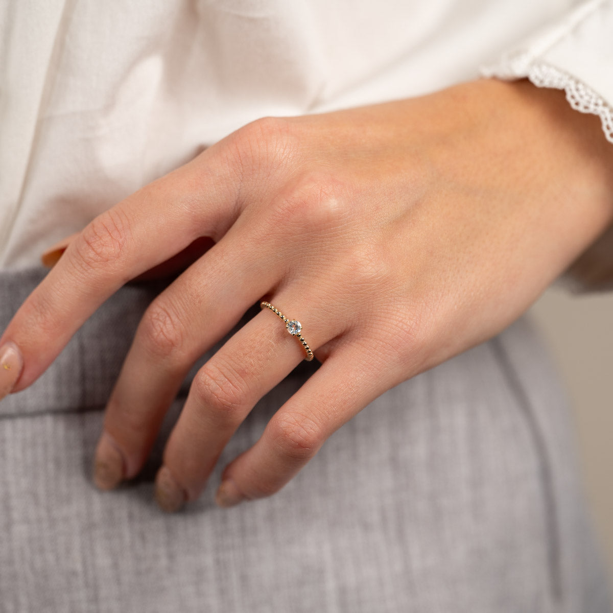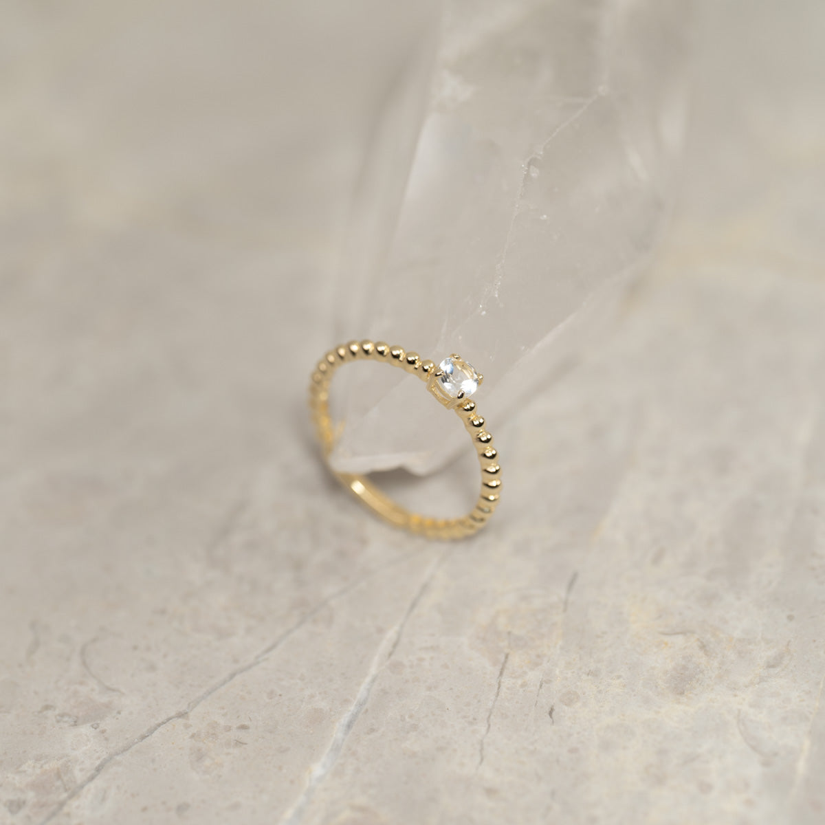 Ringen är i 100% återvunnet massivt 9 karats guld. Ringen är otroligt elegant och sticker ut lite med sin ovanliga design. Ringen har små kulor med en platt baksida, vilket skapar fina detaljer. Dessutom finns det en kubisk zirkoniasten i mitten som gör ringen mer feminin.
