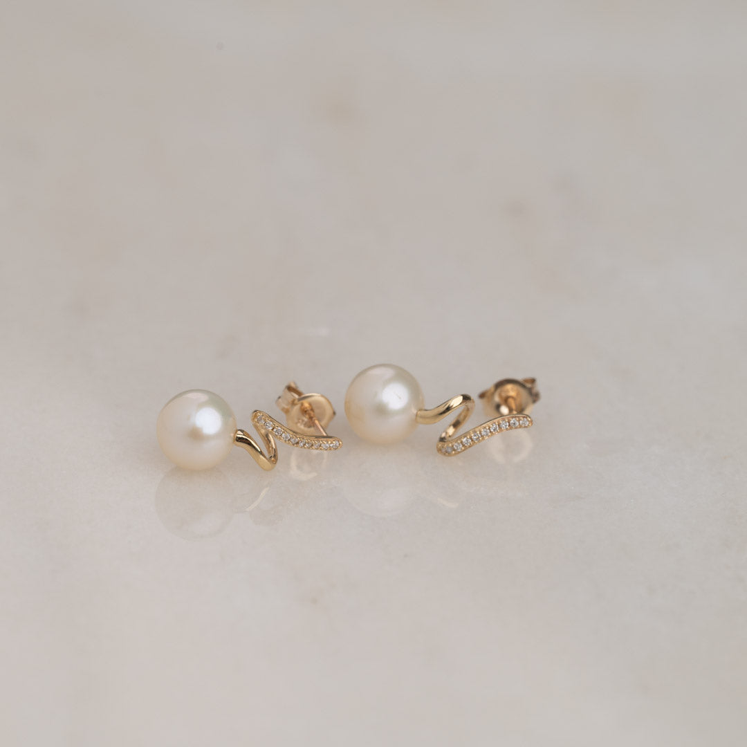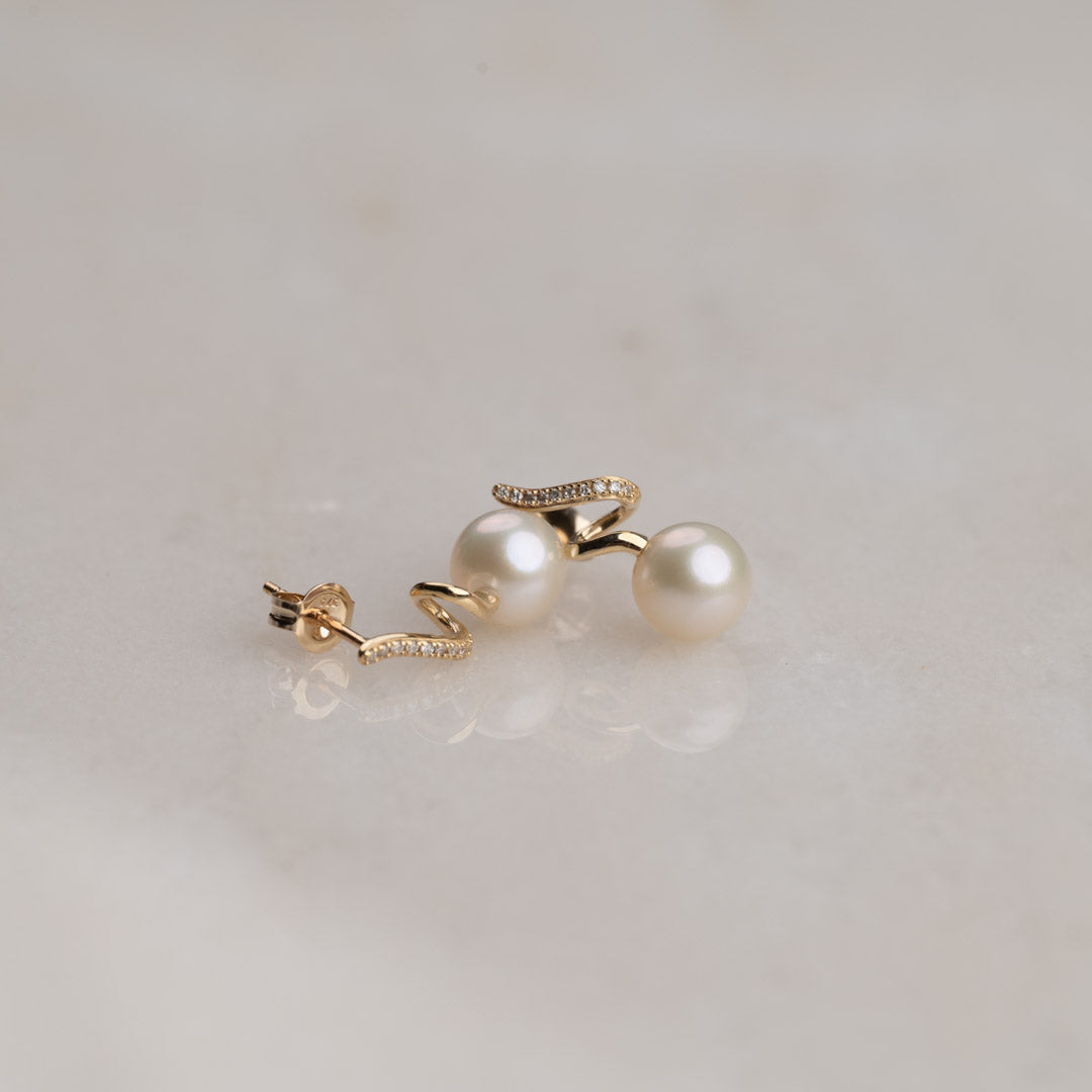 Örhängena är designade som slingrande örhängen med diamanter och runda 7,5 mm sötvattenspärlor i var sitt ände av örhänget. Den slingrande designen skapar en lätt och lekfull effekt på örhängena, vilket i kombination med de glittrande diamanterna och de fina vita pärlorna ger elegans och förfining.