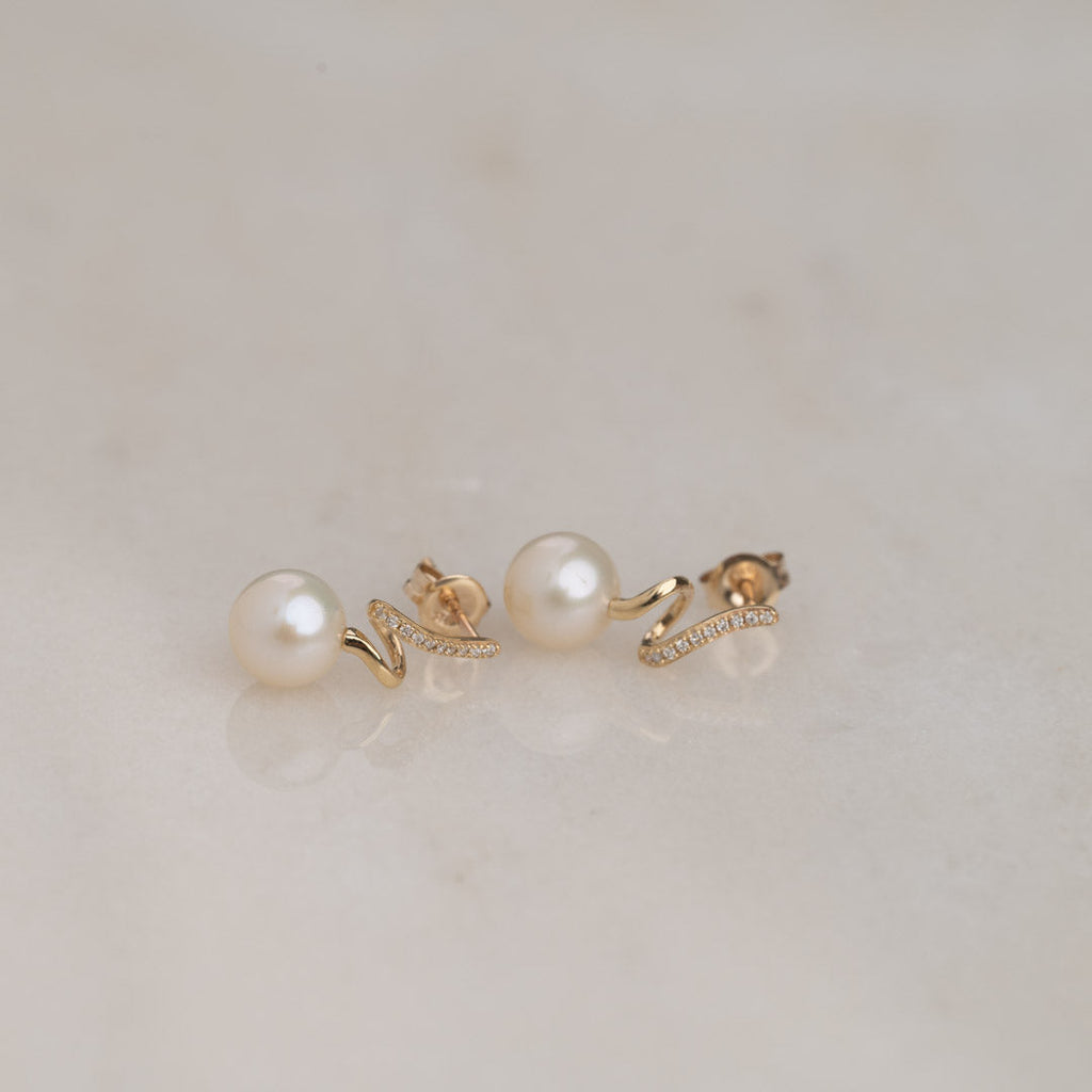 Våra Lora-örhängen är tillverkade av 100% återvunnet 9 karats massivt guld med vita sötvattenspärlor och äkta diamanter.