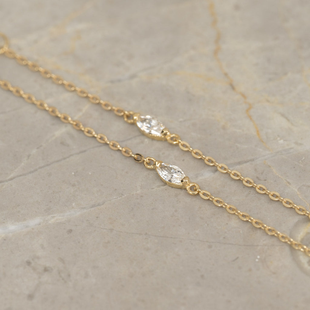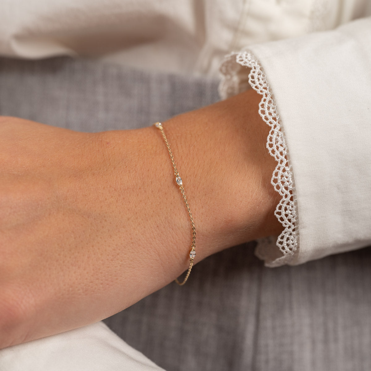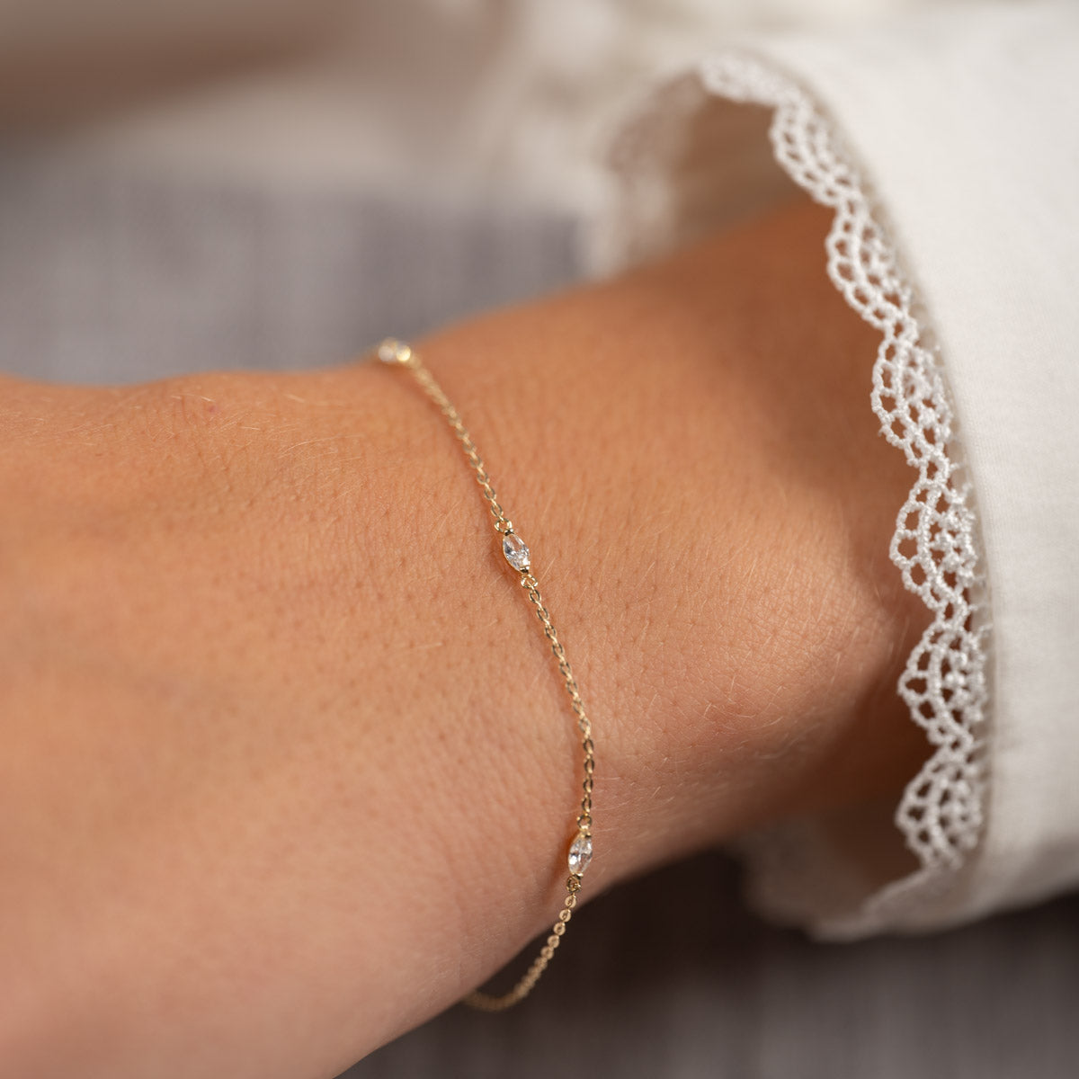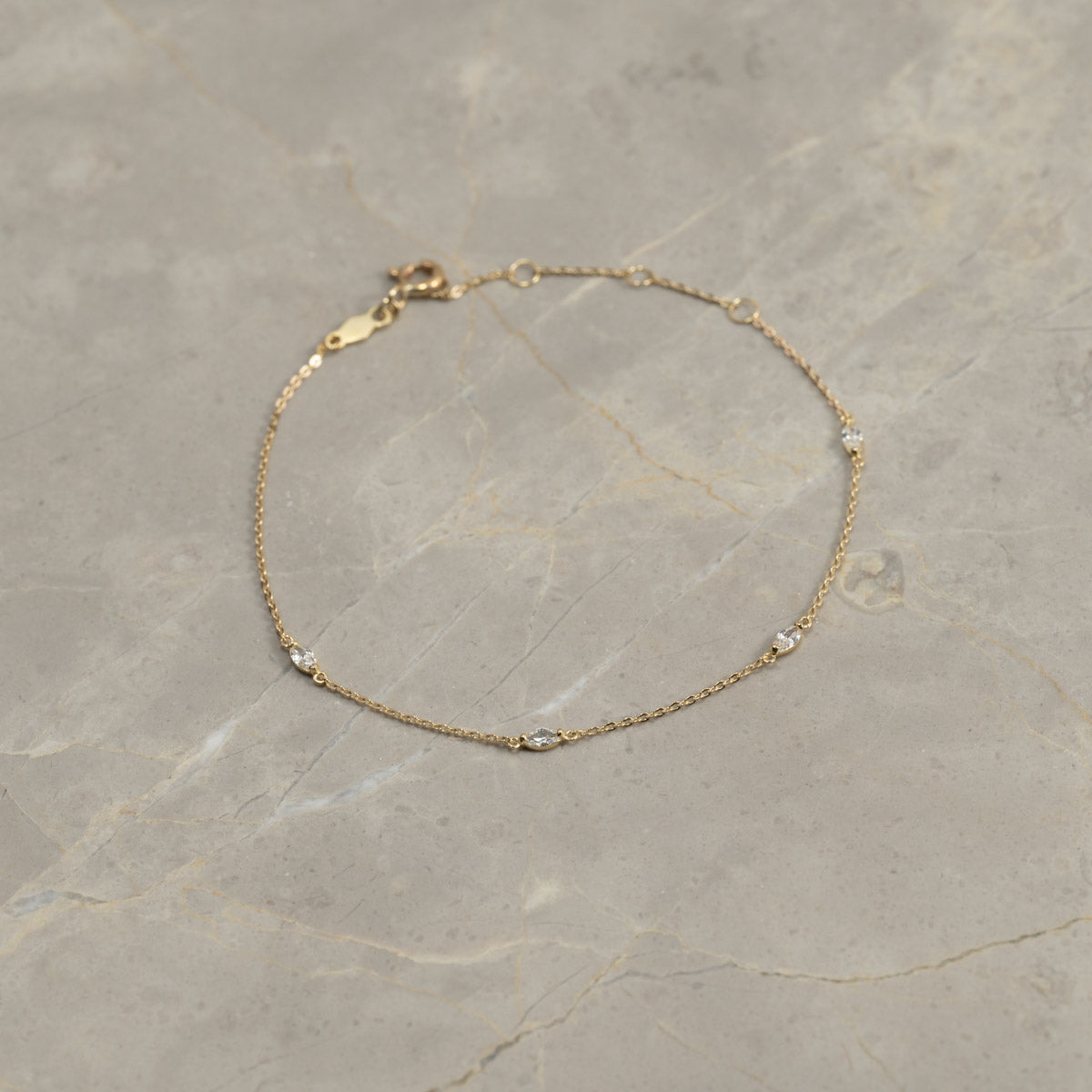 Madeline-armbandet är tillverkat av 100% återvunnet massivt 9 karats guld med fyra vackra marquise-slipade vita kubiska zirkoniastenar.