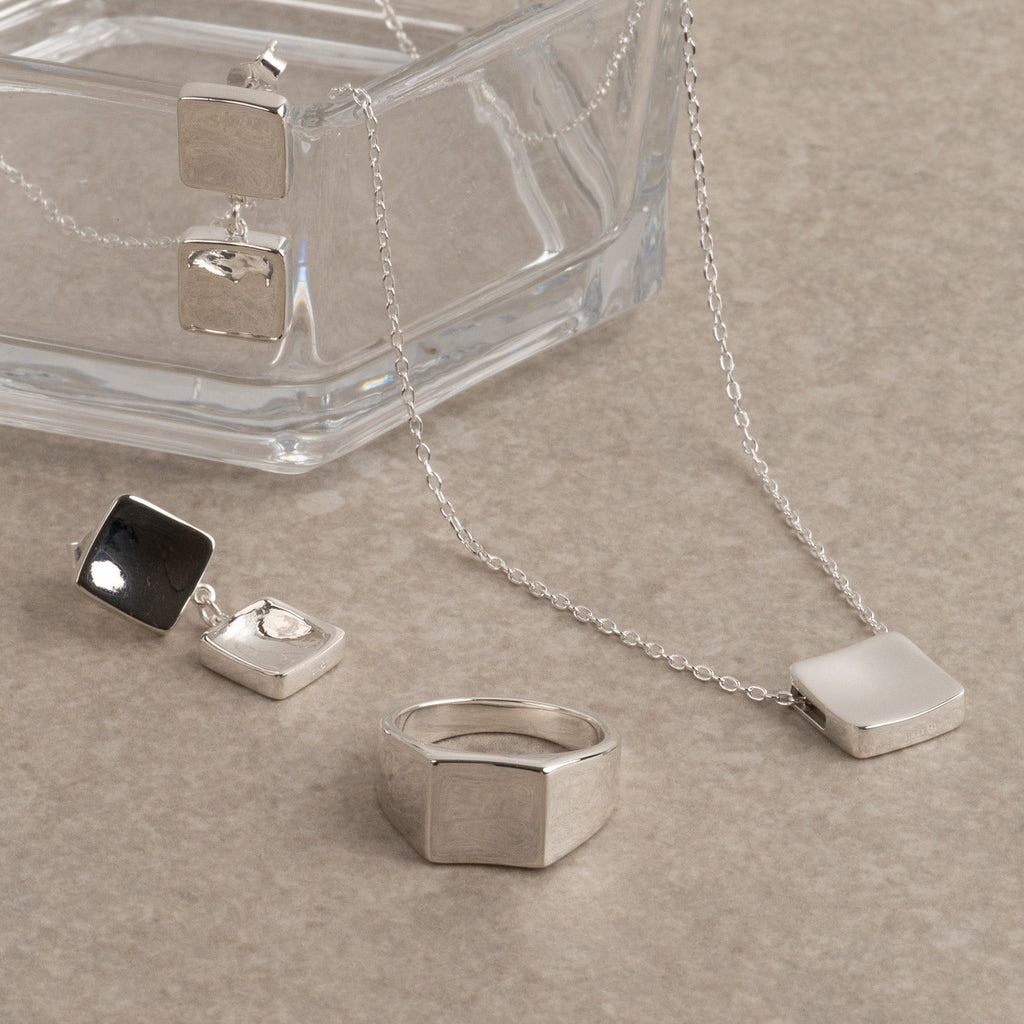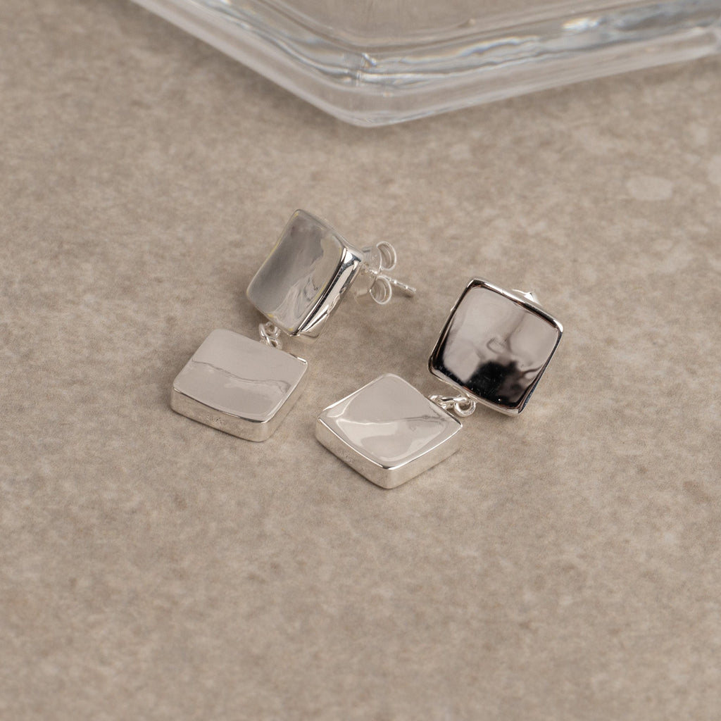 Örhängen i 100% återvunnet 925 sterlingsilver med en retroinspirerad design. De består av två kvadrater med rundade hörn och mjuka former, sammanlänkade för att skapa ett lätt och rörligt uttryck.