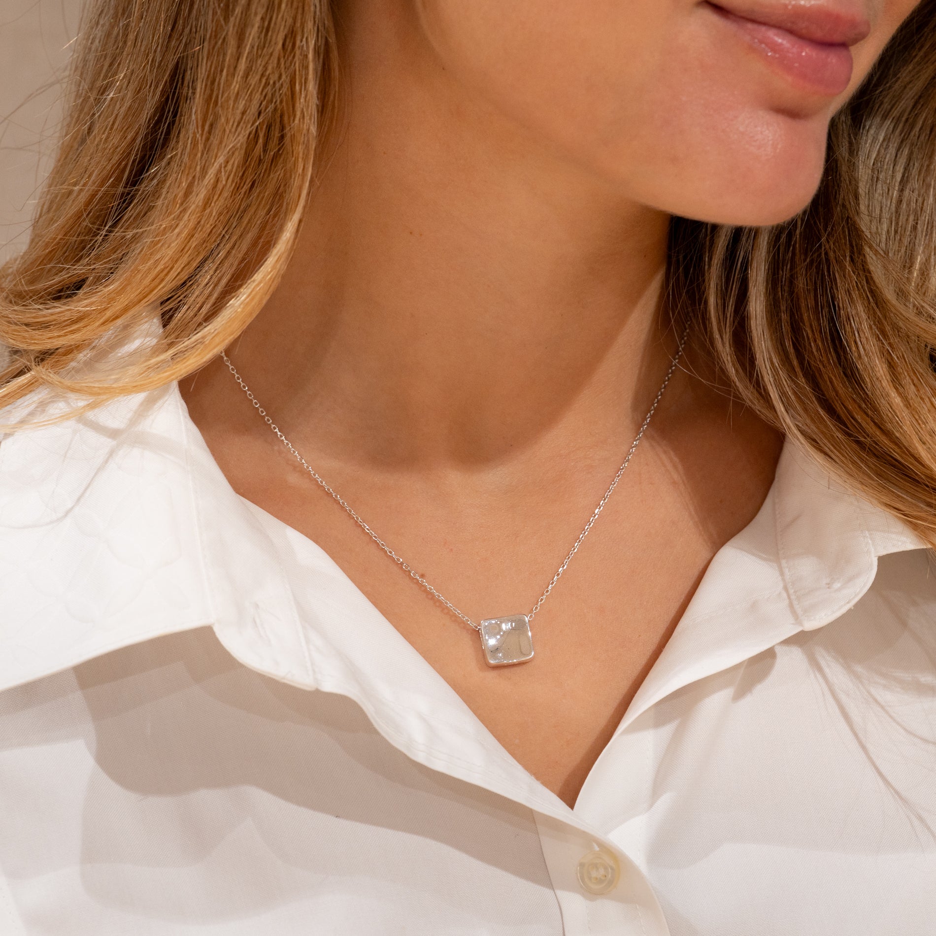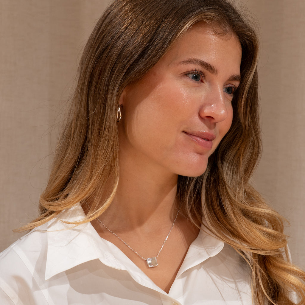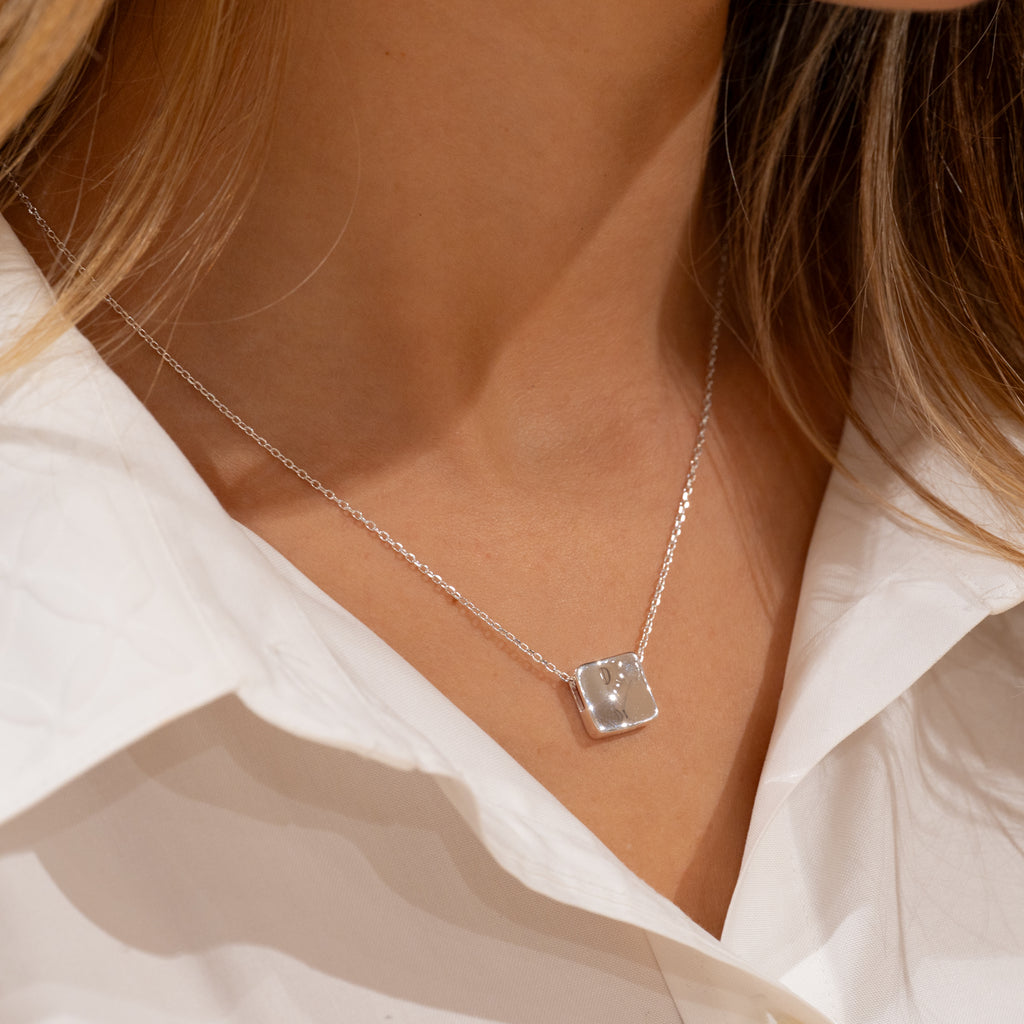 Den fyrkantiga formen med rundade hörn skapar ett mjukt och retroinspirerat uttryck. Berlocken mäter 12 x 12 mm och har en slide-in-öppning på ca. 4,3 mm, vilket gör det enkelt att trä på ett halsband.