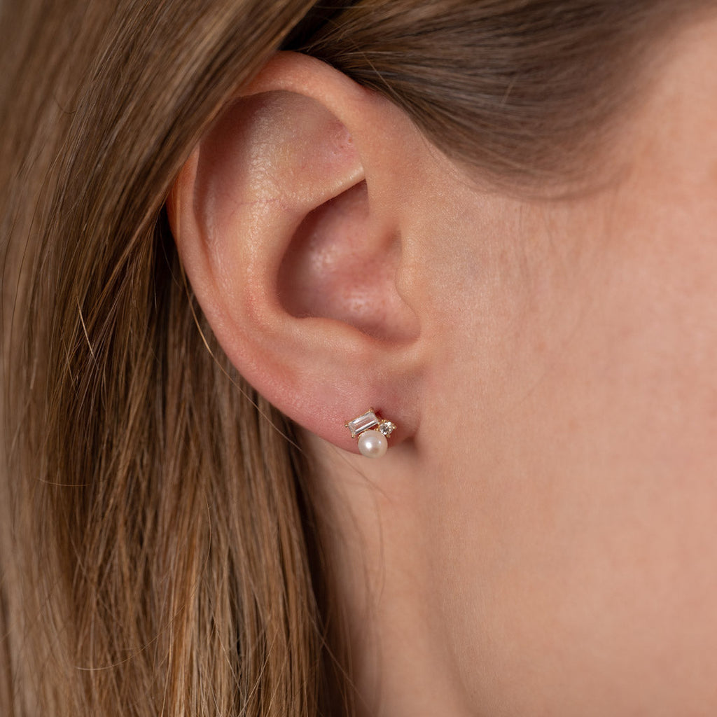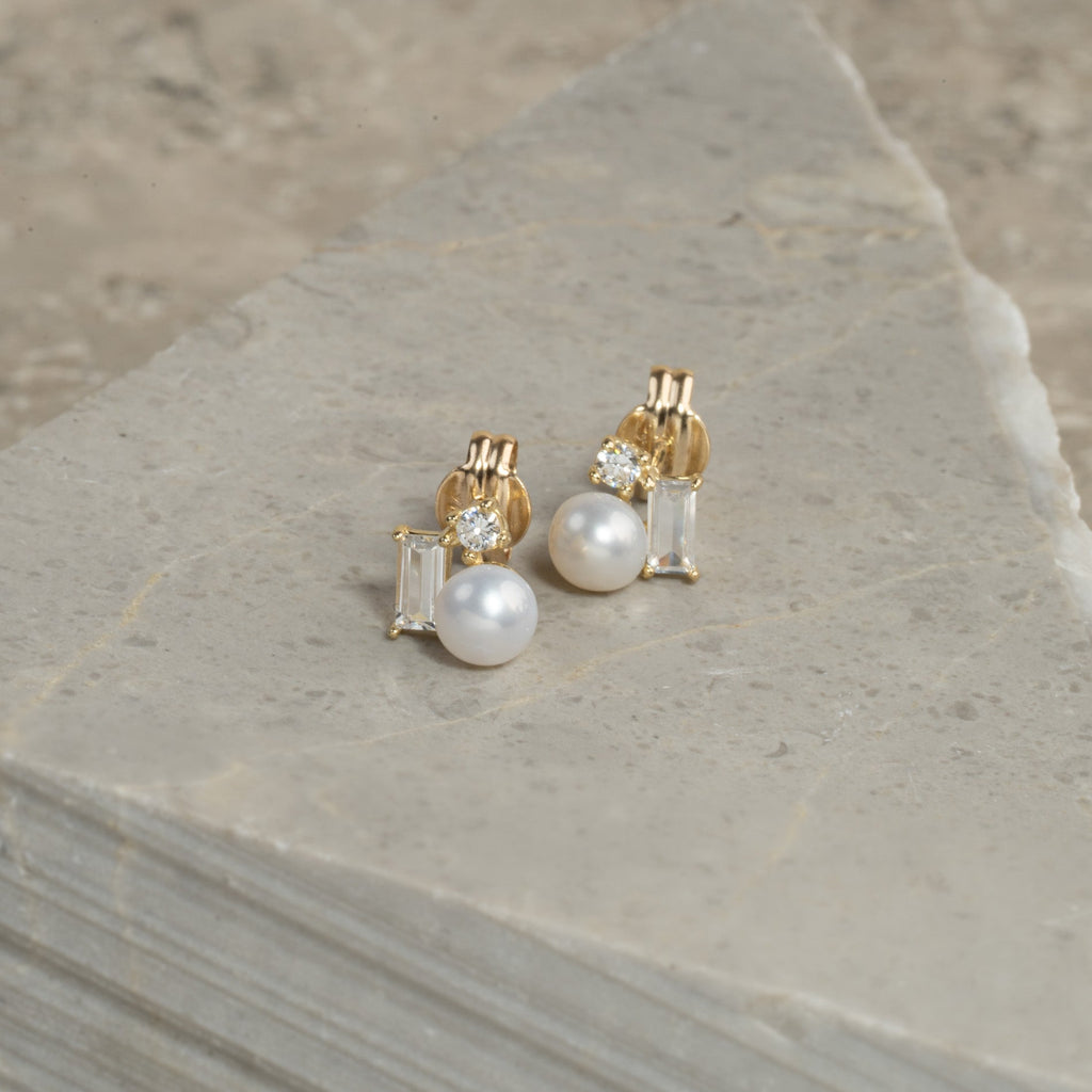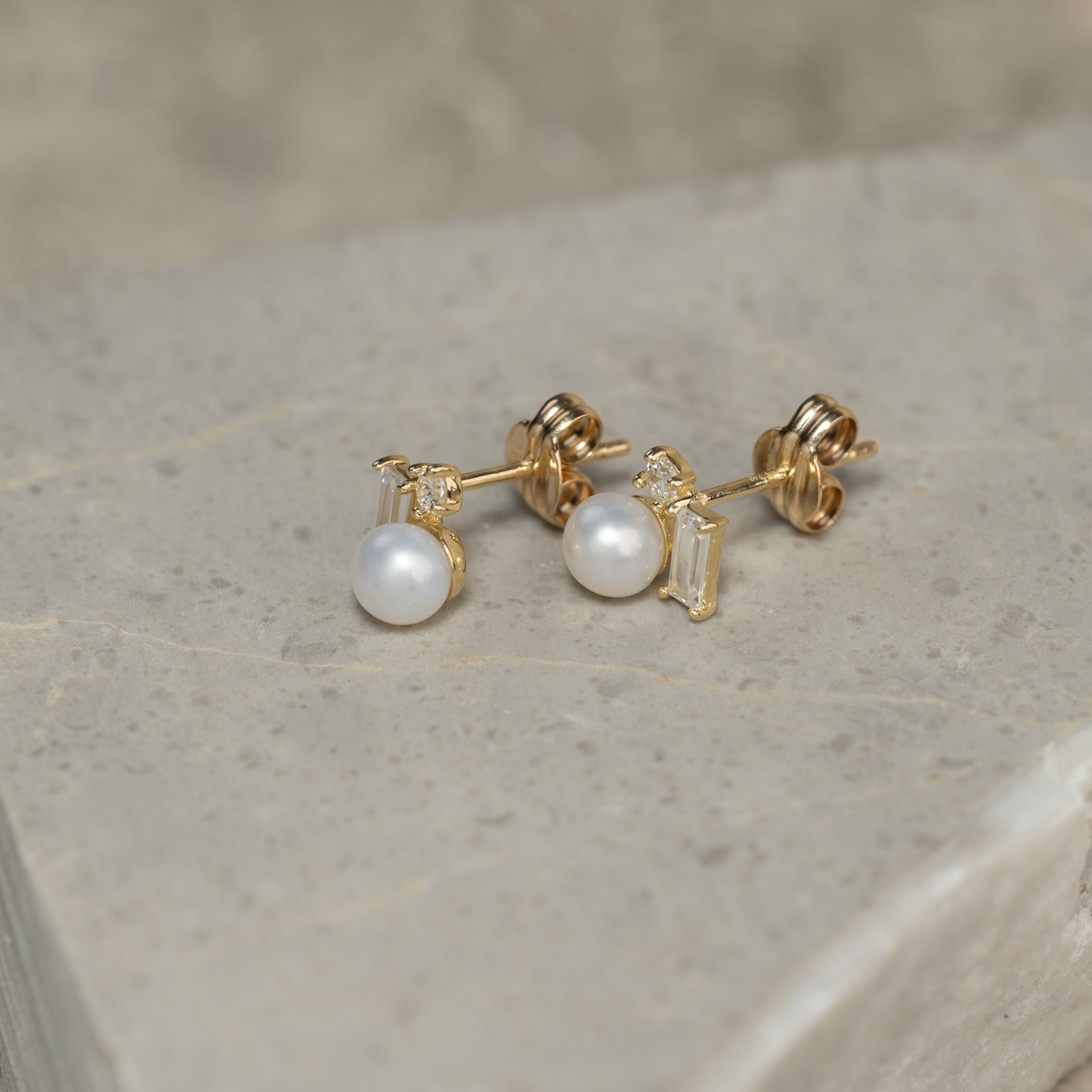Maeve örhängena har en feminin design med en vit sötvattenspärla, en liten klar rund zirkon och en baguettslipad zirkon. Detta har skapat en klassiskt design.