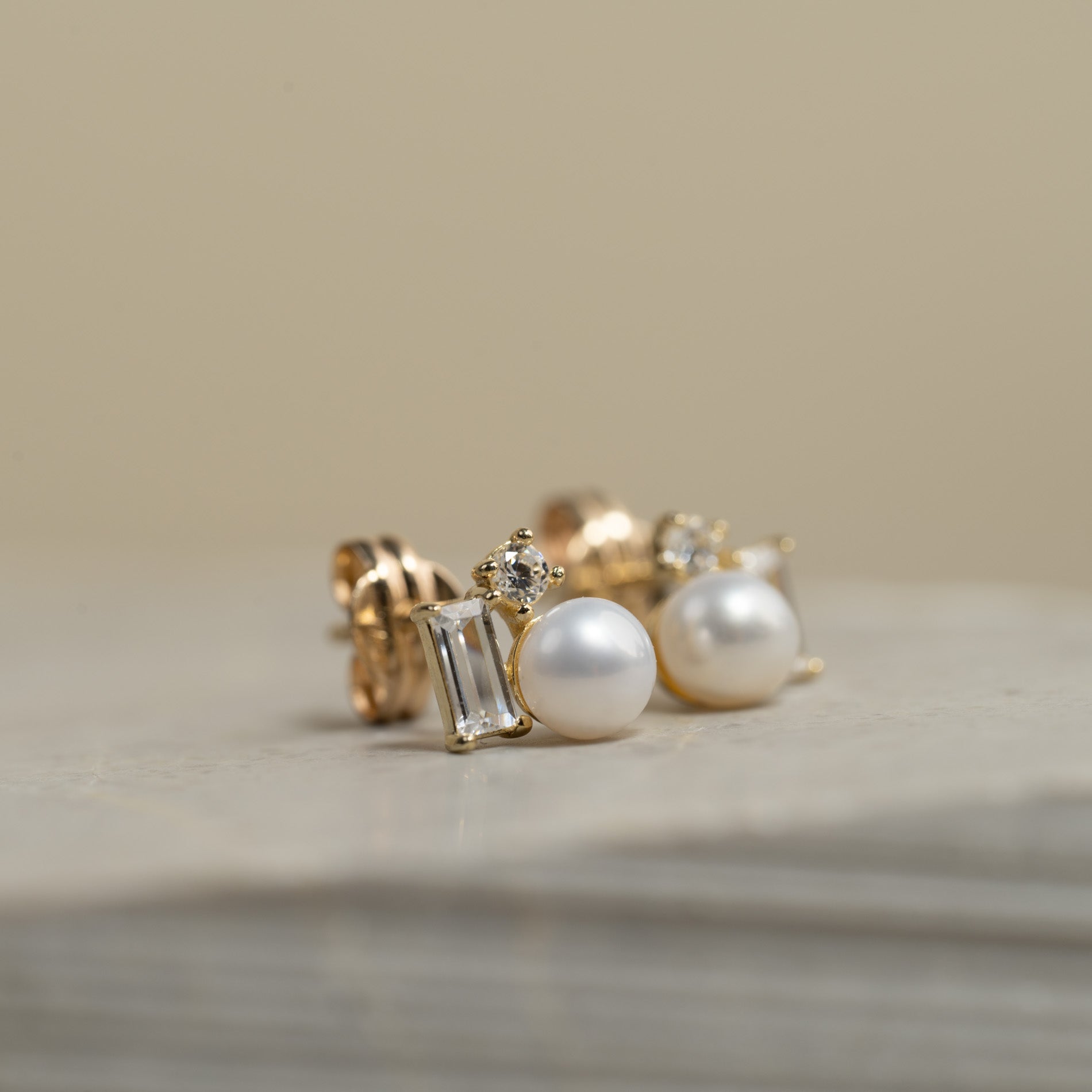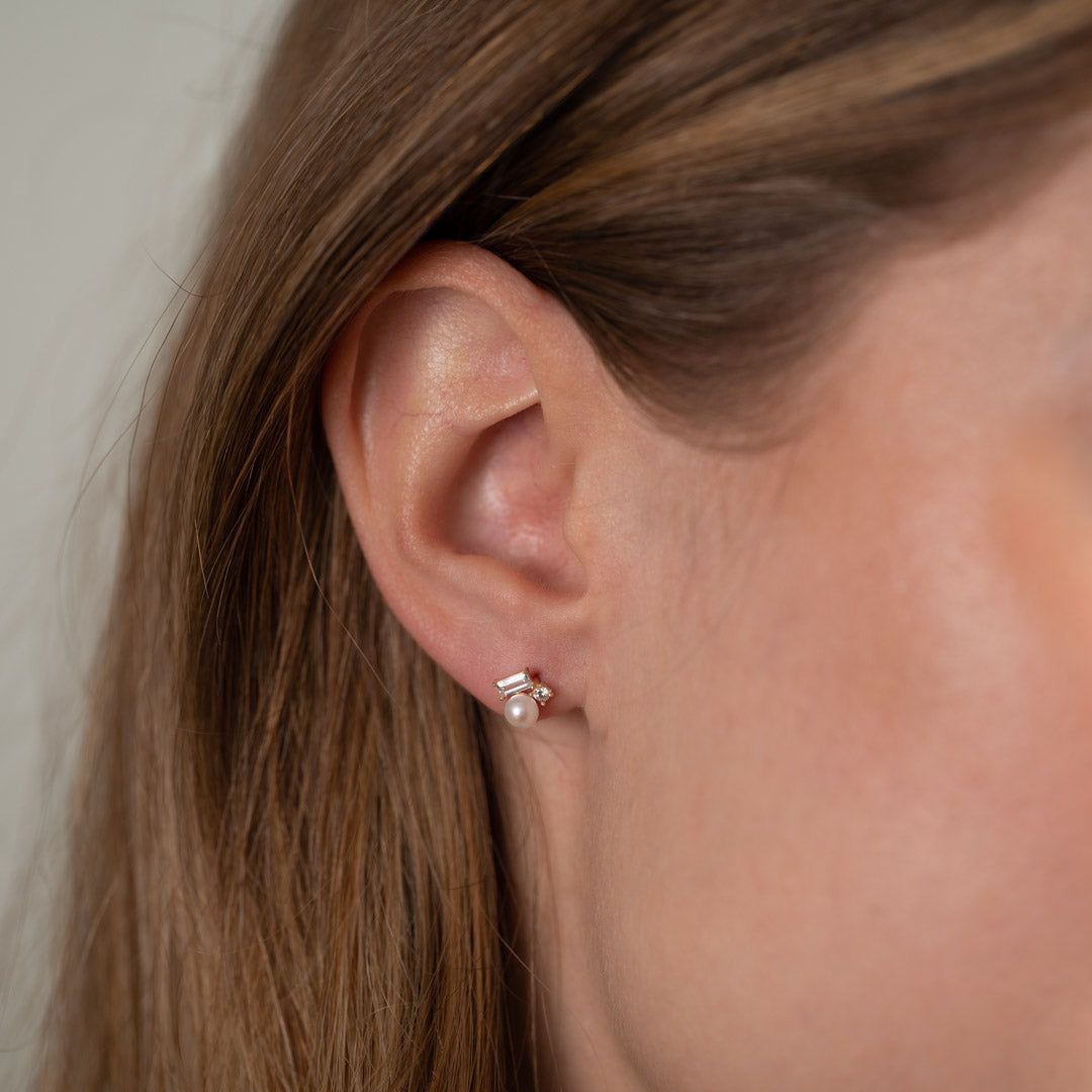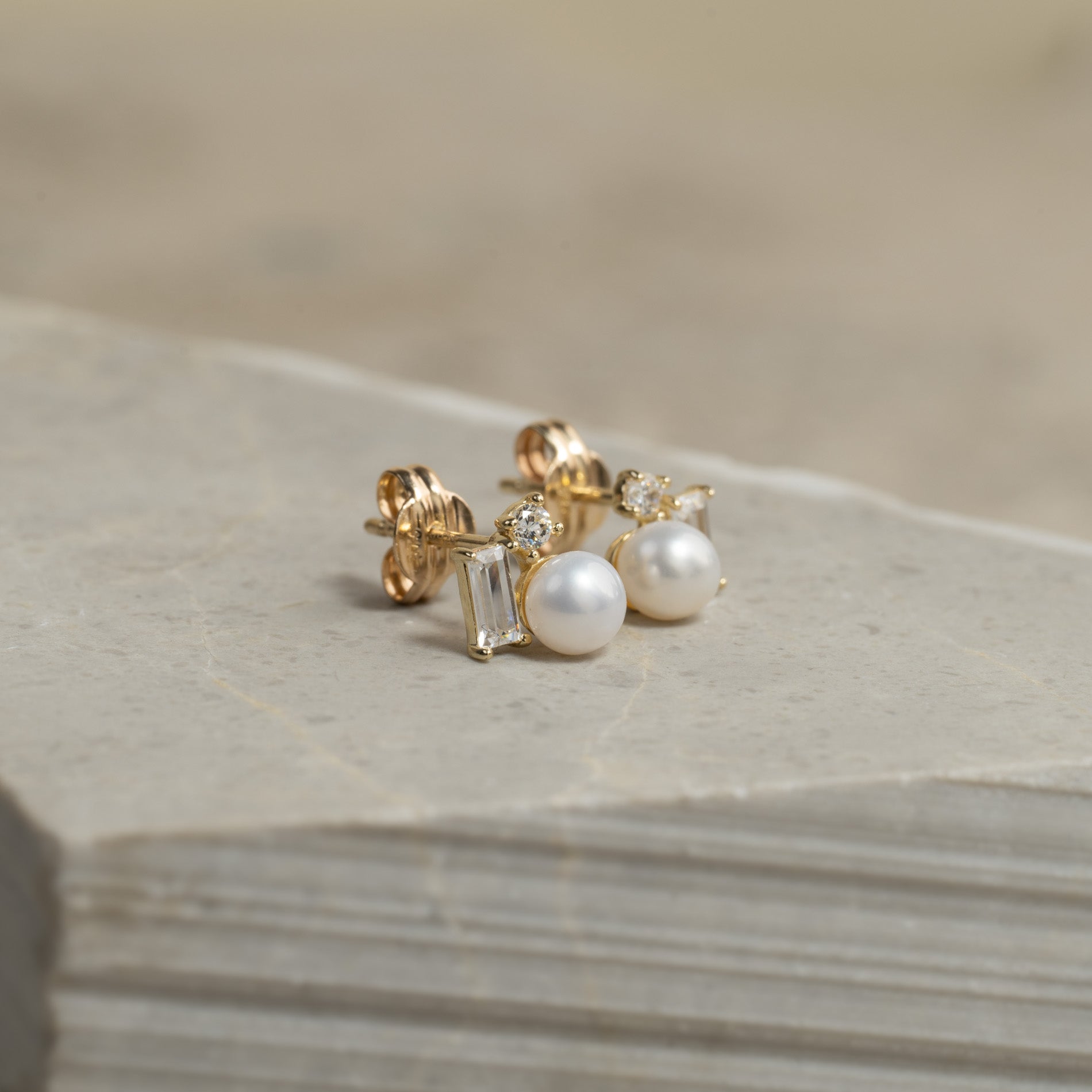 Maeve örhängena har en feminin design med en vit sötvattenspärla, en liten klar rund zirkon och en baguettslipad zirkon. Detta har skapat en klassiskt design.