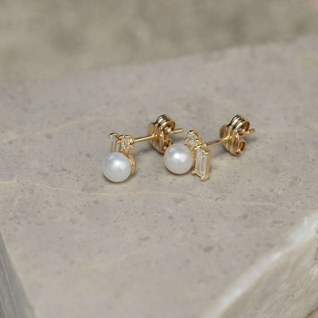 Örhängena i 100% återvunnet 9 karats fast guld med sötvattenpärla och liten zirkon. Den vita pärlan mäter 4mm.
