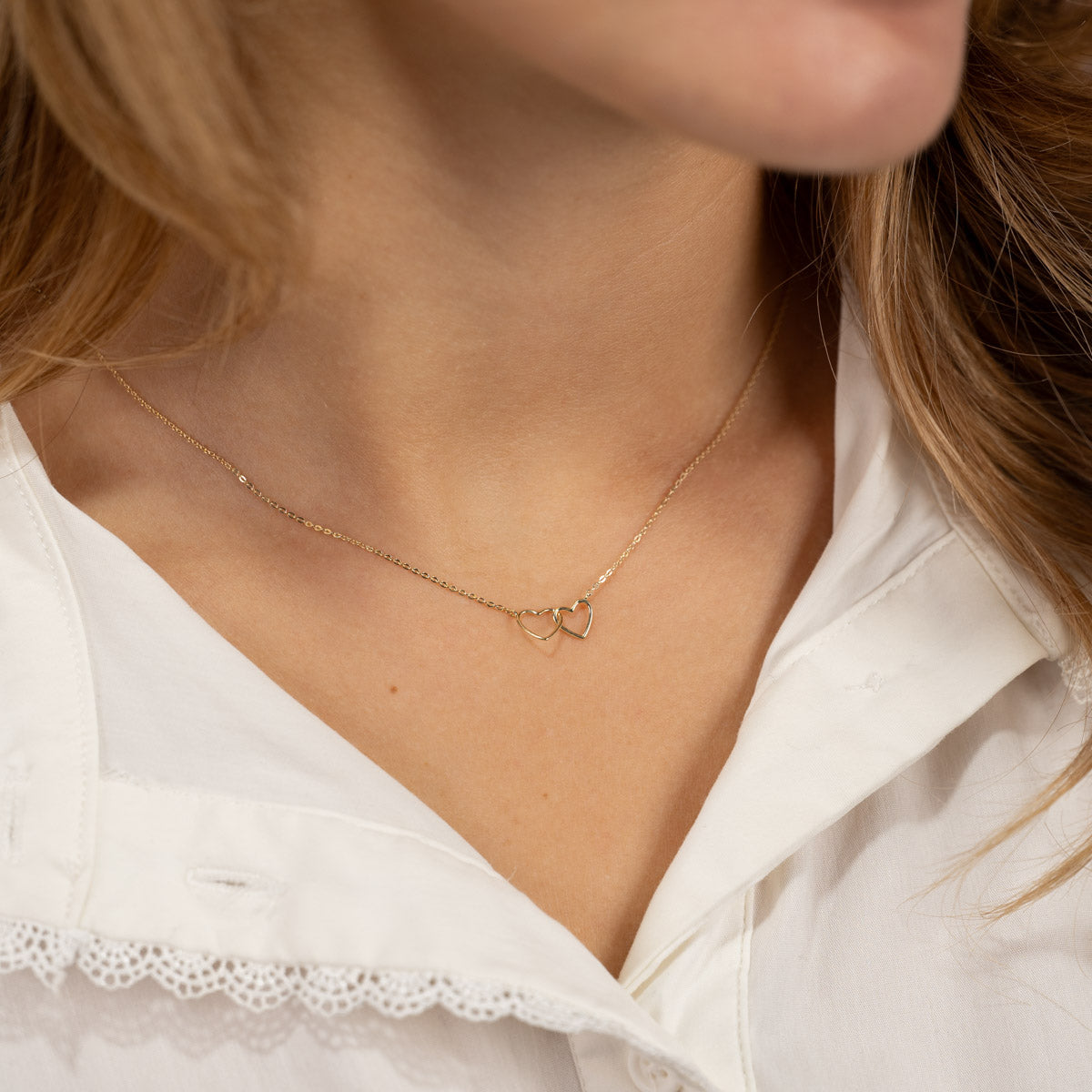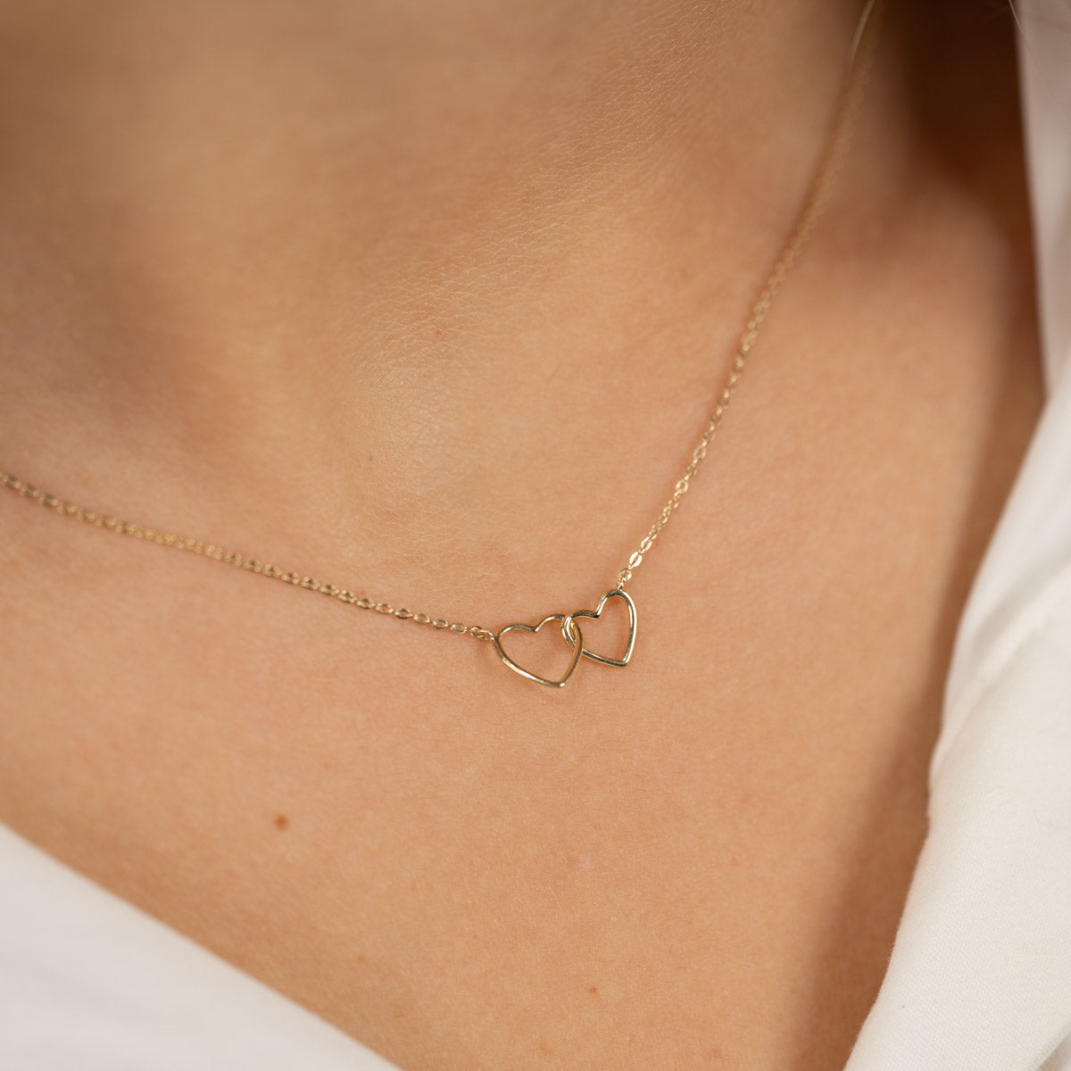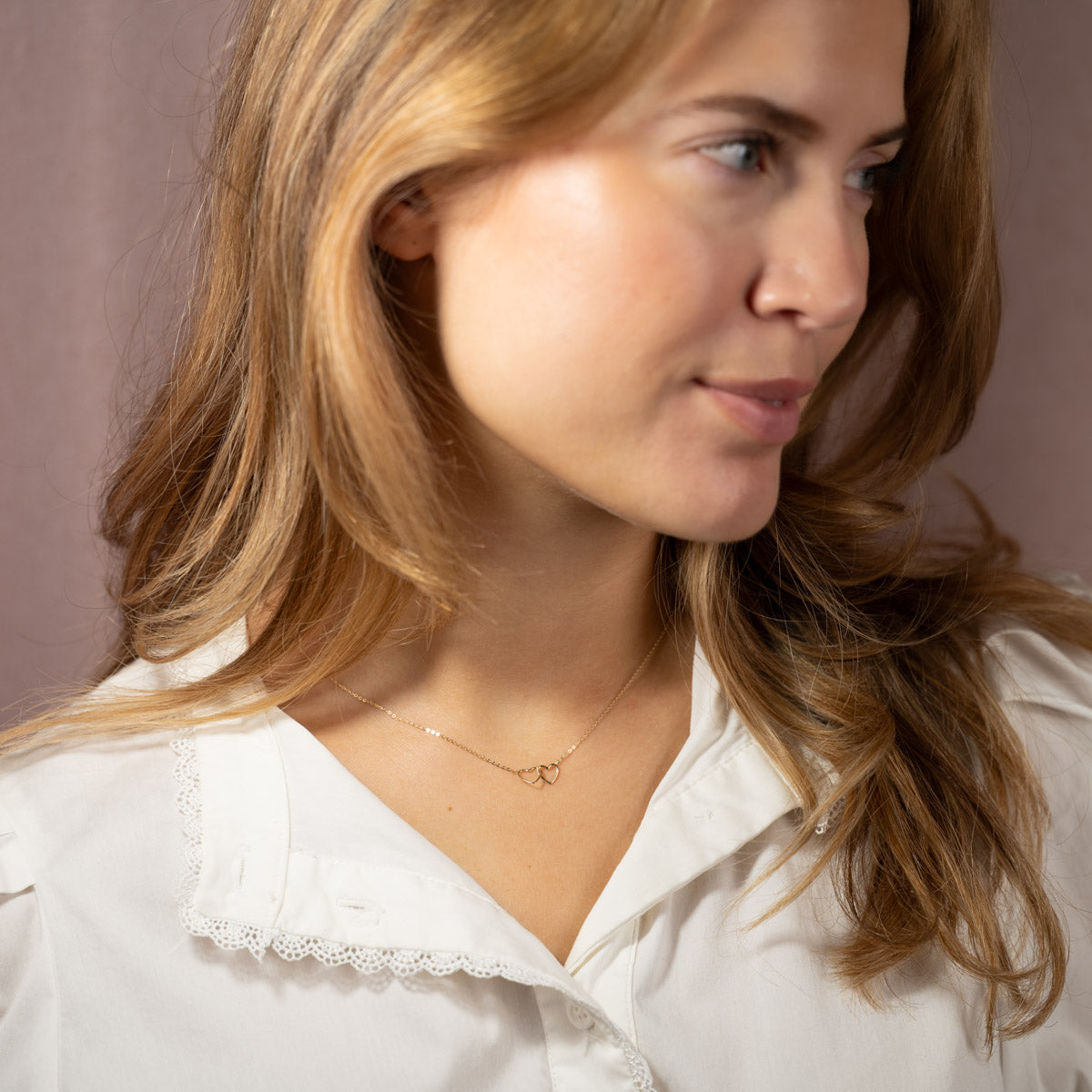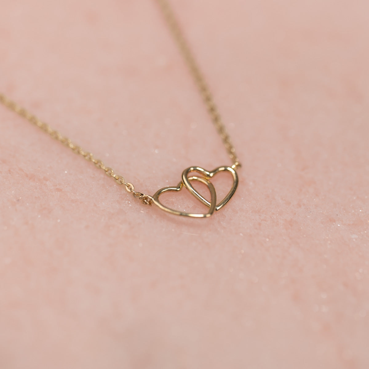 Mila-halsbandet är tillverkat av 100% återvunnet massivt 9 karats guld. I den fina kedjan sitter två sammanlänkade hjärtan, vilket ger ett romantiskt, elegant och feminint uttryck.