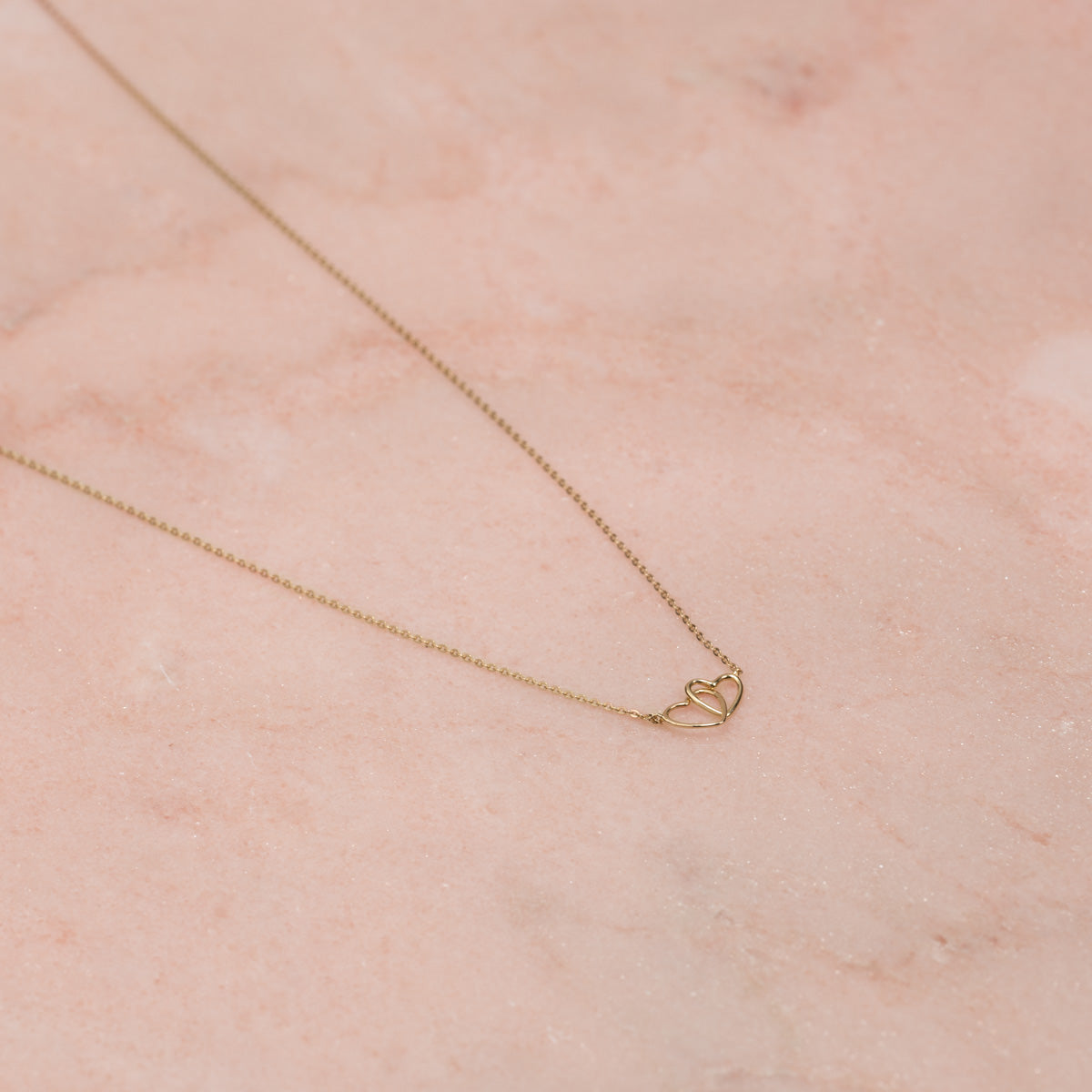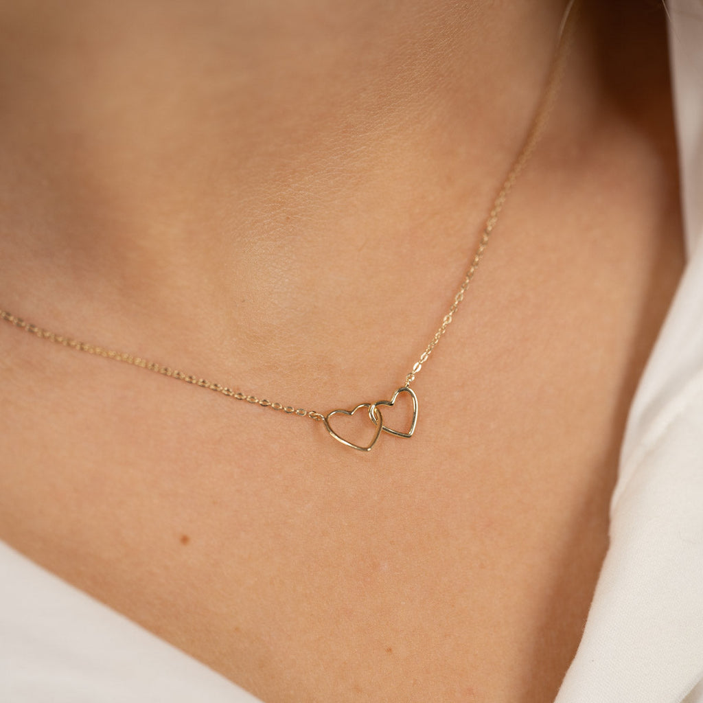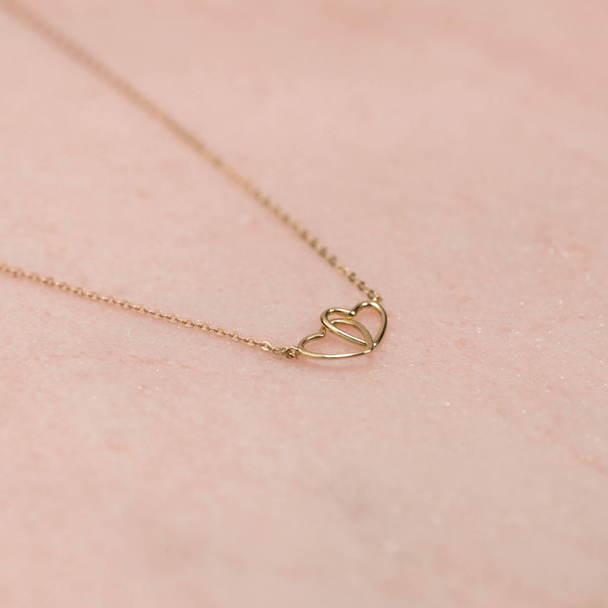 Mila-halsbandet är tillverkat av 100% återvunnet massivt 9 karats guld. I den fina kedjan sitter två sammanlänkade hjärtan, vilket ger ett romantiskt, elegant och feminint uttryck.