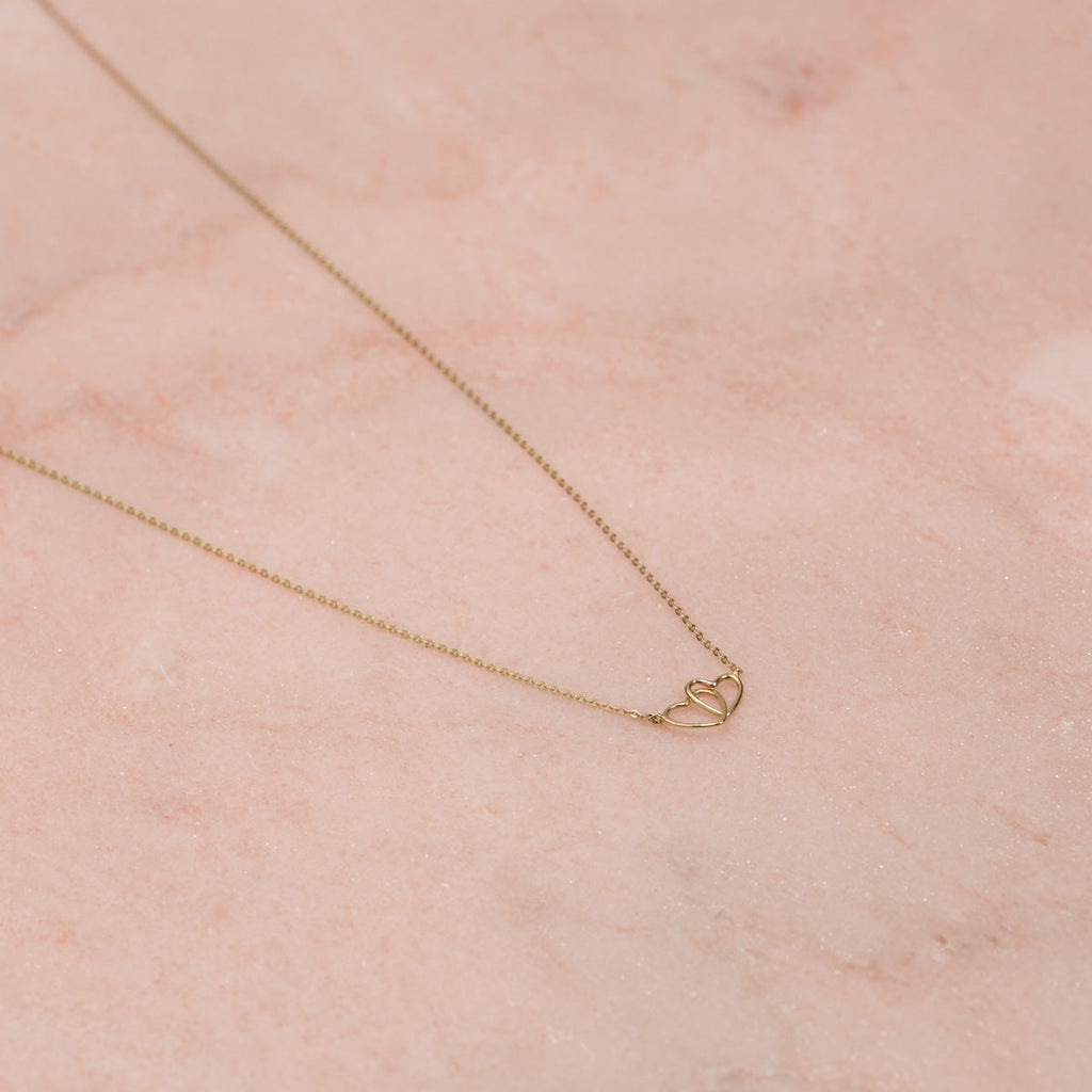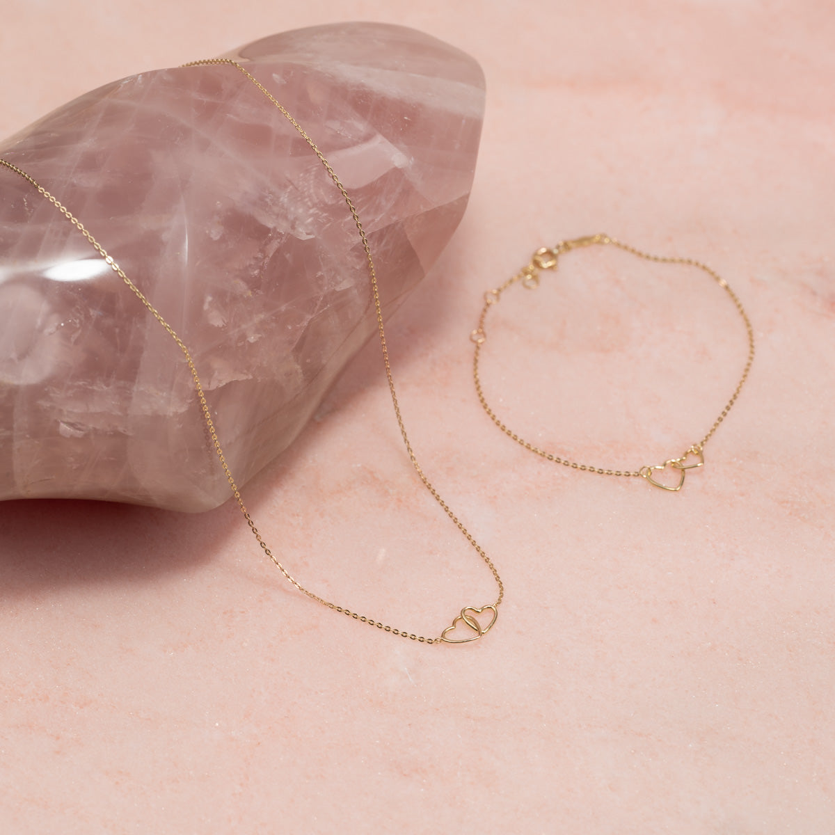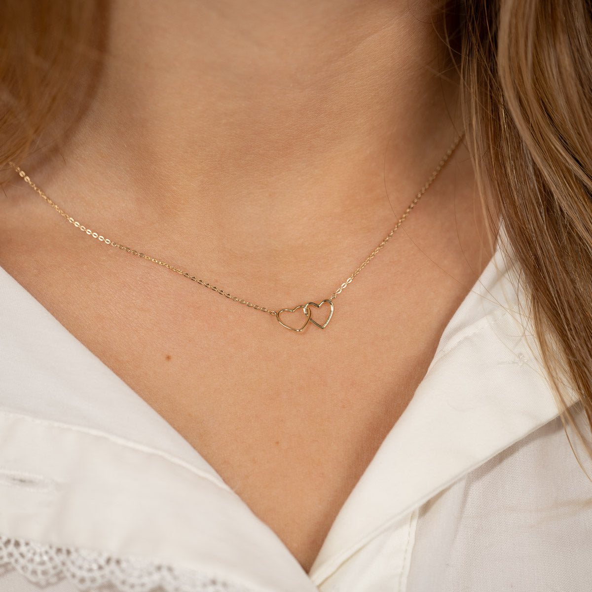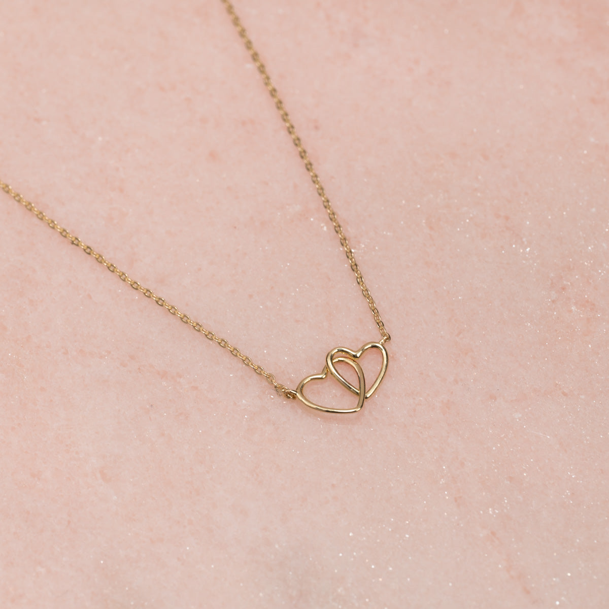 Mila-halsbandet är tillverkat av 100% återvunnet massivt 9 karats guld. I den fina kedjan sitter två sammanlänkade hjärtan, vilket ger ett romantiskt, elegant och feminint uttryck.