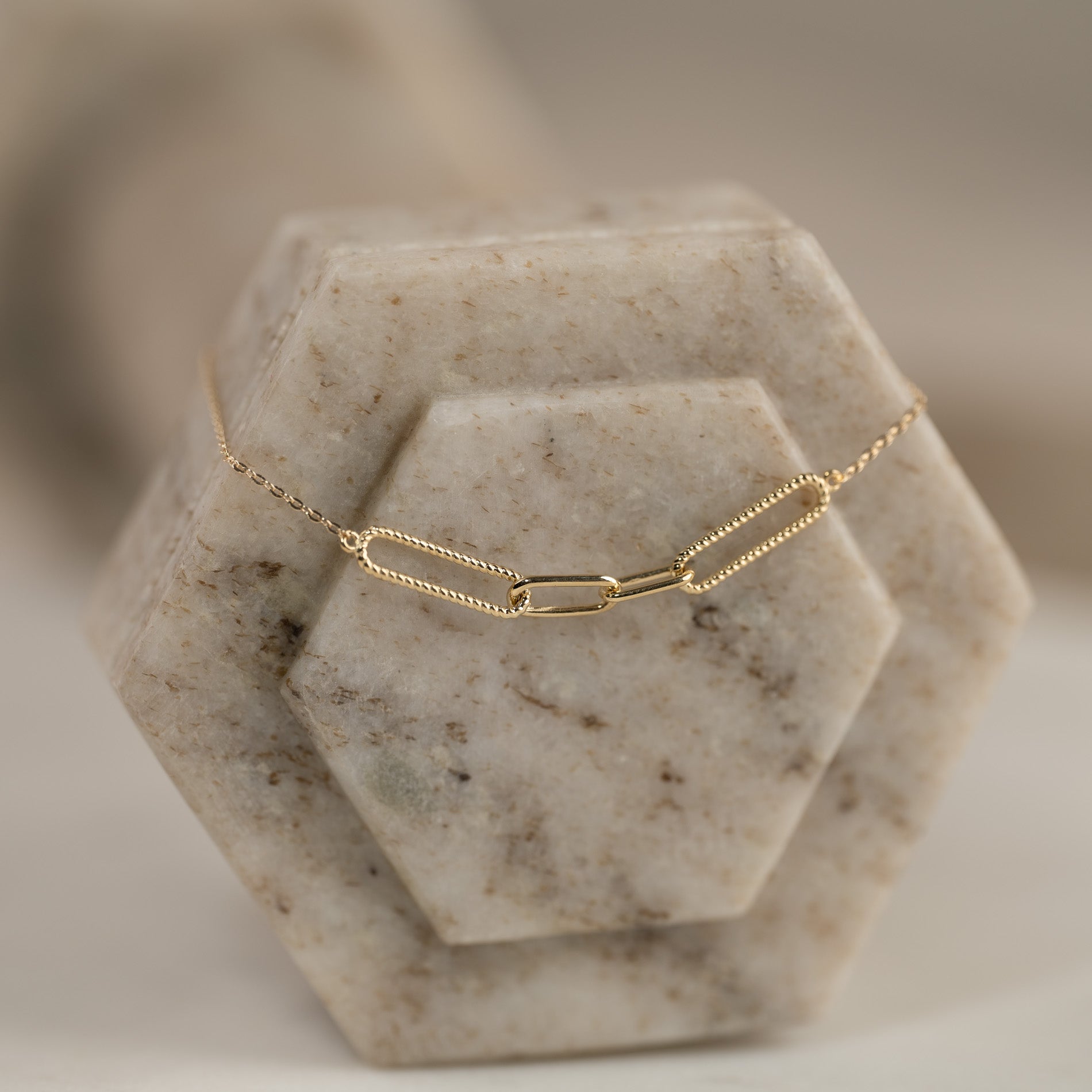 Natalie -armbandet är tillverkat av 100% återvunnet solid 9 karats guld med 4 olika "paperclips" - länkar. Armbandet mäter totalt 20 cm med justeringsringar kan du juster den ner till 16 cm längd.