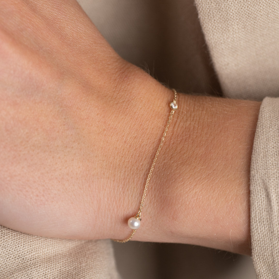 Ett klassiskt och feminint armband med en vit sötvattenspärla och en liten zirkon som ger designen en ljuselegans.