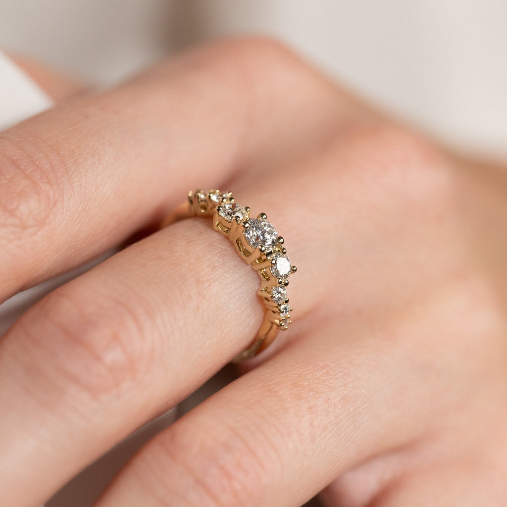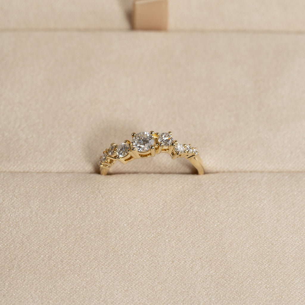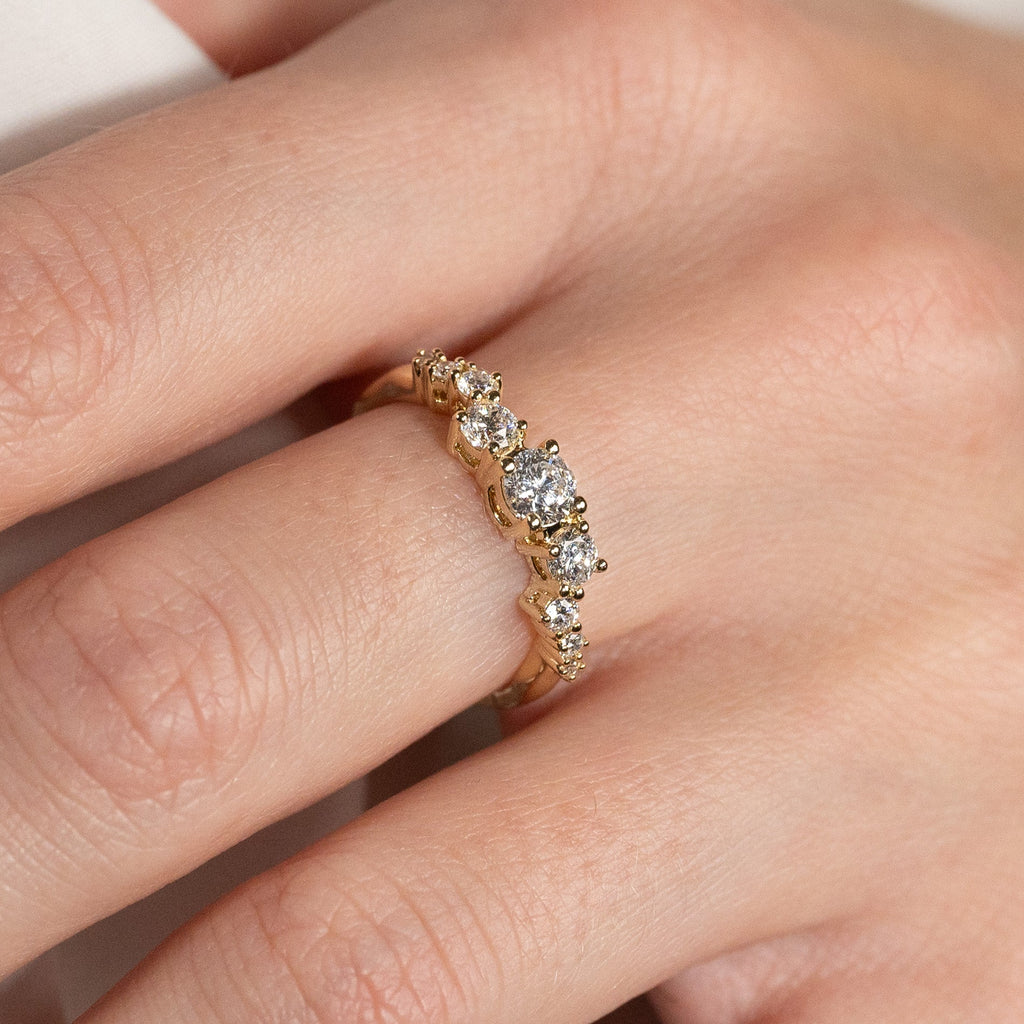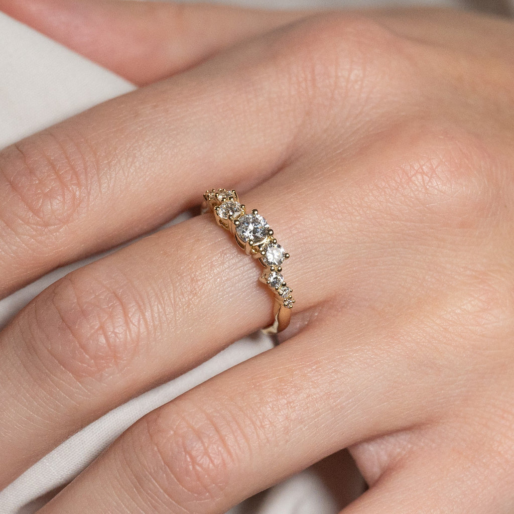 Ring i 14 karat guld med 0,7 ct. labbodlade diamanter i graduerande storlekar; totalt 9 stenar, varav en centersten på 0,3 ct. Infattningen är vackert och dekorativt designad, där stenarna sitter förskjutna från varandra i en avlång klunga. Själva ringskenan har en organisk design som ger en modern twist.