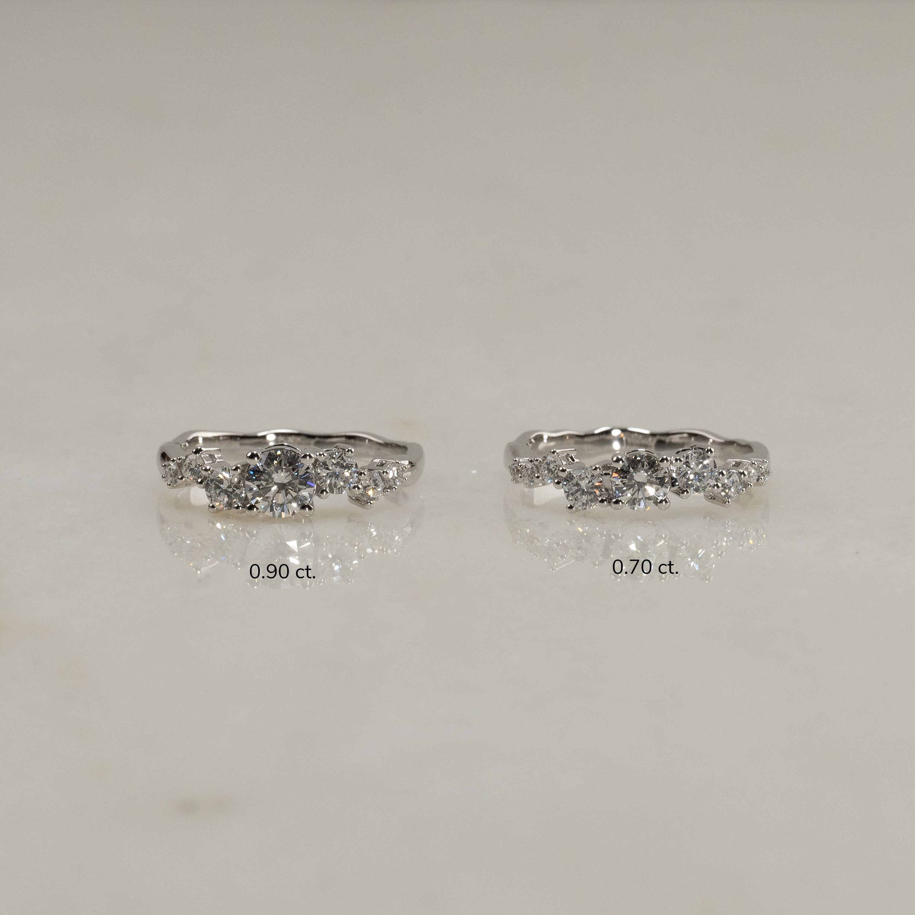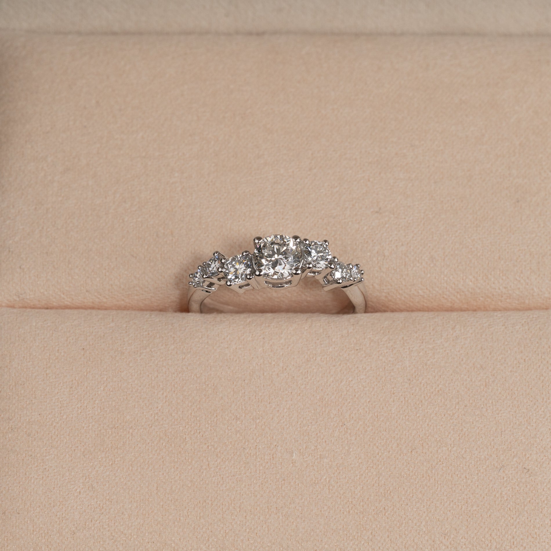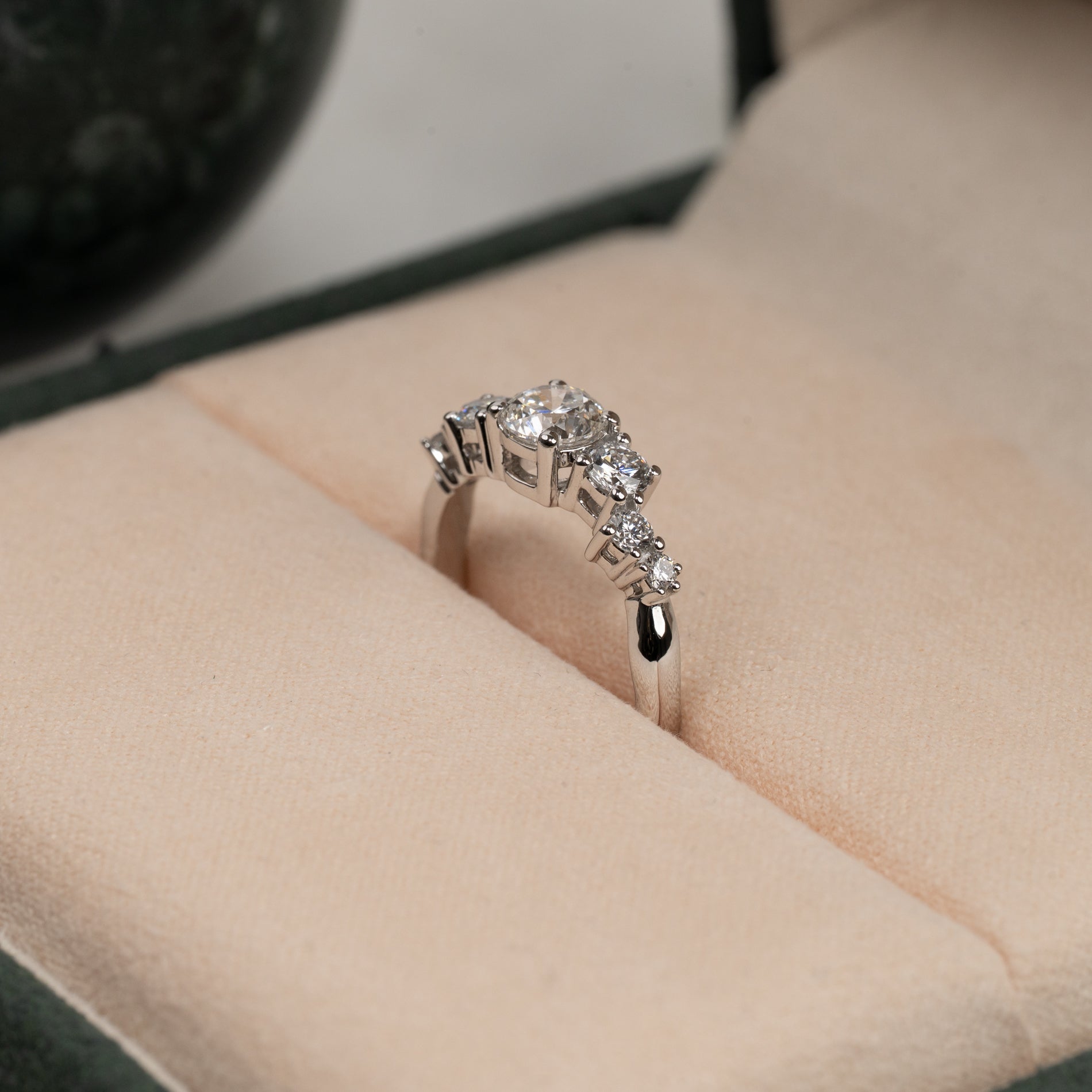 Ring i 14 karat vitguld med 0,9 ct. labbodlade diamanter i graduerande storlekar; totalt 7 stenar, varav en centersten på 0,5 ct. Infattningen är vackert och dekorativt designad, där stenarna sitter förskjutna från varandra i en avlång klunga. Själva ringskenan har en organisk design som ger en modern twist.