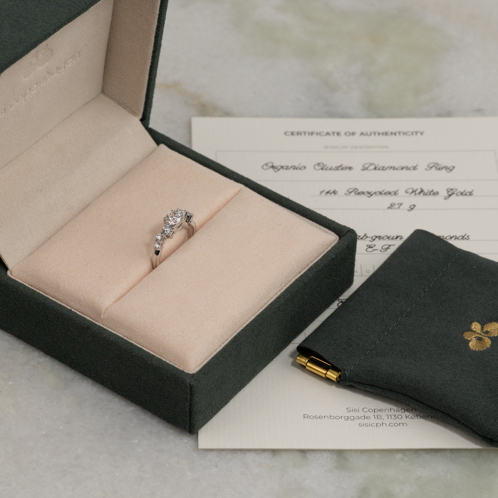 Ringen är tillverkad i 14 karat vitguld med labbodlade diamanter på totalt 0,9 ct. Diamanternas färg är E/F (River) och klarheten är VVS. Smycket är tillverkat med omtanke för miljön; diamanterna är bland annat framtagna med hjälp av solenergi, och guldet är 100 % certifierat återvunnet.