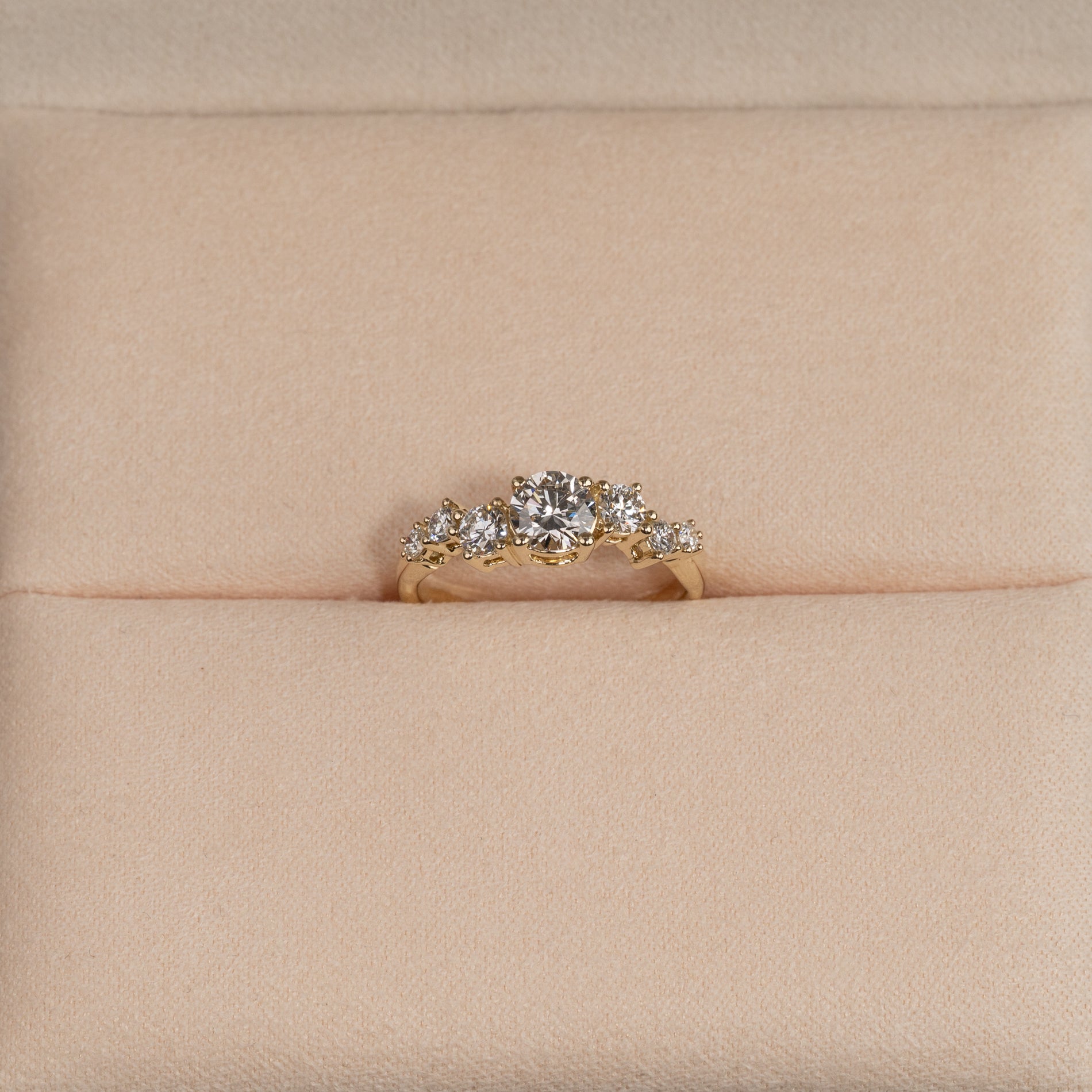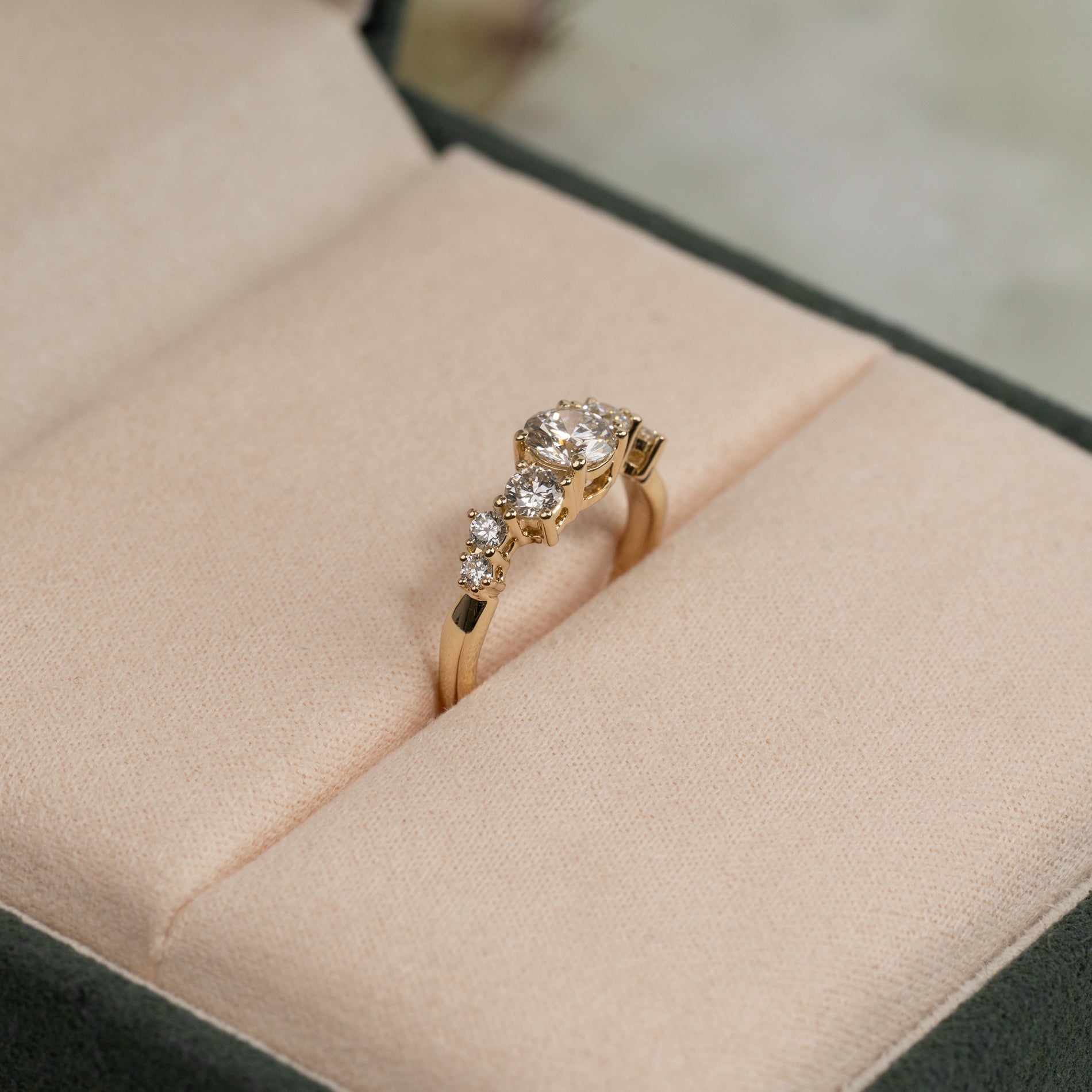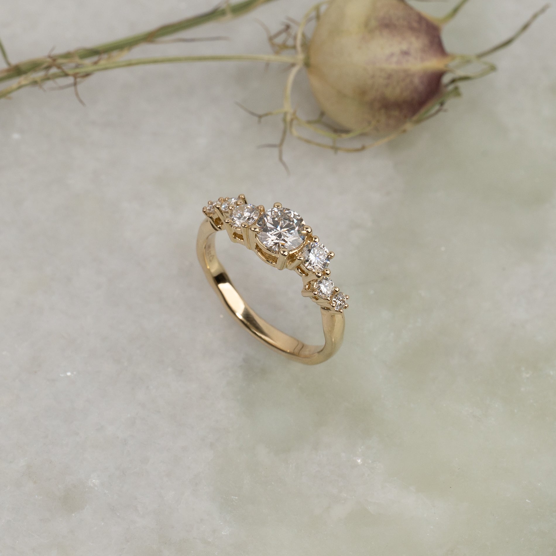 Ring i 14 karat massivt guld med 0,9 ct. labbodlade diamanter i graderade storlekar - totalt 7 stycken, varav mittstenen är på 0,5 ct. Infattningen har en vacker och dekorativ design där stenarna är placerade i en förskjuten, avlång klunga. Ringskenan har en organisk form som ger ett modernt uttryck.