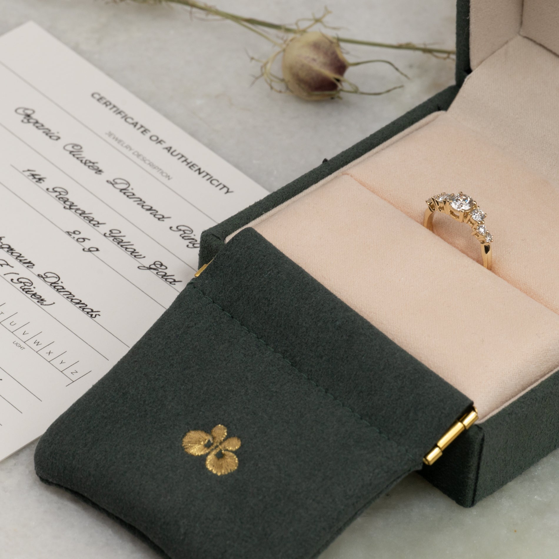 Ringen är tillverkad i 14 karat massivt guld med labbodlade diamanter på totalt 0,9 ct. Diamanterna har färggrad E/F (River) och klarheten VVS. Smycket är skapat med omtanke - diamanterna är bland annat framställda med solenergi och guldet är 100% certifierat återvunnet.