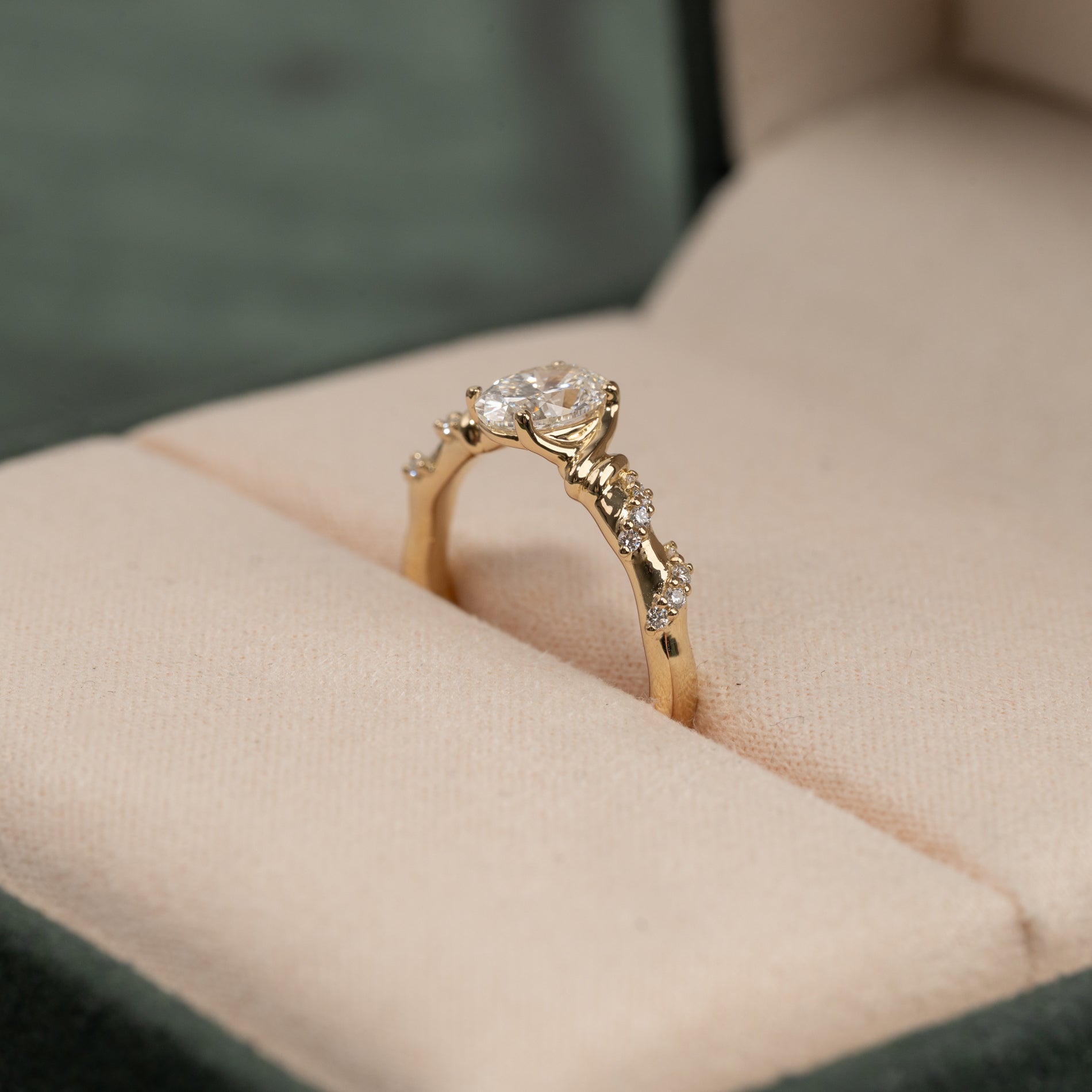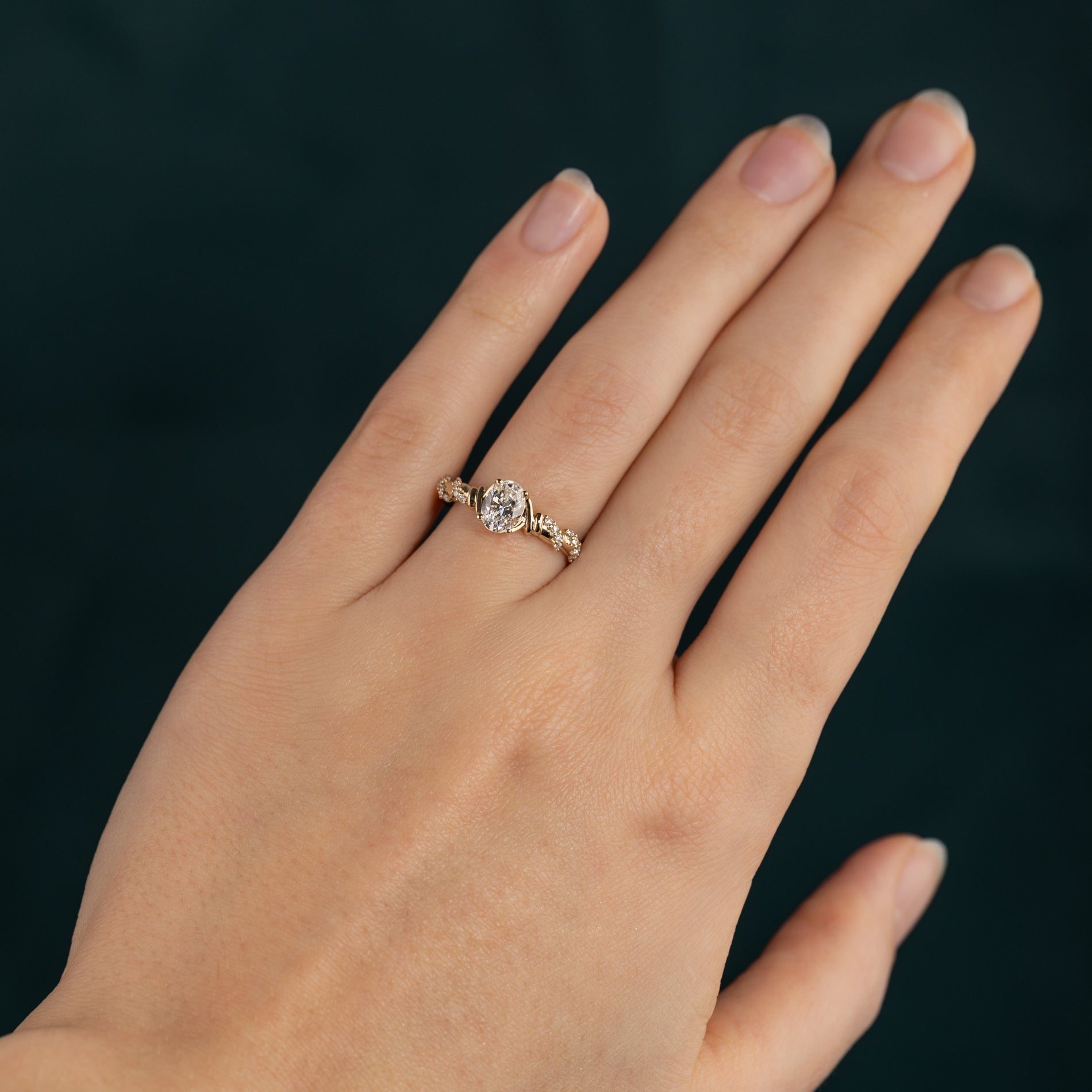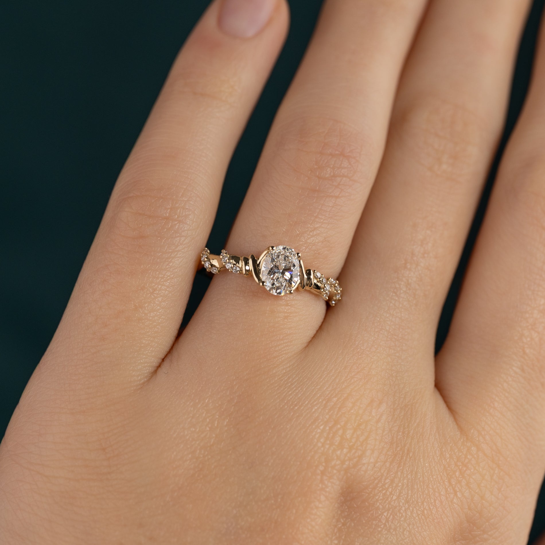 Den vackra oval-cut labbodlade centerdiamanten på 0,70 ct, och mindre diamanter som slingrar sig vackert runt ringskenan, ger ringen en total caratvikt på 0,86 ct. Diamanterna har färgen E–F (River) och klarheten VVS. Smycket är skapat med omtanke; diamanten är framställda med bland annat solenergi och guldet är 100% certifierat återvunnet.
