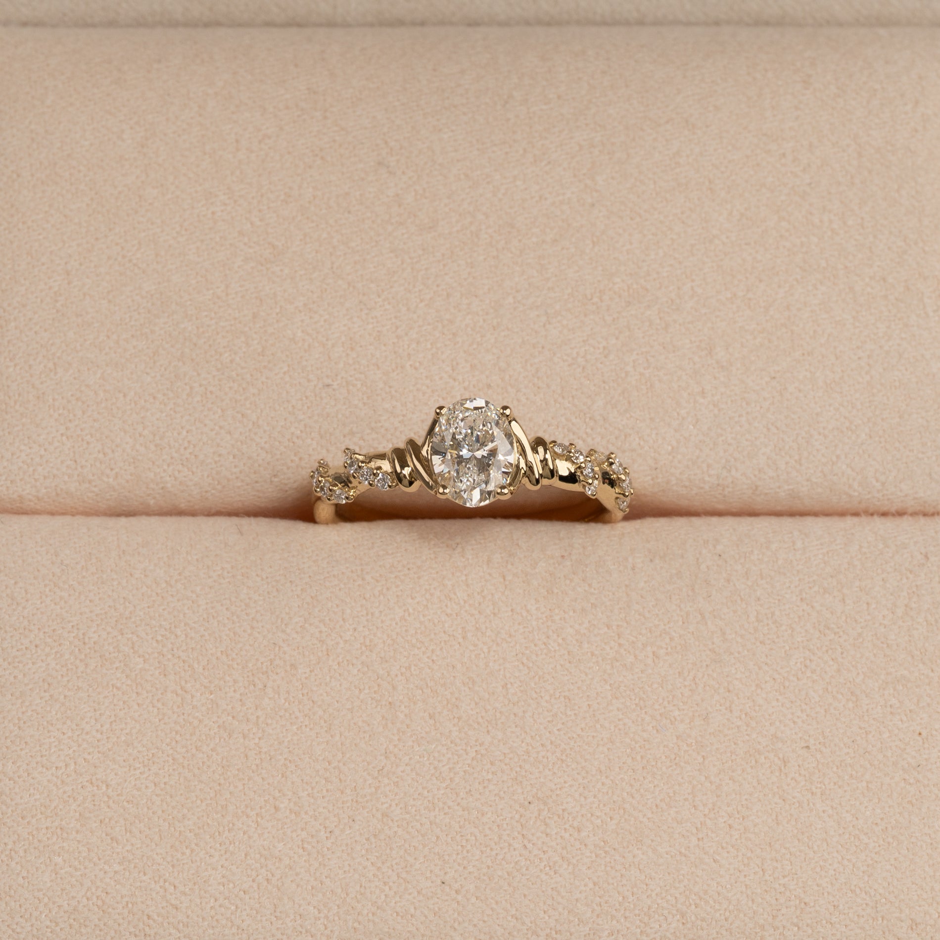 Ringen är tillverkad i 14 kt. guld och har en vacker oval-cut labbodlad centerdiamant på 0,70 ct. Tvinnade rader av mindre briljantslipade diamanter, inspirerade av naturens organiska former, ger ringen ett levande och elegant uttryck. De mjuka formerna fortsätter i fattningen och skapar en harmonisk helhet runt centerstenen.
