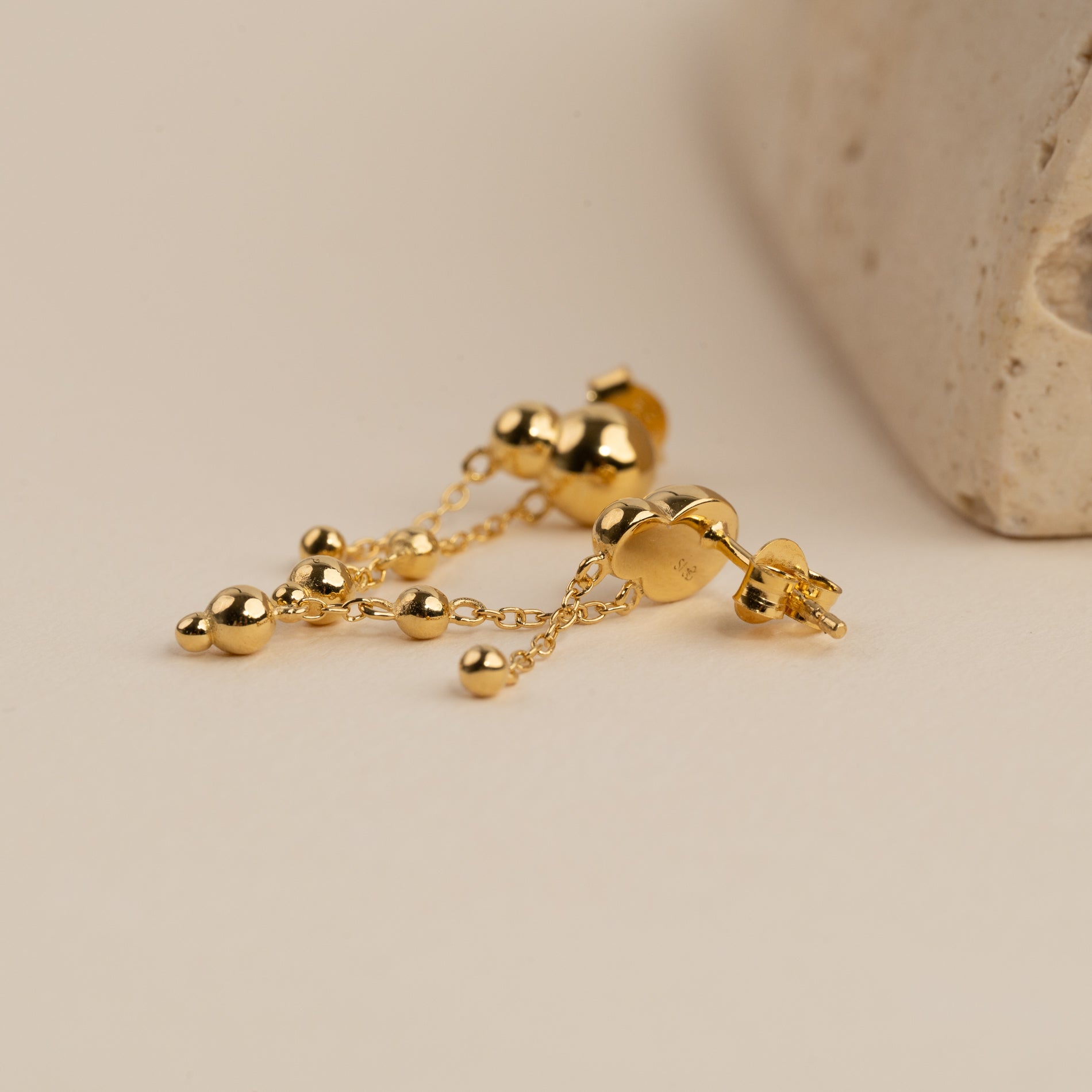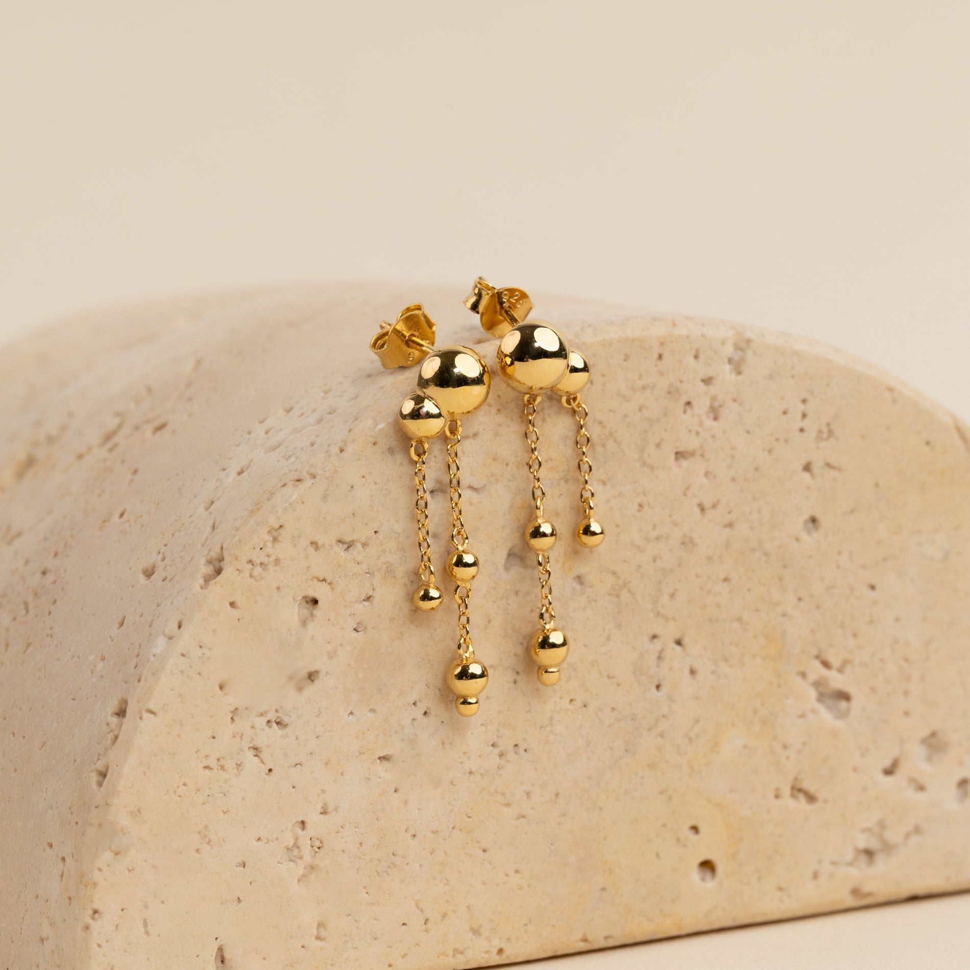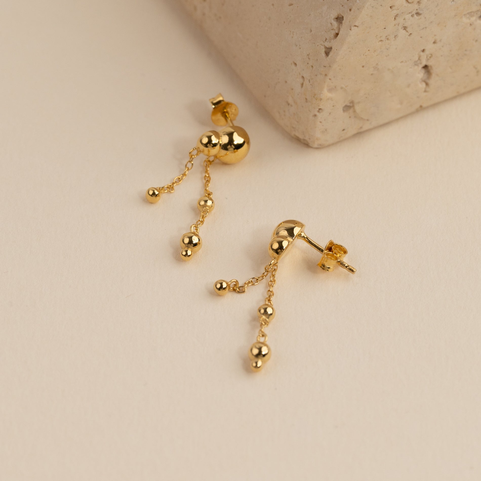 Örhängena har ett modernt och feminint uttryck, där klotformade detaljer binds samman av tunna kedjor som rör sig vackert. Den skulpturala designen ger örhängena ett unikt och iögonfallande uttryck.