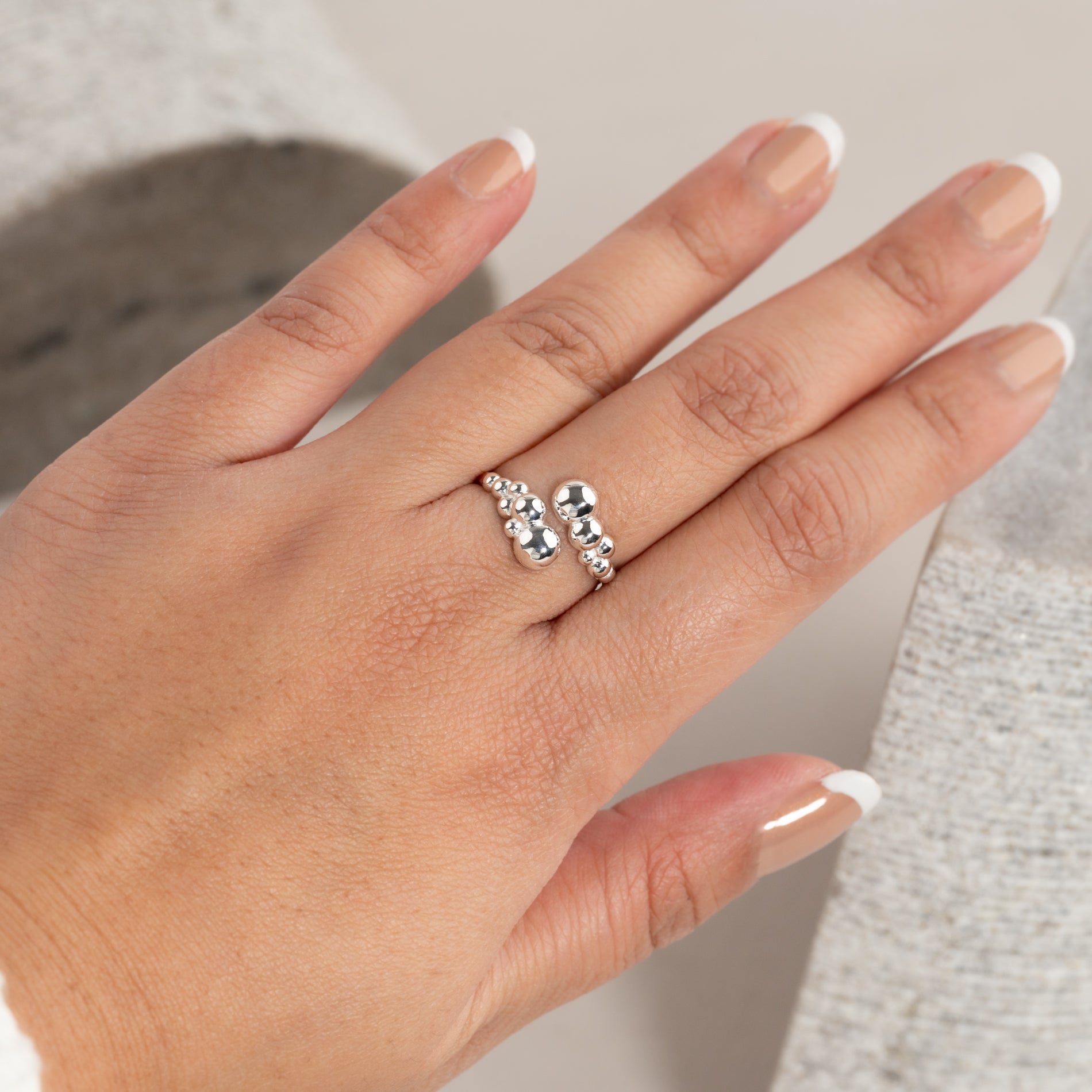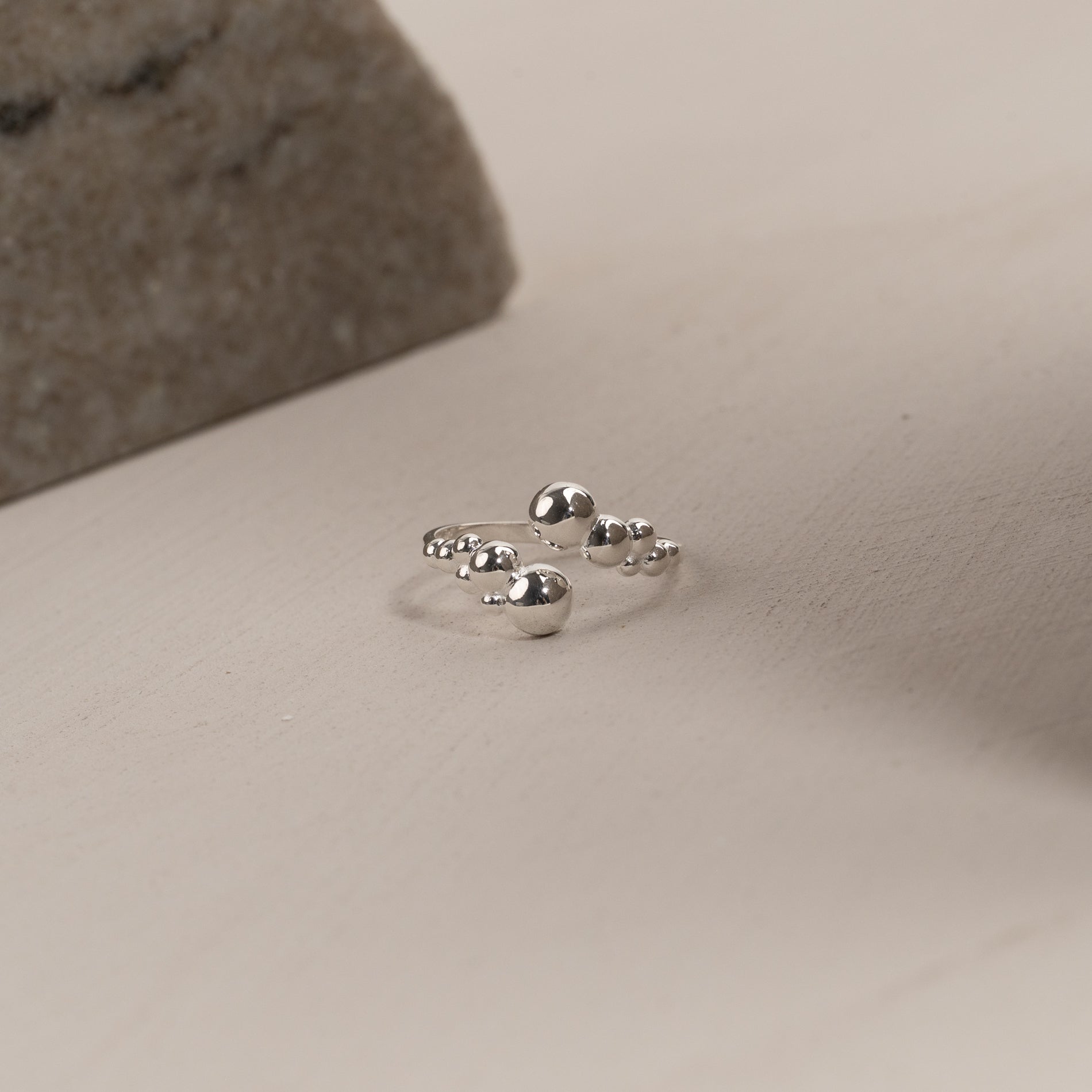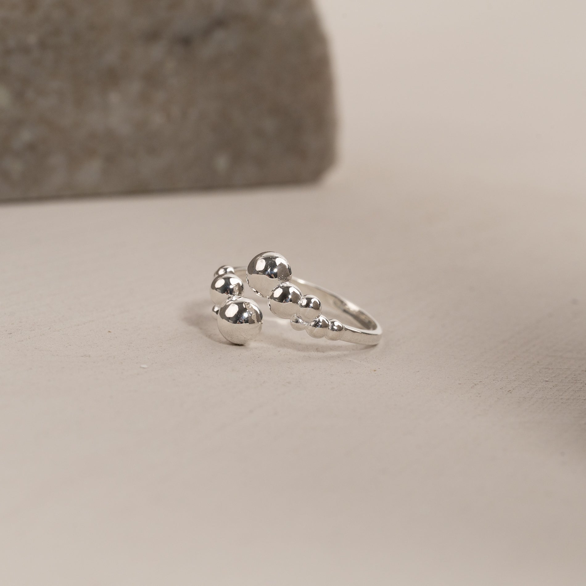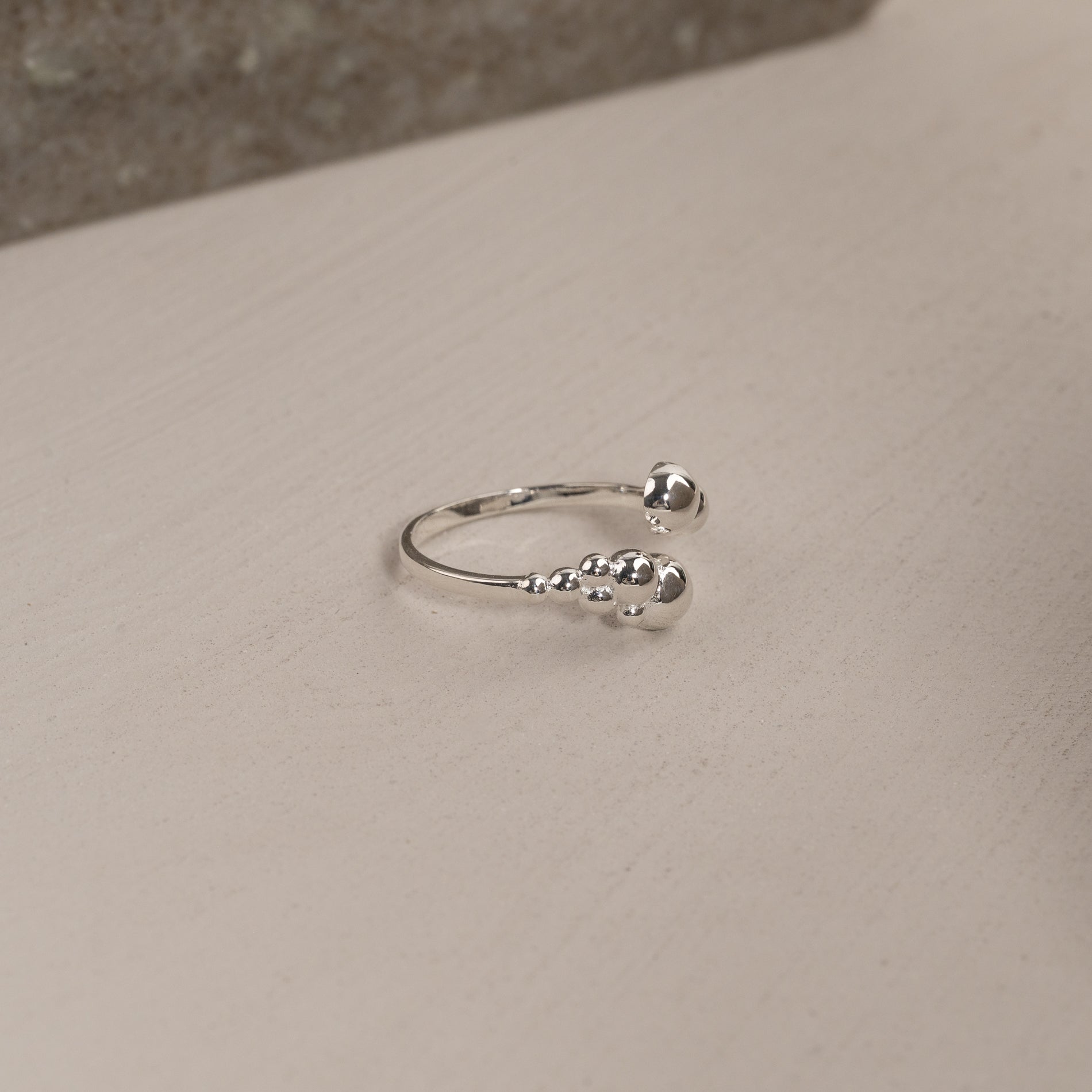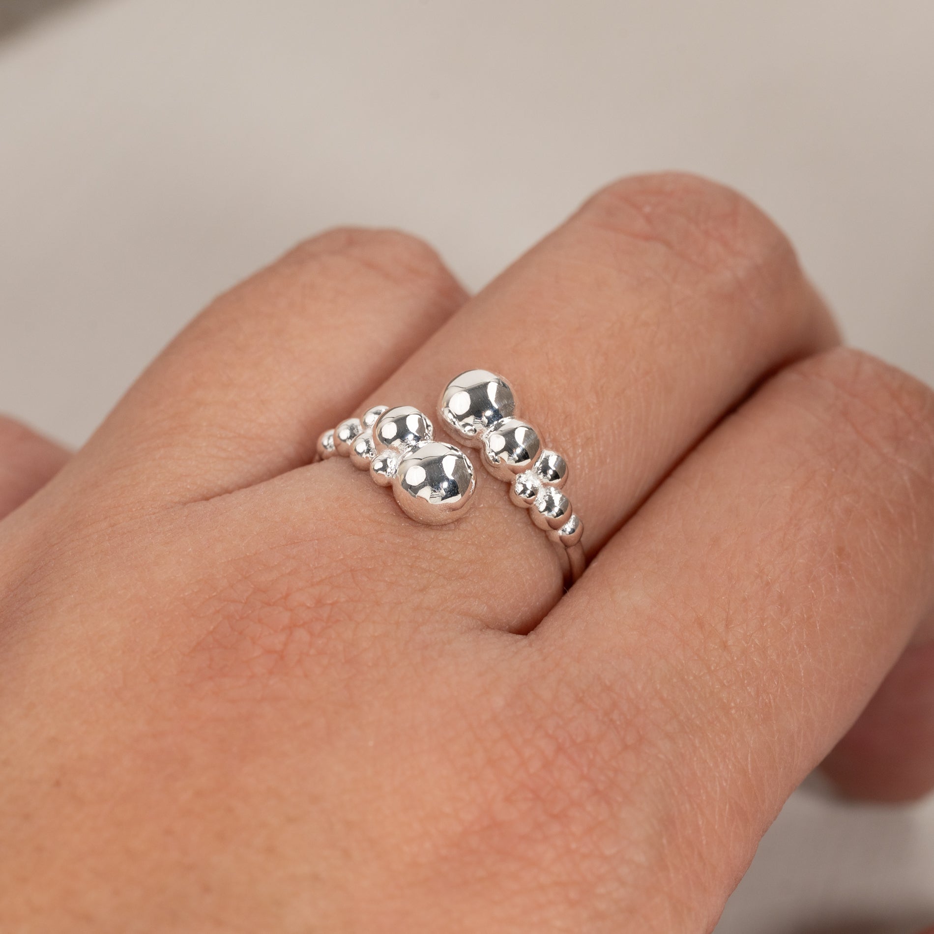 Den unika ringen har en öppen design med klot-formade detaljer i olika storlekar som skapar ett asymmetriskt uttryck. Den unika formen tillför personlighet och är perfekt som en statement-piece, oavsett om den bärs ensam eller tillsammans med andra ringar.