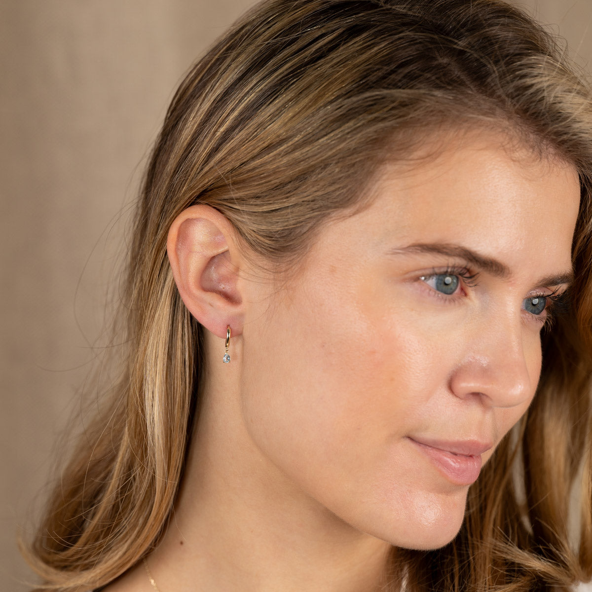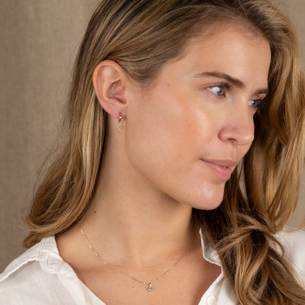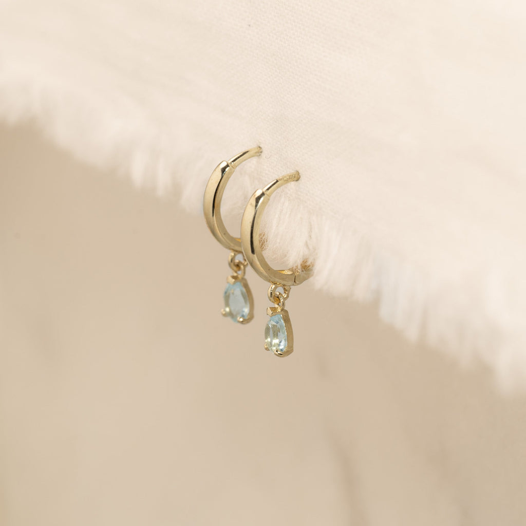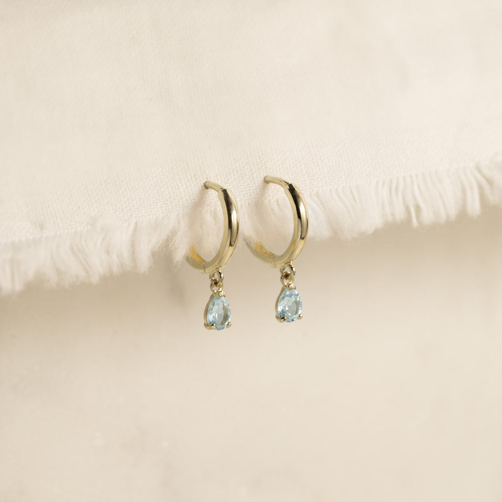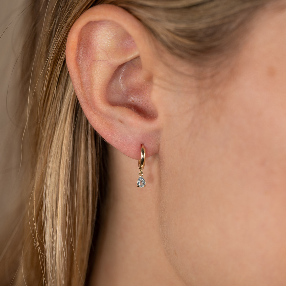 Örhängena är tillverkade i 100% återvunnet 9 karat massivt guld, med hängen besatta med en blå topas. De fina örhängena är en tidlös klassiker som passar väl till både vardags och fest, och som kan bäras ensamma eller tillsammans med flera öronsmycken.