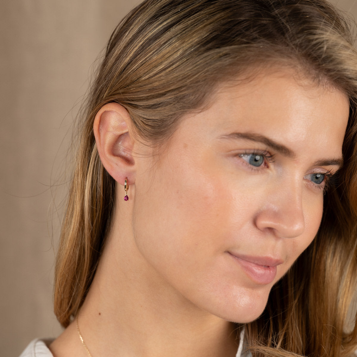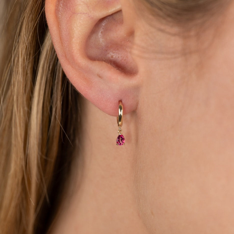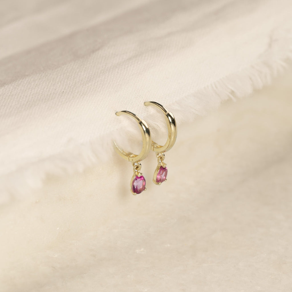 Örhängena är tillverkade i 100% återvunnet 9 karat massivt guld, med hängen besatta med en rosa topas. De fina örhängena är en tidlös klassiker som passar väl till både vardags och fest, och som kan bäras ensamma eller tillsammans med flera öronsmycken.
