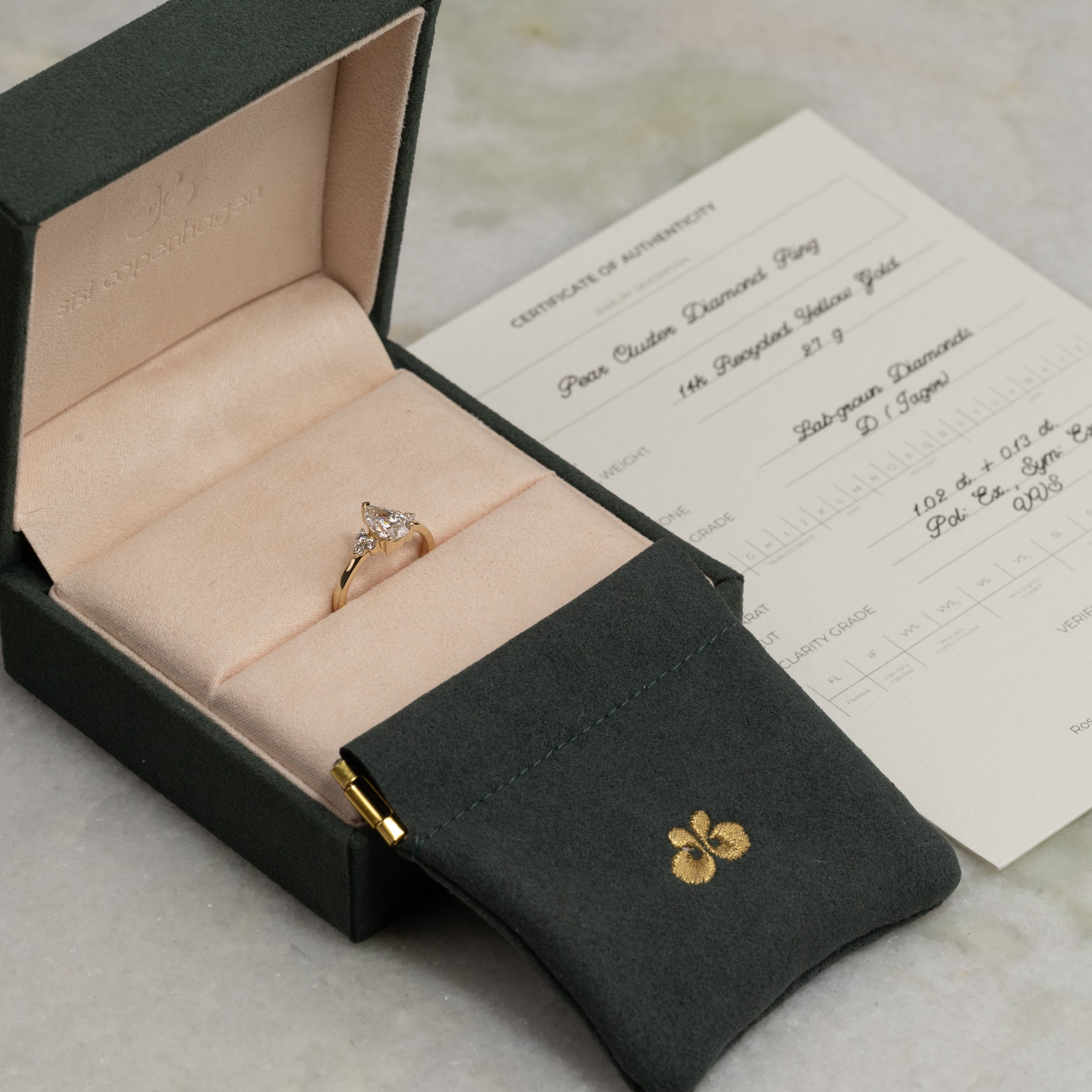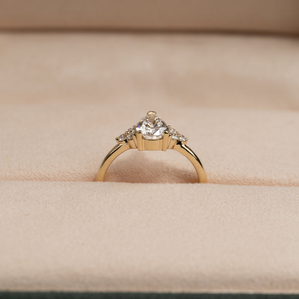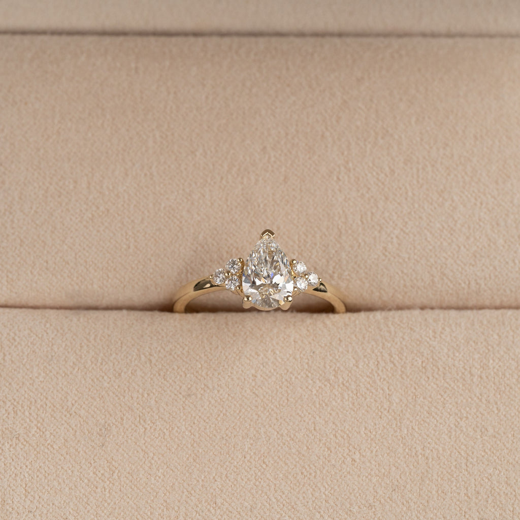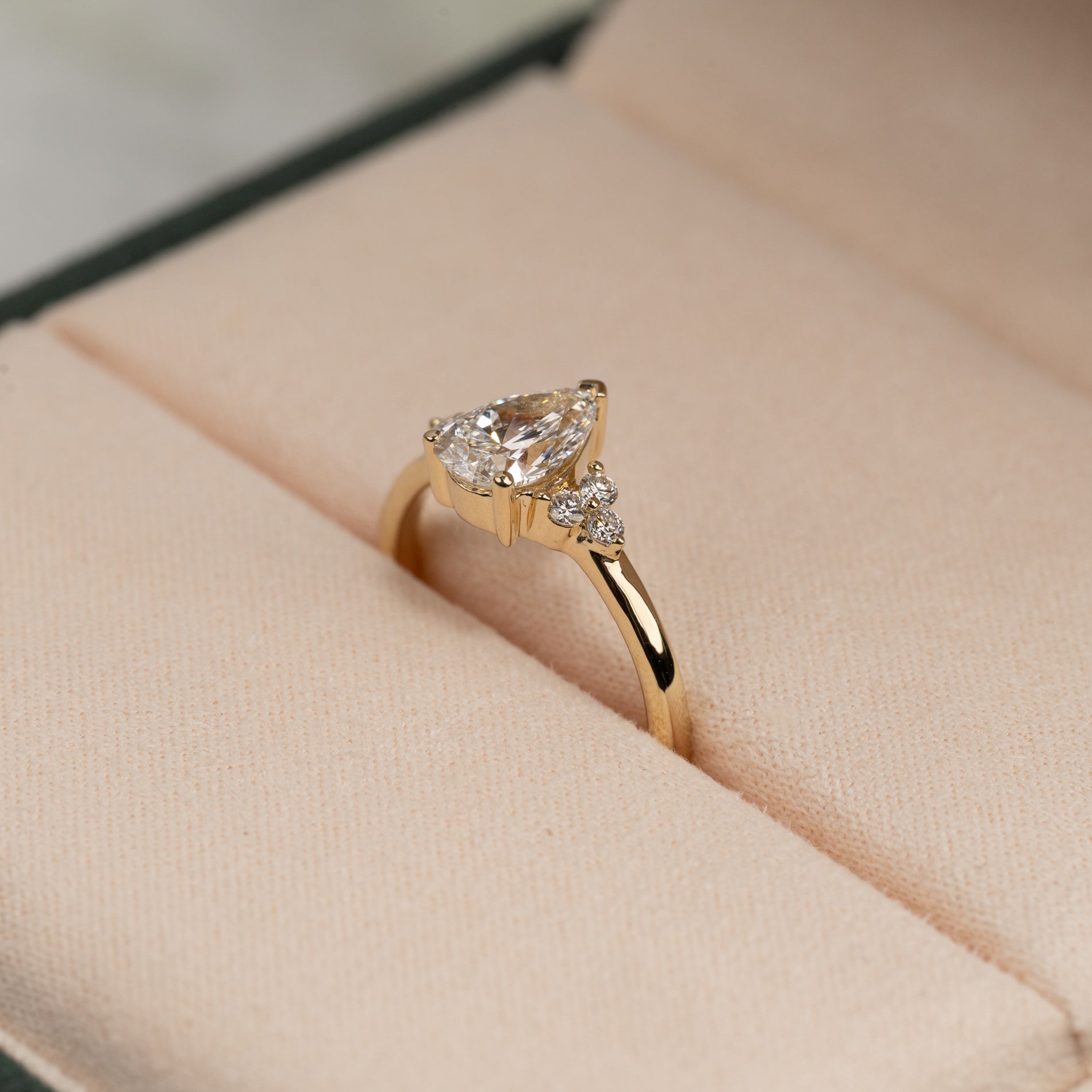 Ring i 14 kt. guld med ett unikt och detaljerat uttryck. I mitten sitter en vacker 1,0 ct labbodlad pear-cut diamant, som framhävs vackert av tre mindre diamanter på vardera sida. Tillsammans ger de ringen en total caratvikt på 1,15 ct.