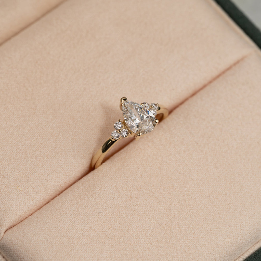 Pear-cut diamantring med en 1,0 ct. labbodlad diamant och eleganta sidostenar